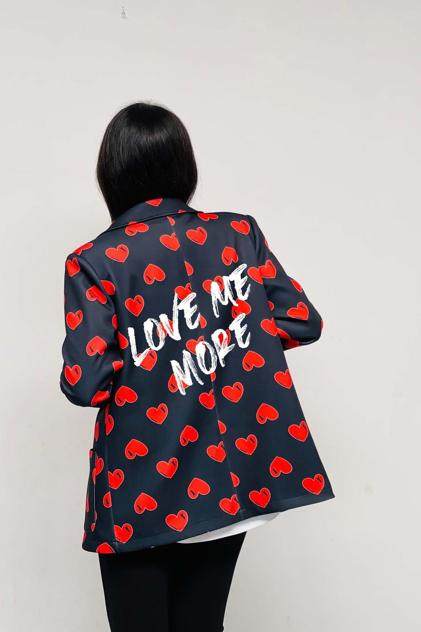 Blazer con solapa, con bolsillos de plastrón, forrada y manga larga. Confeccionada en tejido estampado en tonos base negra y corazones rojos. Estampación trasera que dice Love Me More. Hecho en Vigo.