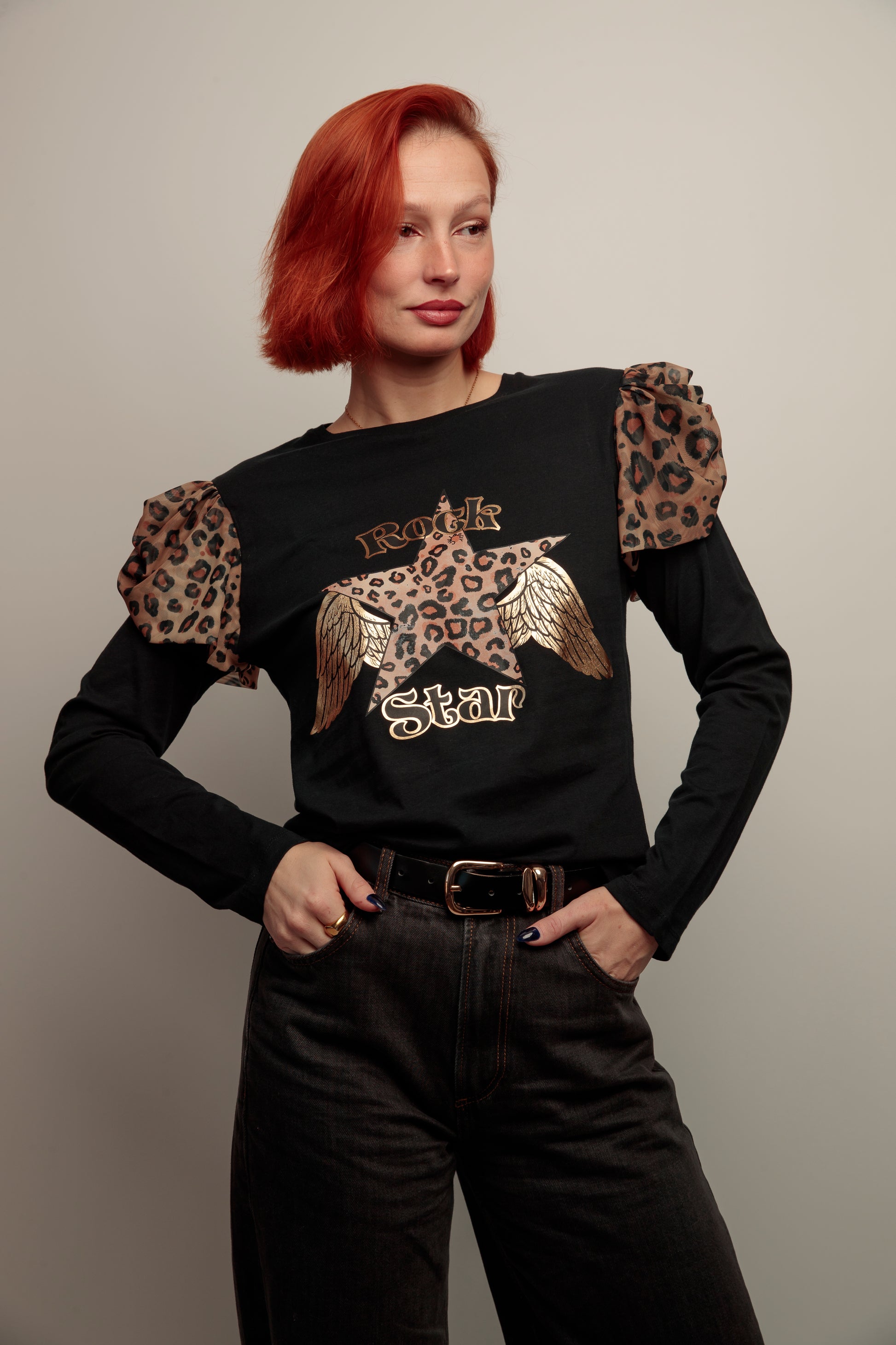Camiseta de algodón en color negro, con cuello redondo, corte entallado. Detalle de manga larga con superposición de tul en estampado animal print en el hombro. Estampación frontal.