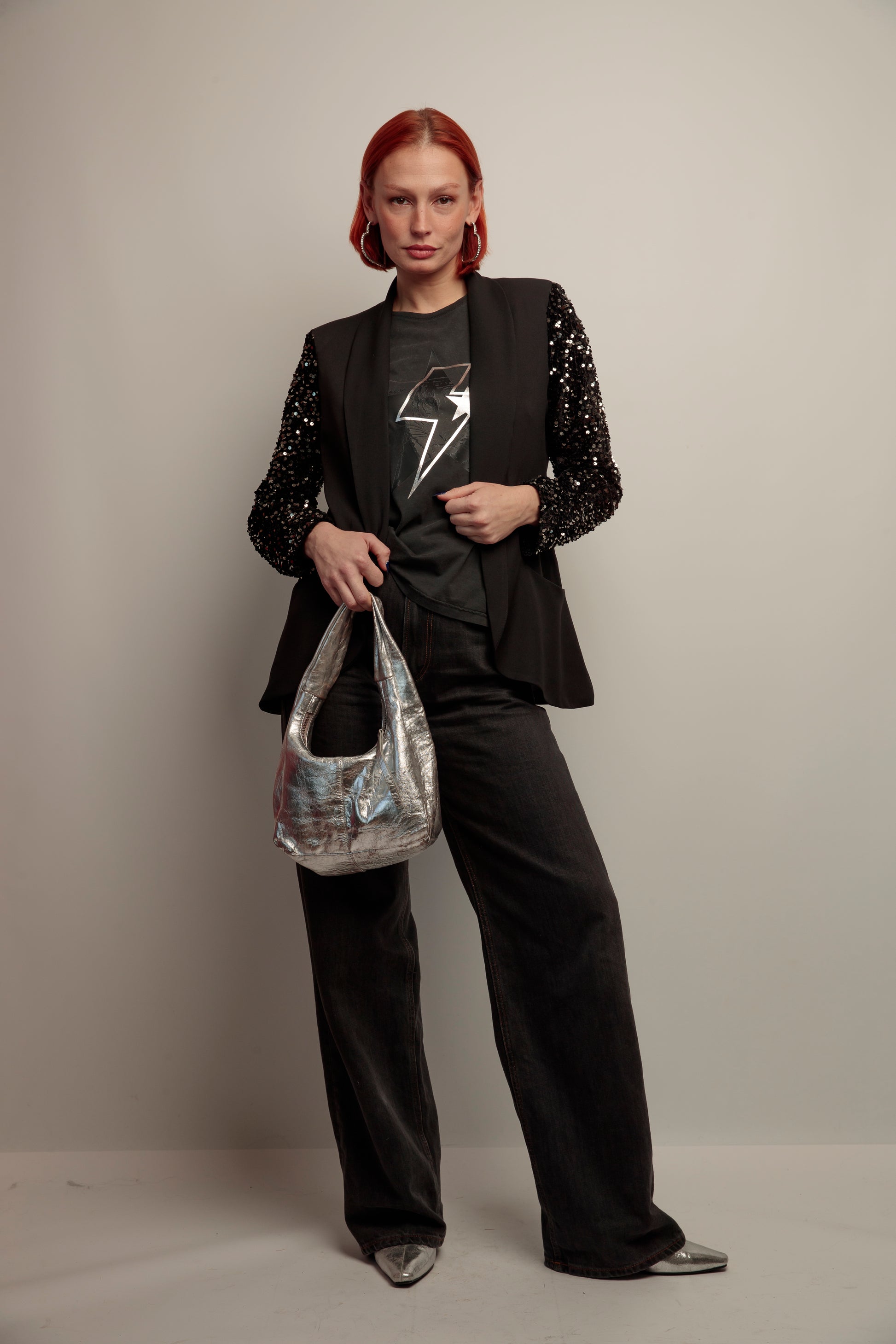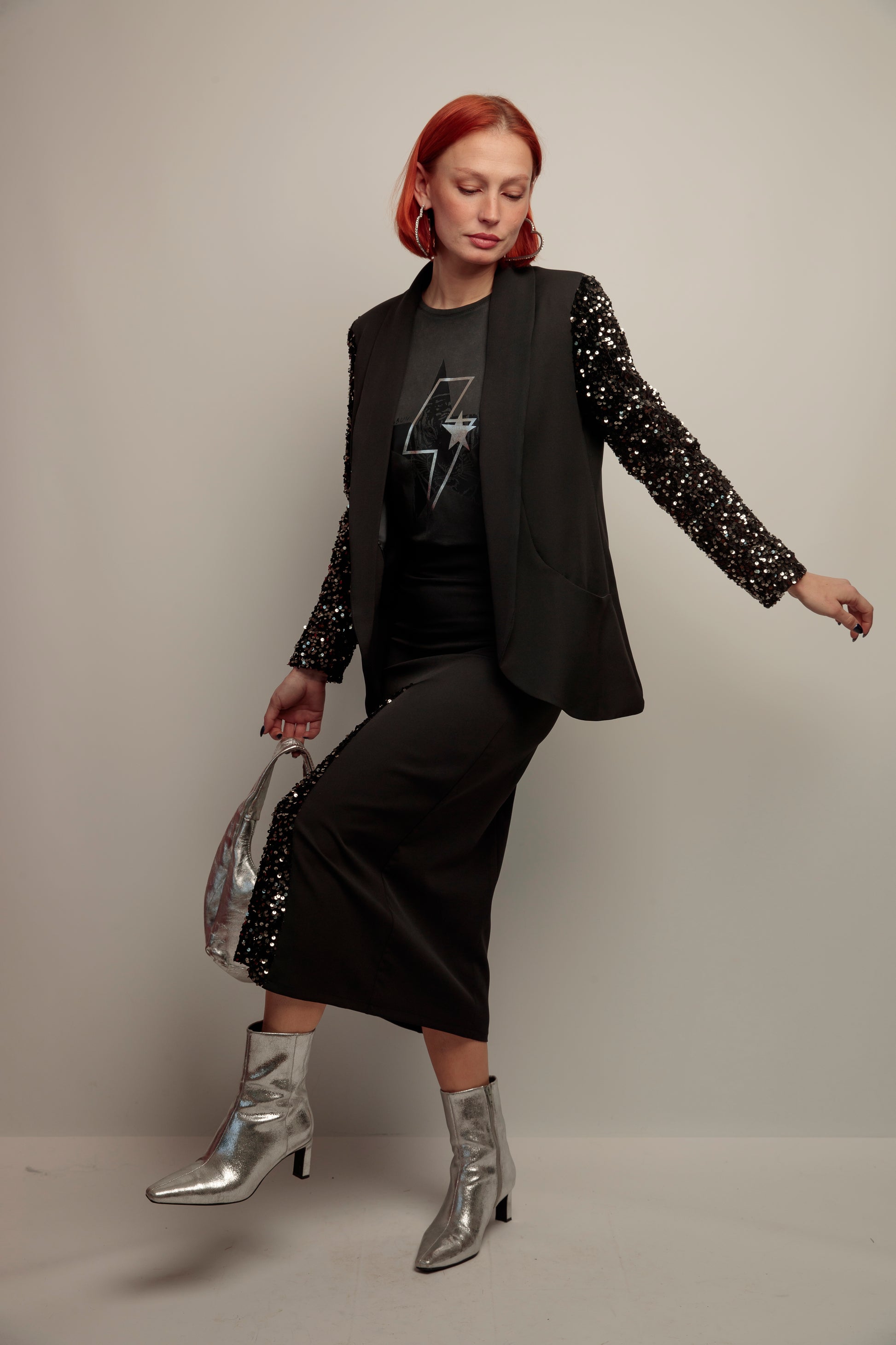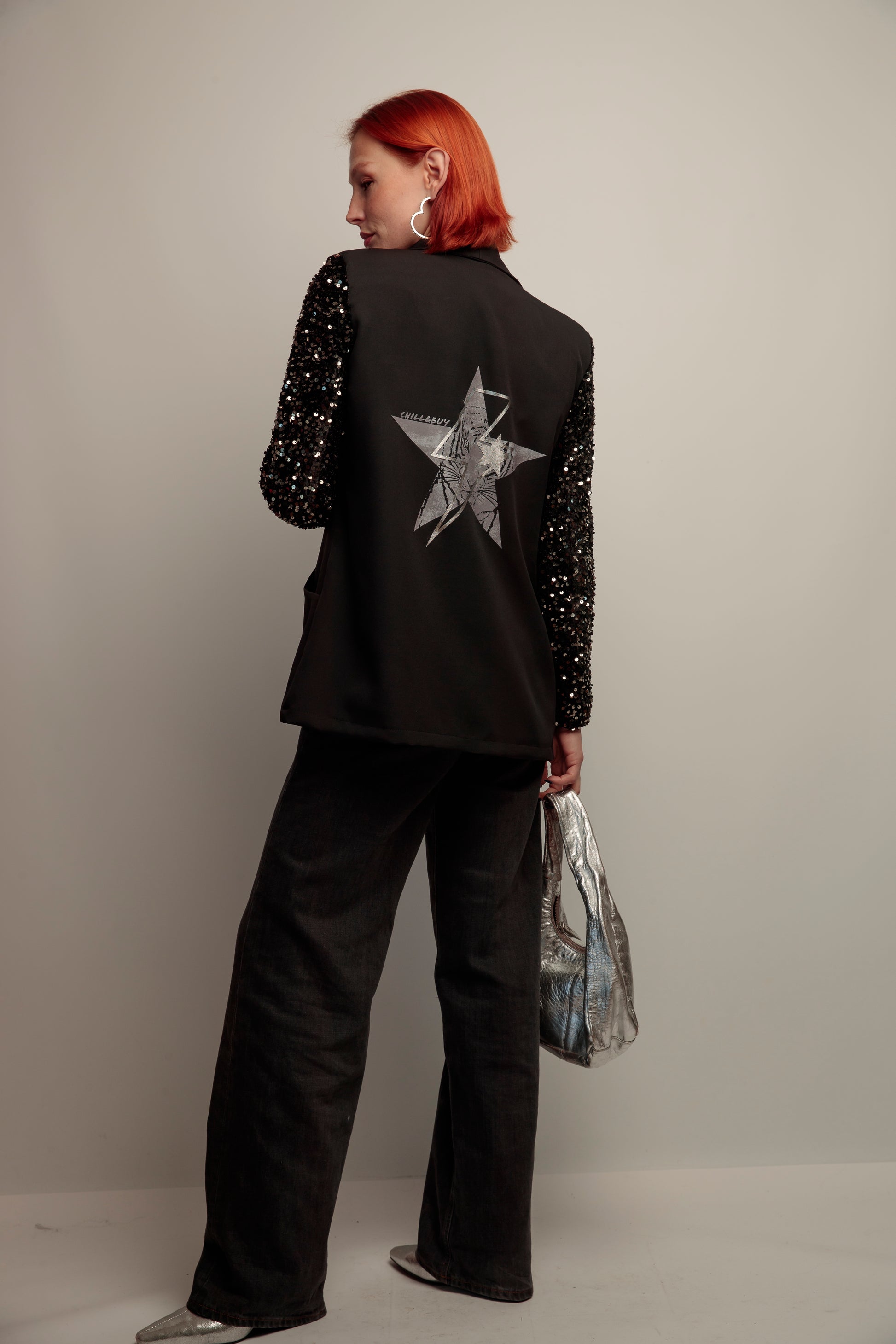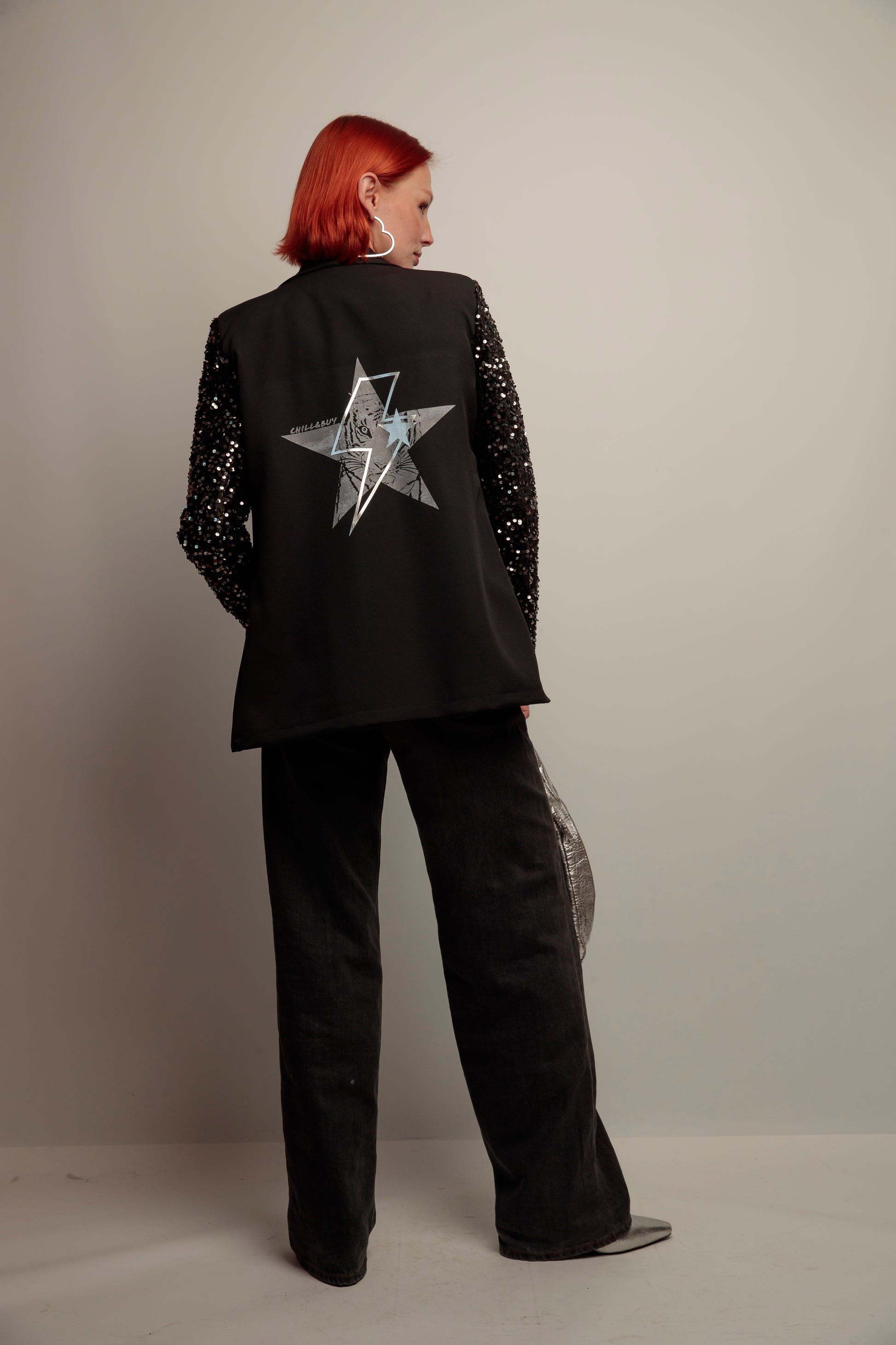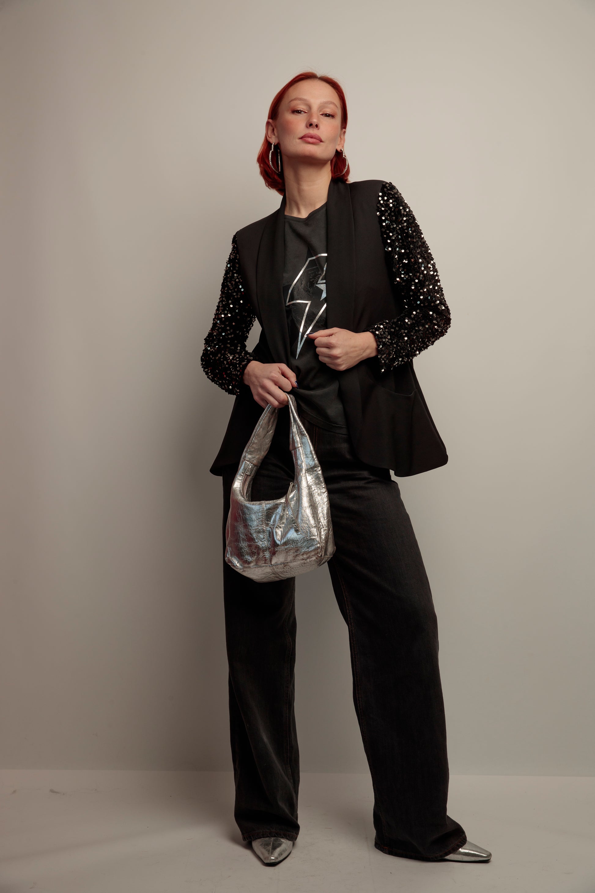 Blazer de cuello con solapa corte smoking. Manga larga abullonada lentejuelas . Bolsillos delanteros. Forrada. Diseño trasero con detalles plateados.