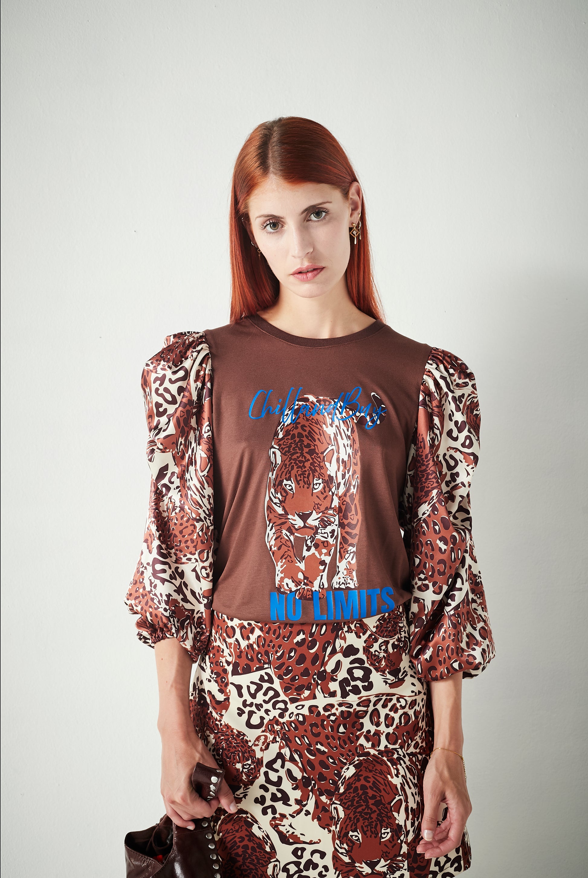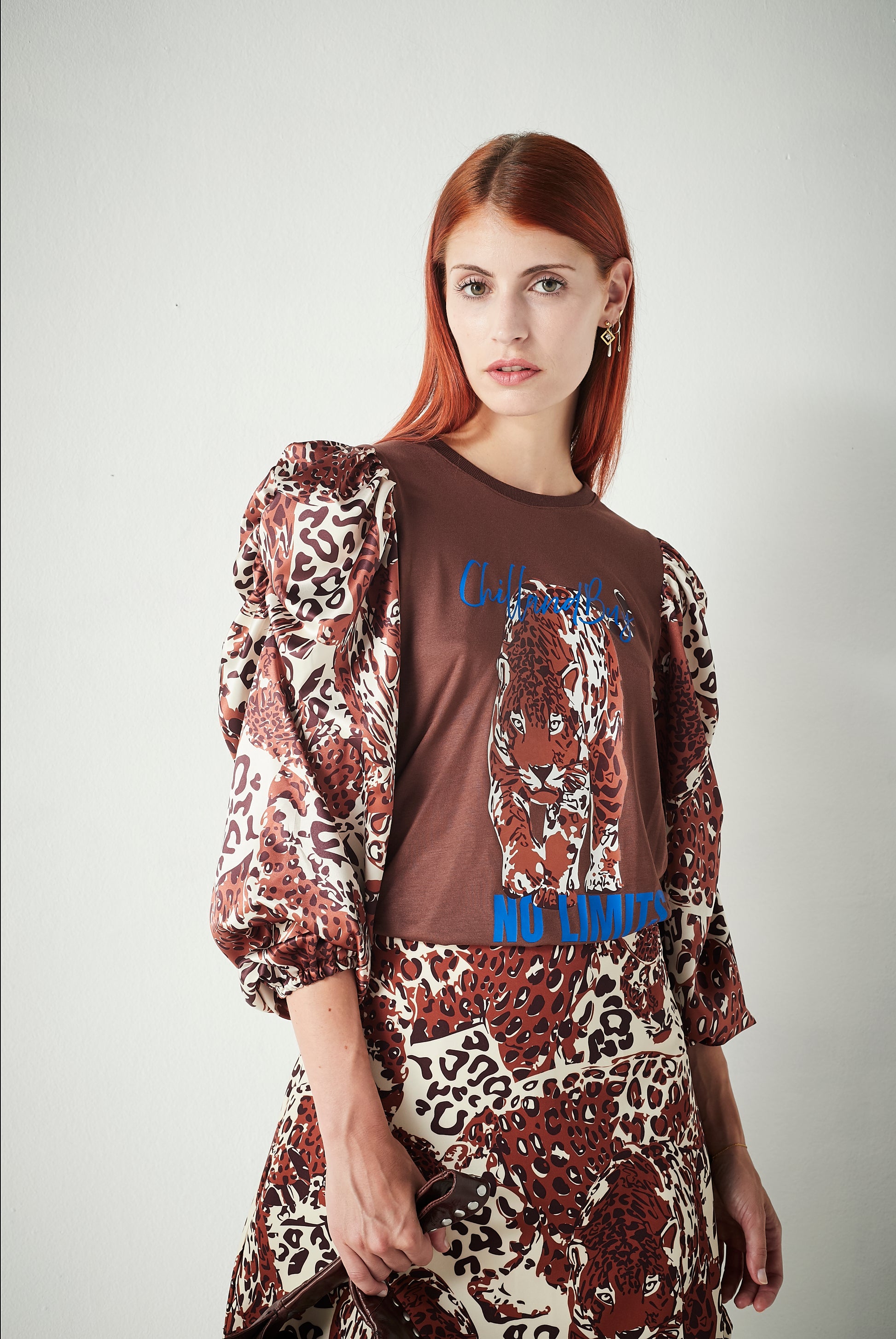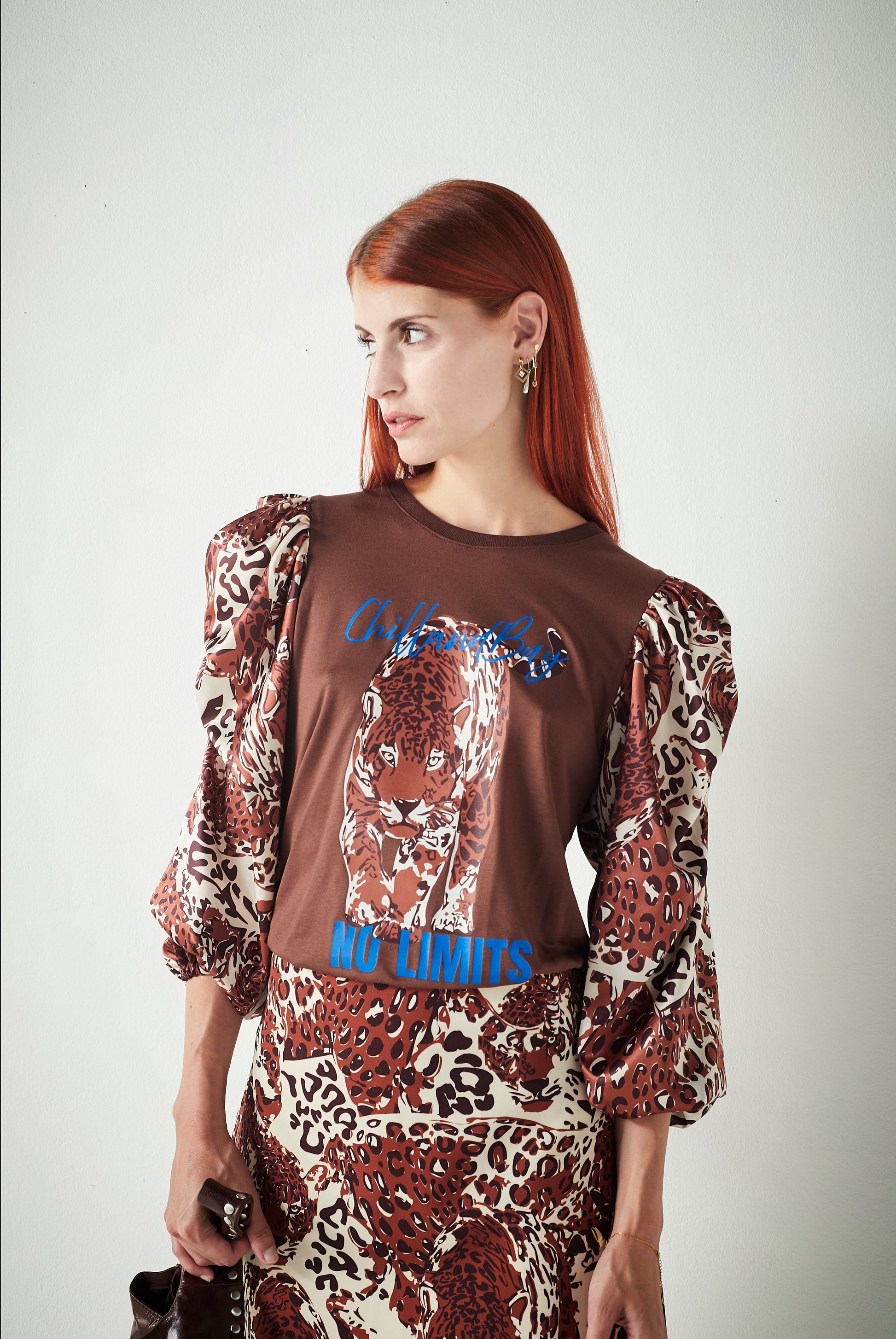 Camiseta de algodón en color marrón con corte recto y cuello redondo, diseñada con mangas llamativas que elevan su estilo.