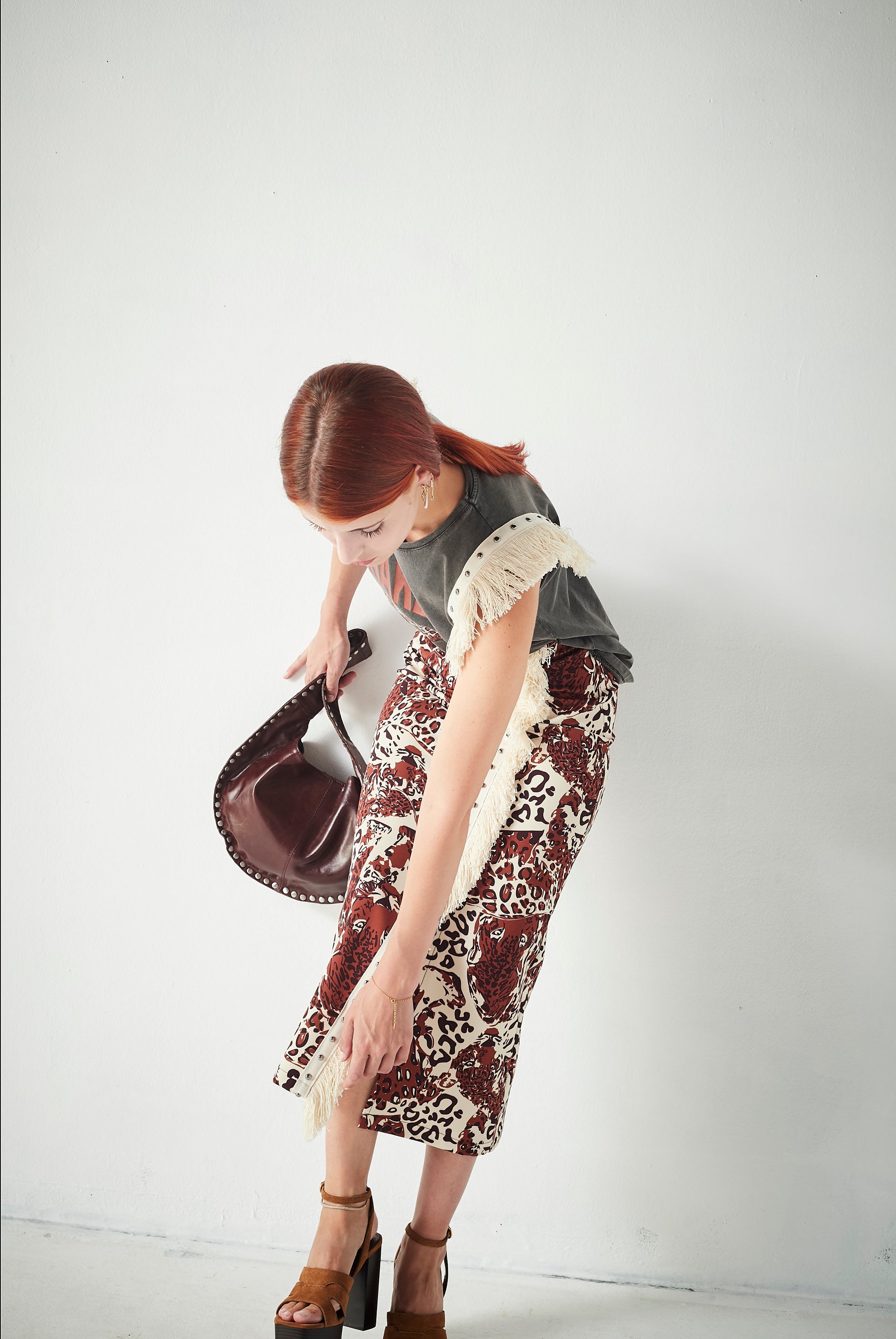 - Detalle de flecos en color beige en la sisa, rematados con tira de tachuelas metálicas en color plata.
