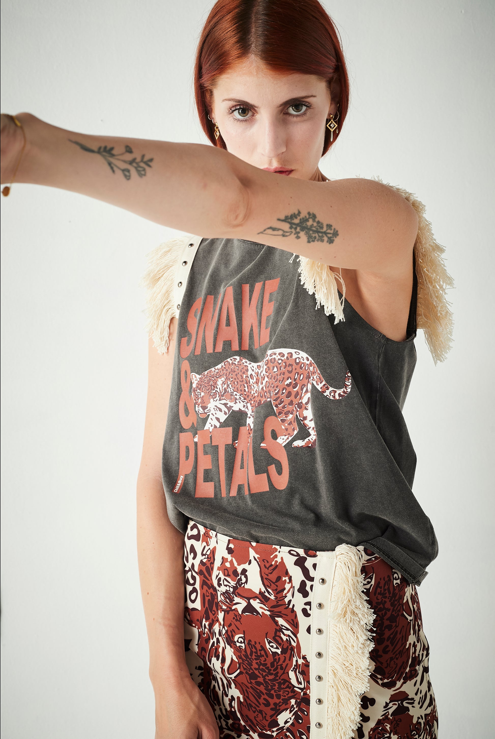 Camiseta de algodón lavado con corte evasé y bajo asimétrico, diseñada con detalles originales que la convierten en una prenda única.