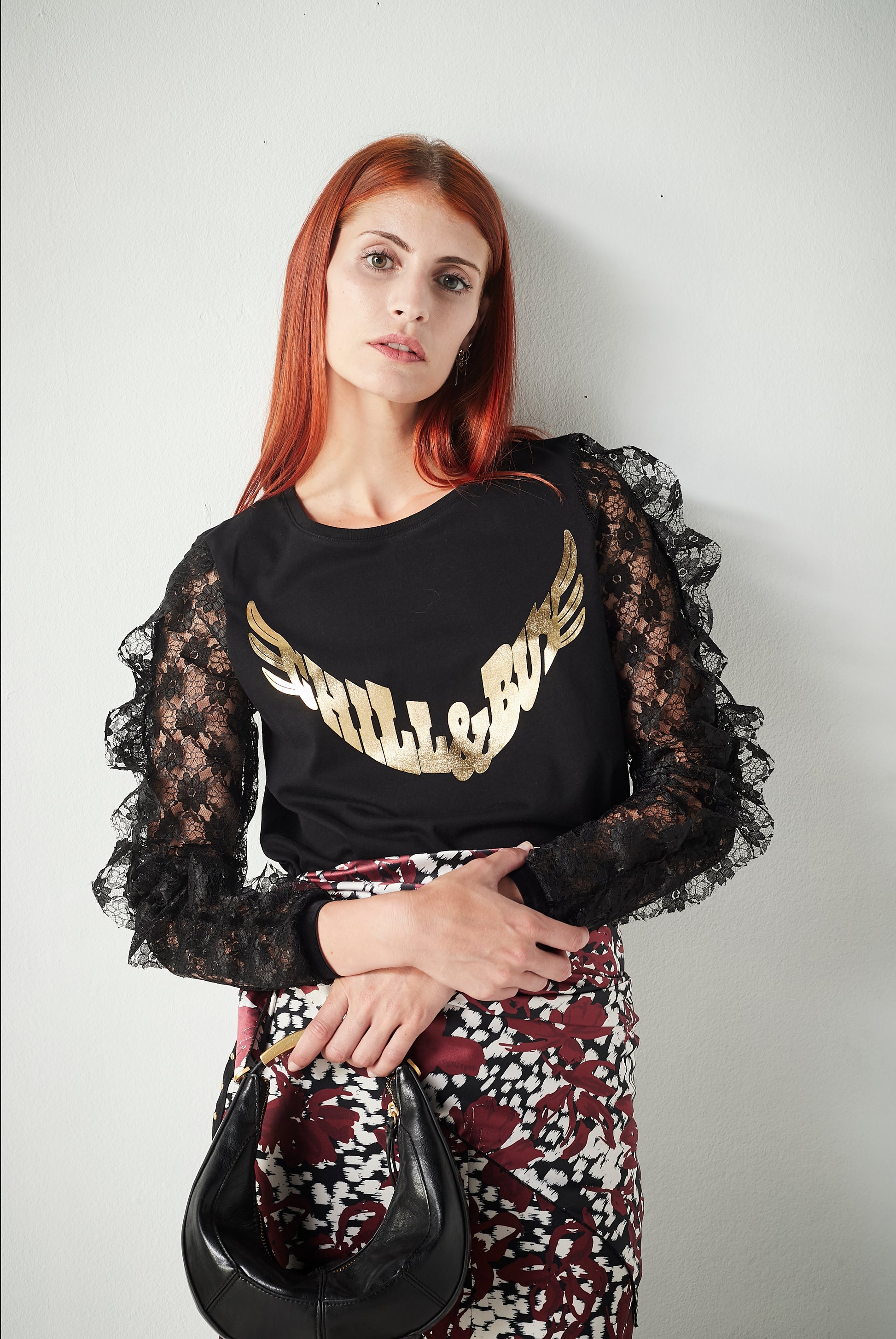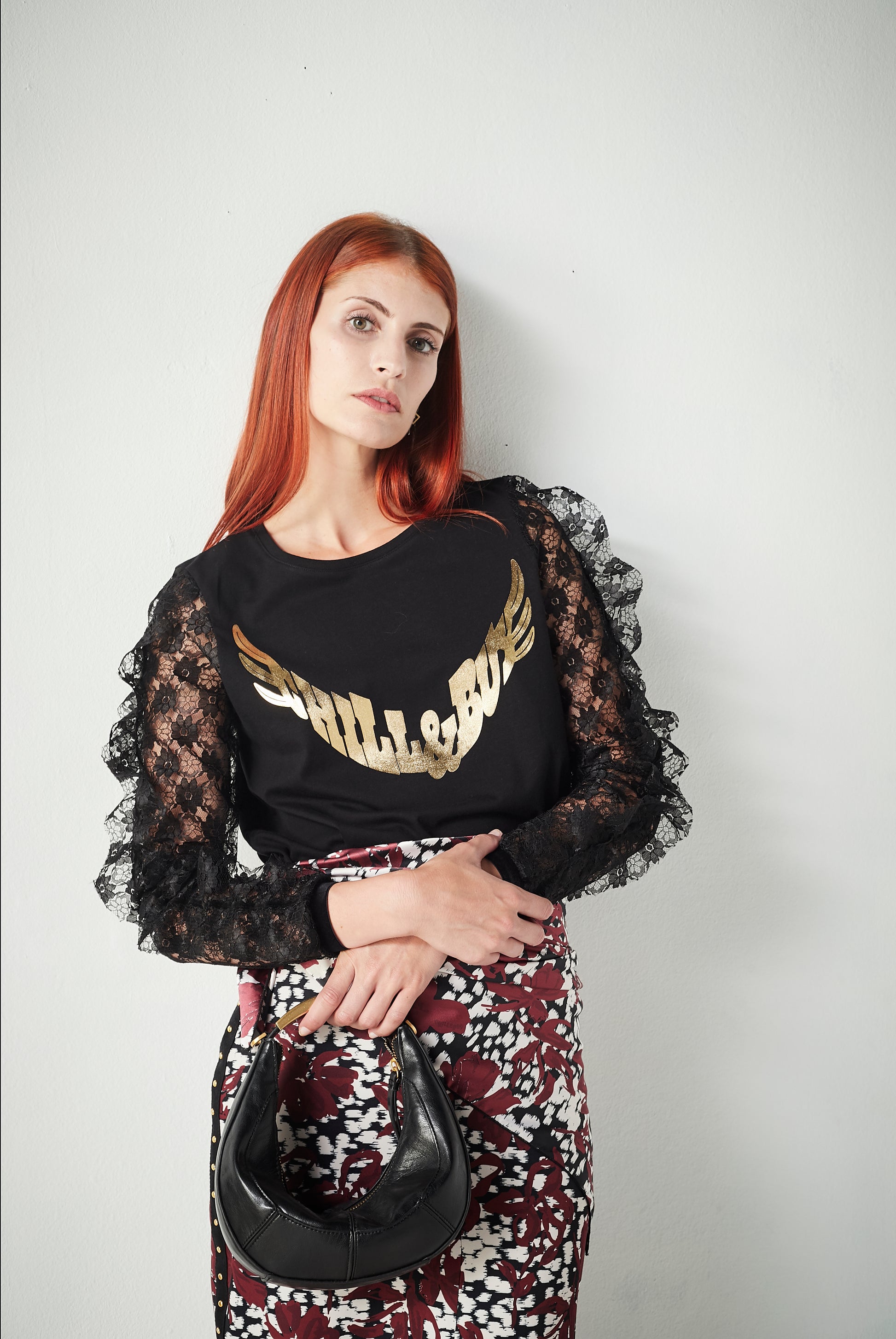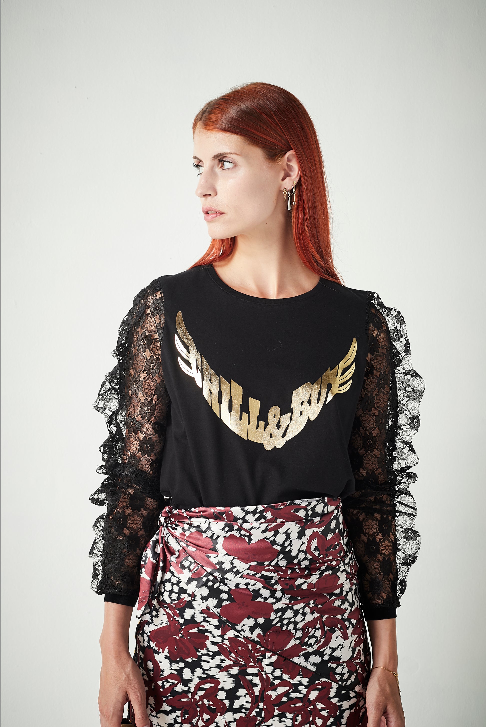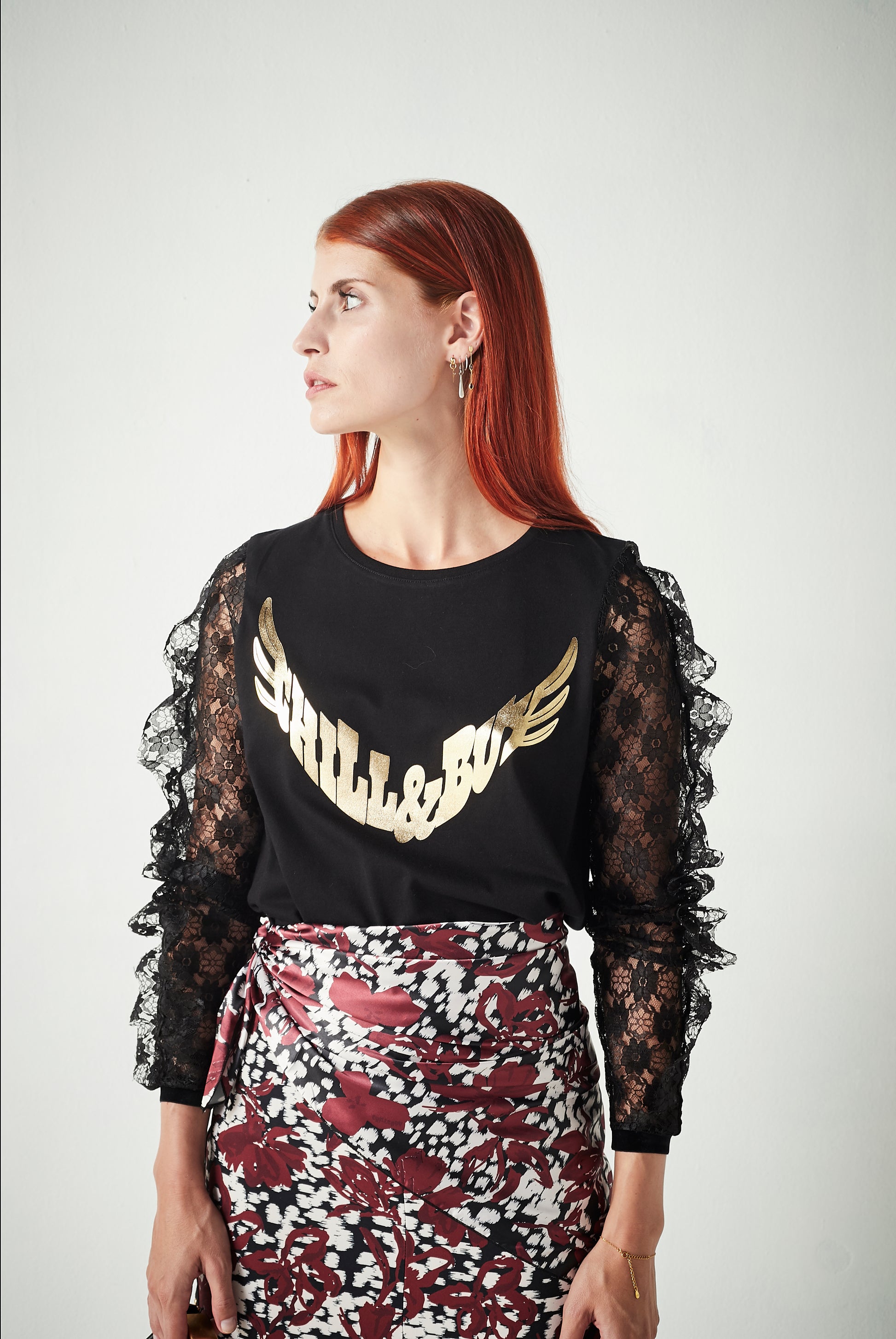 Manga larga de encaje con volante lateral a tono, que añade un toque elegante.