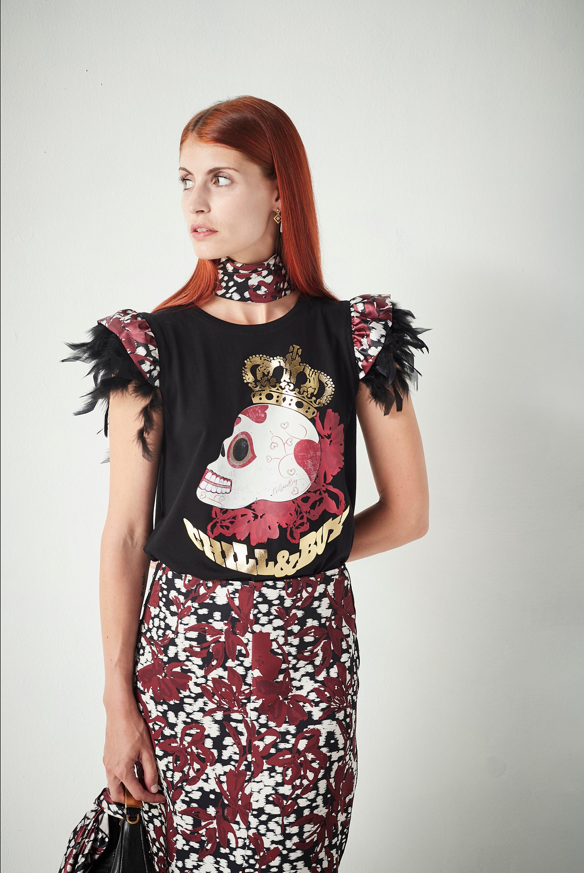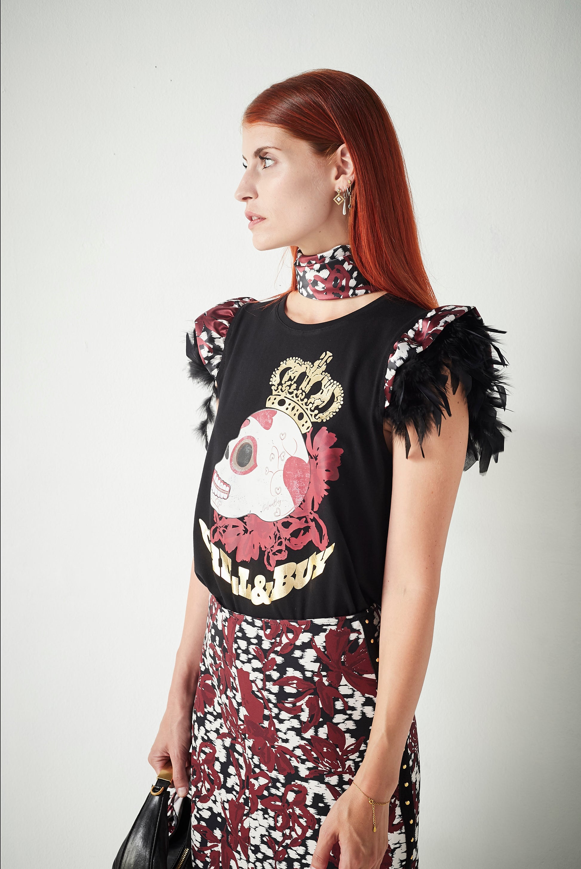 - Detalle de minivolante estampado en la sisa con plumas negras, que añade un acabado exclusivo.