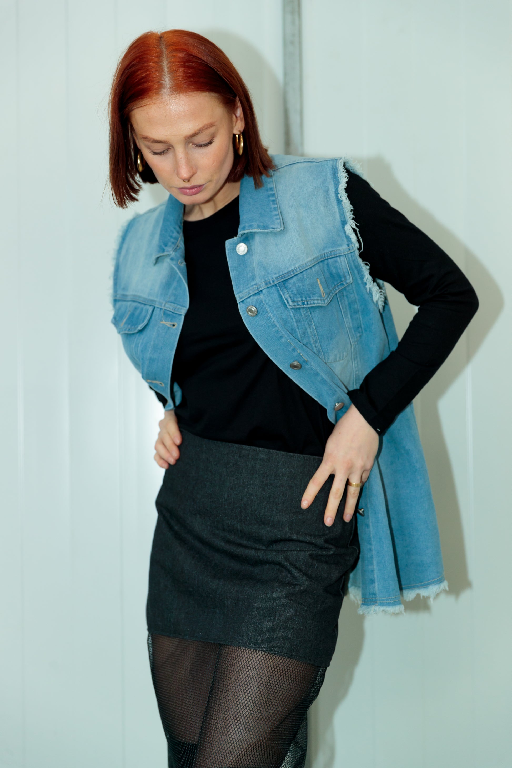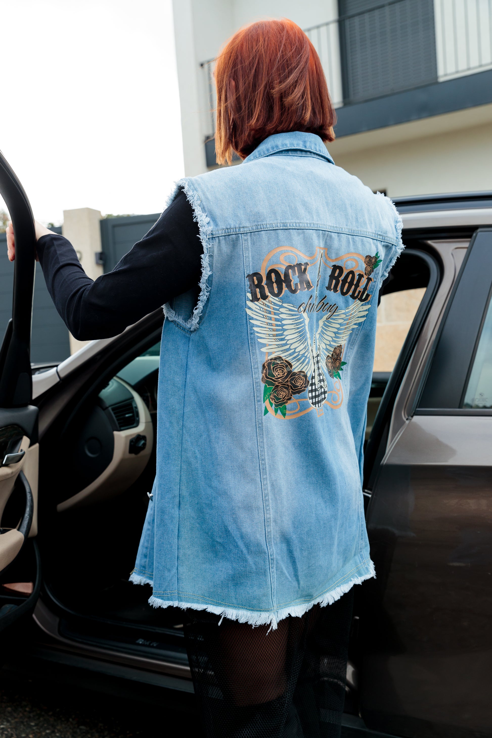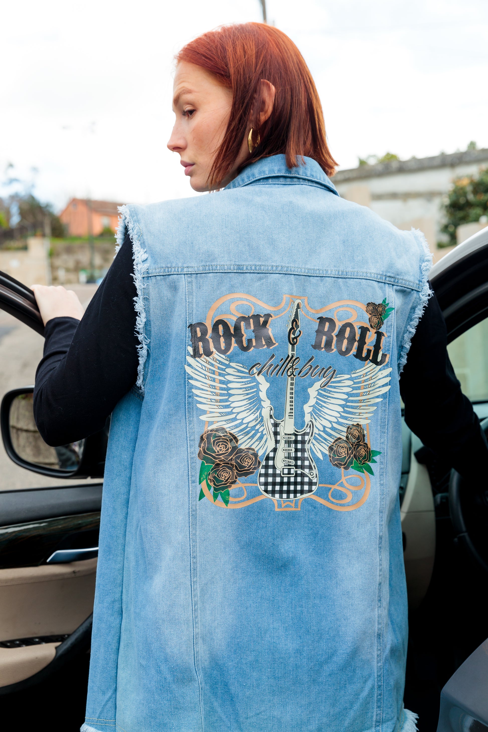 Chaleco en tejido denim azul claro desgastado con cuello solapa, largo desflecado en bajo y en la sisas. Cierre delantero con botones metálicos. Estampación trasera.
