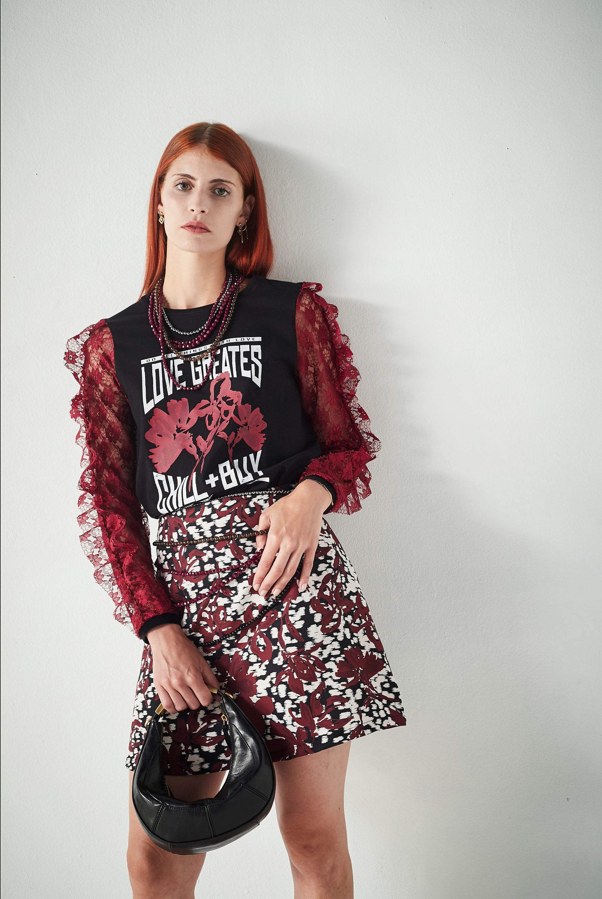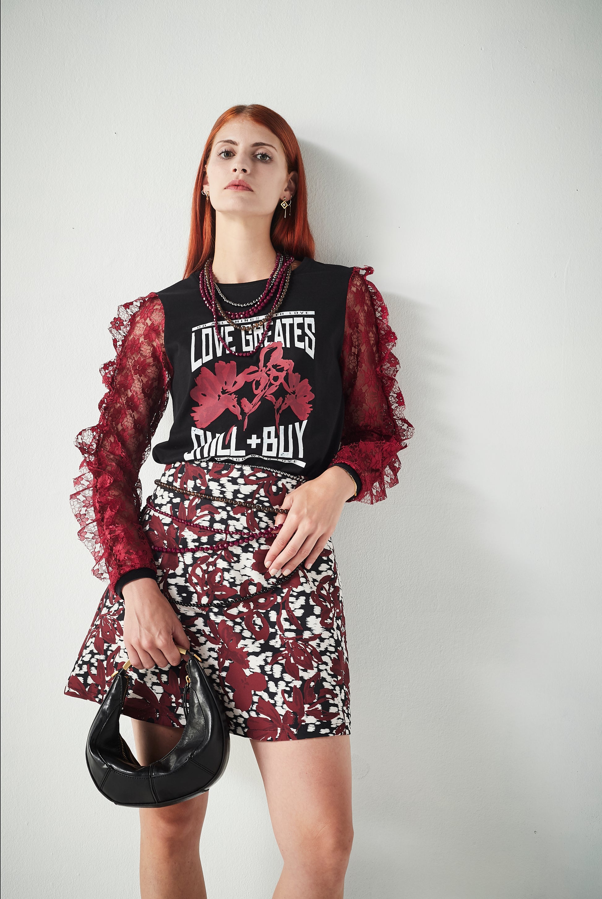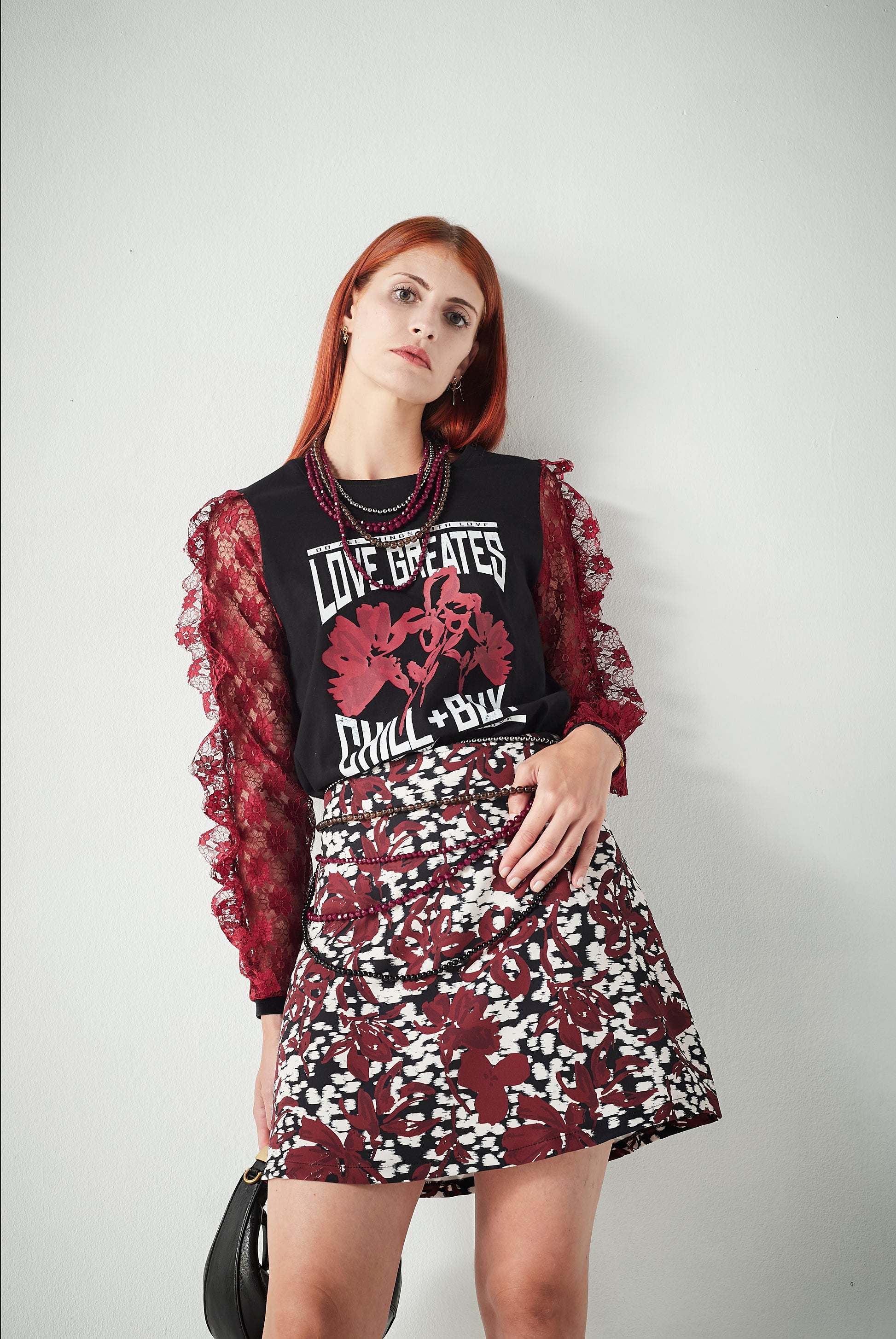 Falda corta de corte evasé con tiro alto, confeccionada en tejido estampado en tonos granate y negro. Una prenda versátil y favorecedora para cualquier ocasión.