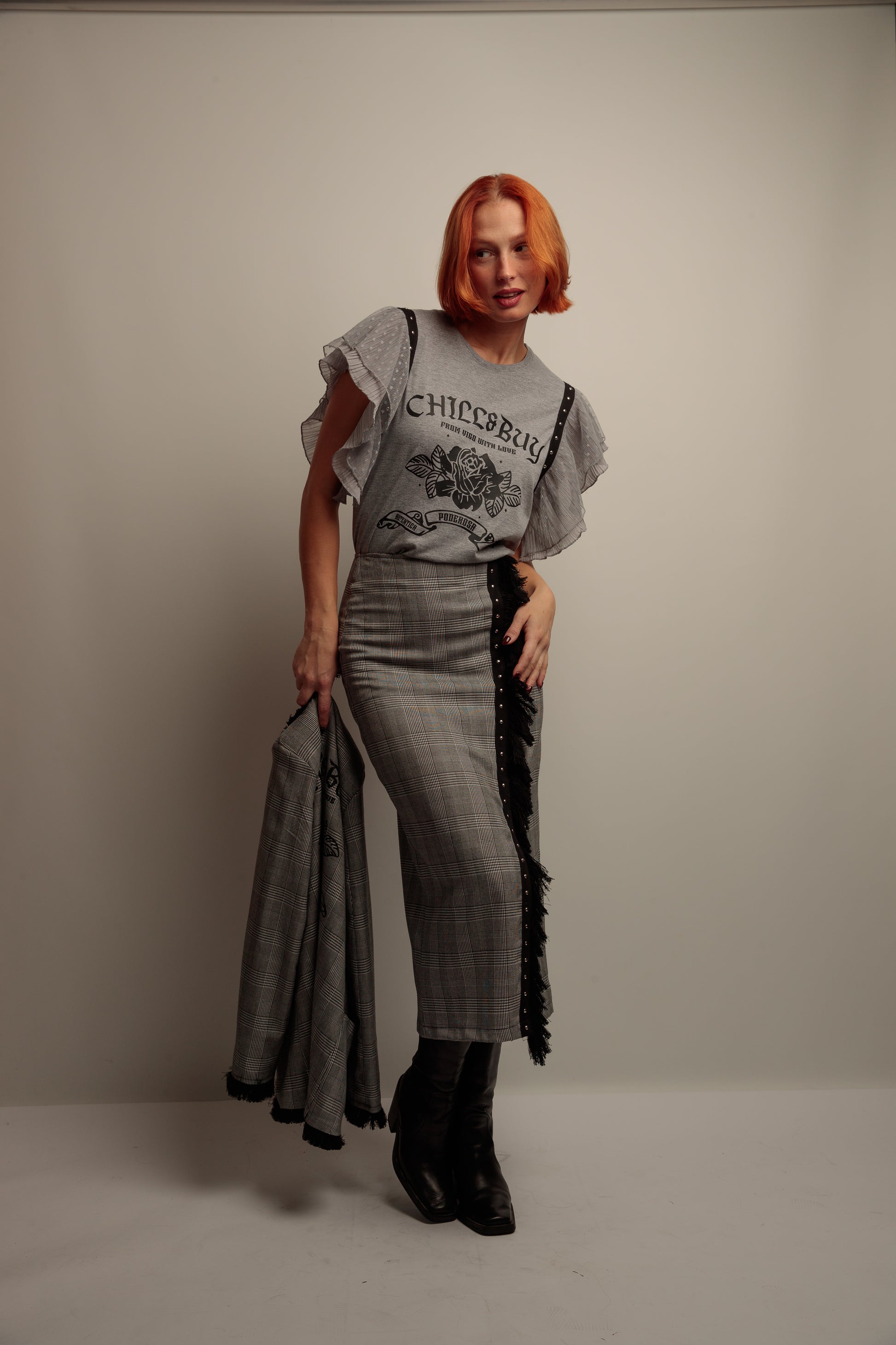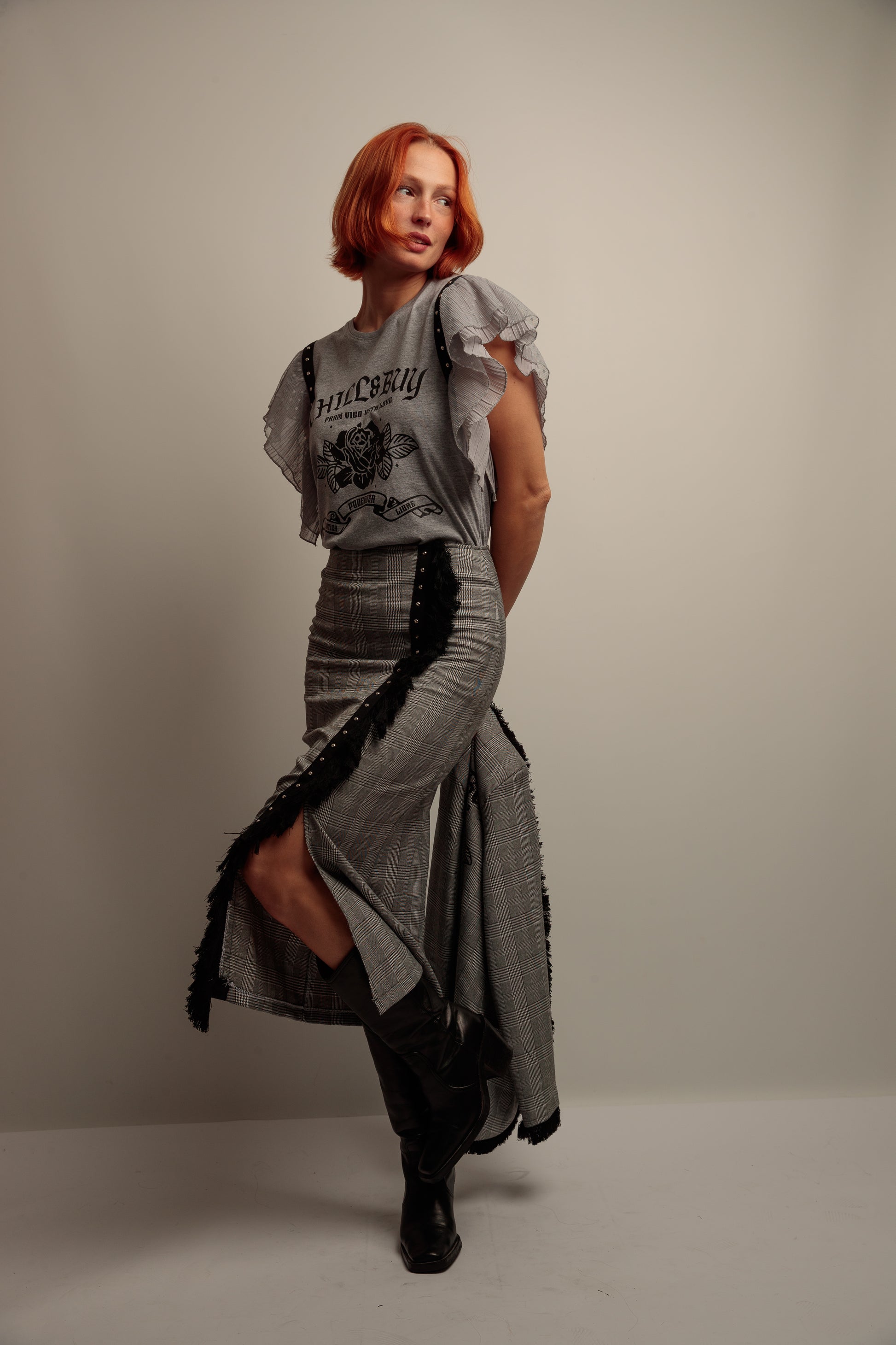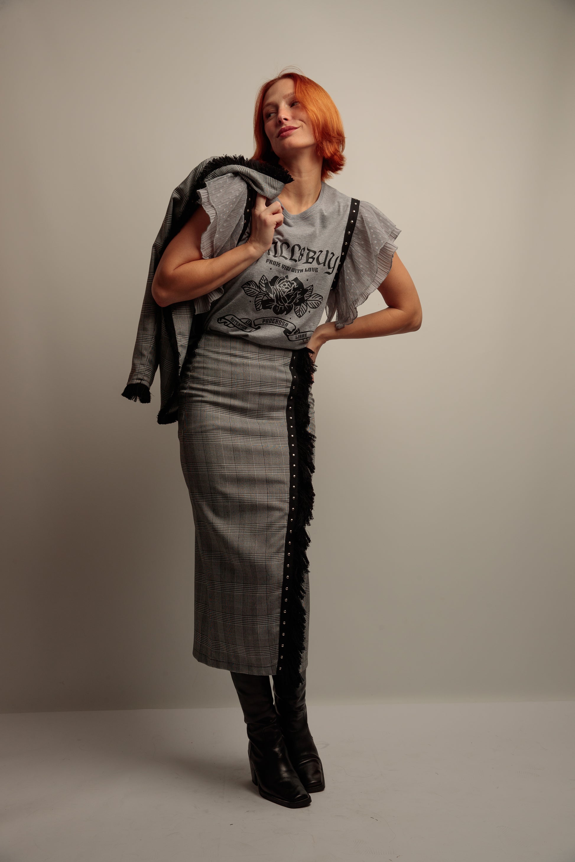 Esta falda combina el clásico cuadro de príncipe de Gales con un toque moderno y divertido. Su corte delantero con abertura está adornado con flecos de algodón negro que le añaden movimiento y estilo, rematados por una tira de tachuelas plateadas que aportan un toque rebelde. Con cierre de cremallera oculta en la parte posterior, es cómoda y fácil de llevar. Fabricada con mimo en Vigo, esta falda es perfecta para darle un giro original a tu armario con un toque chic y desenfadado.