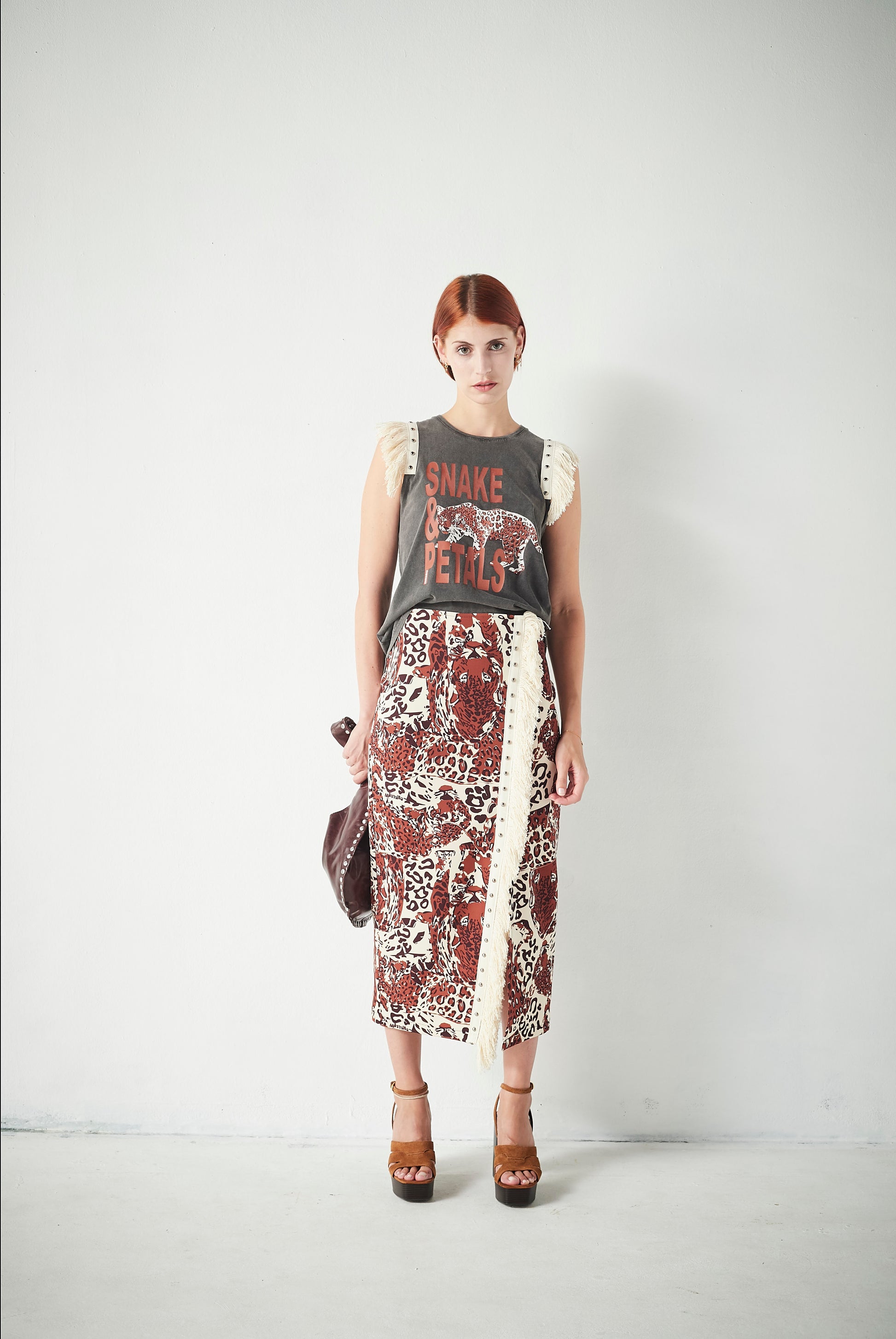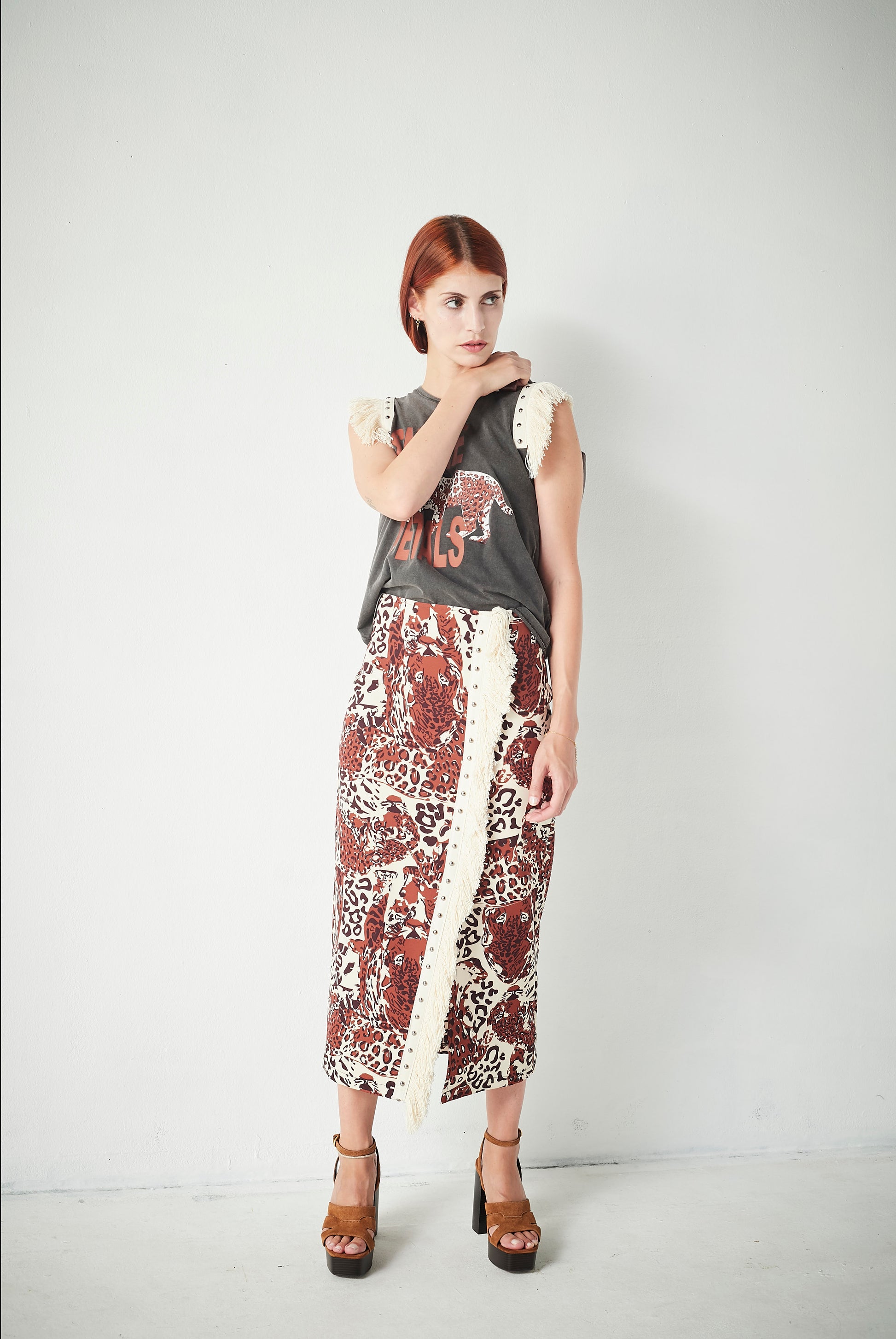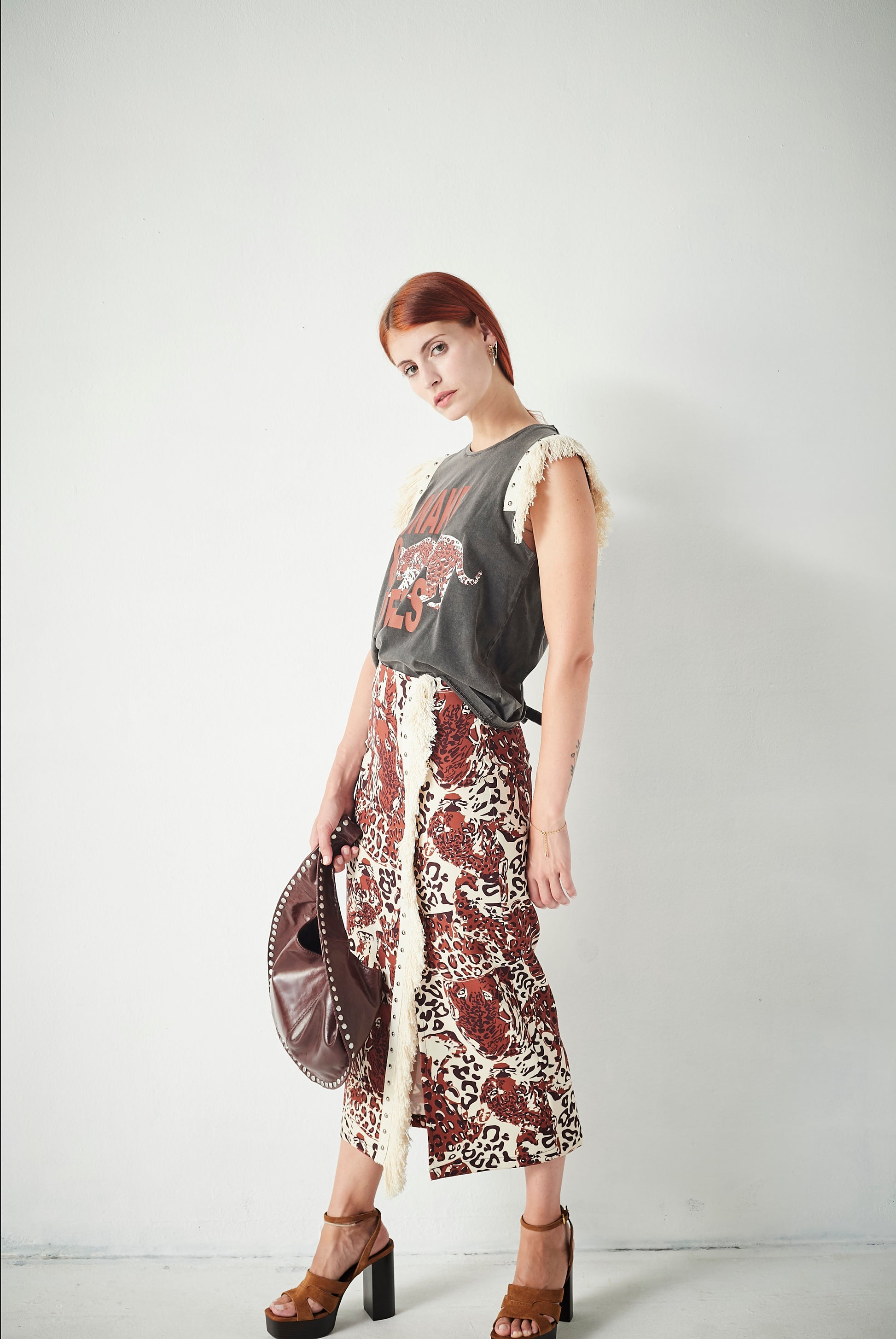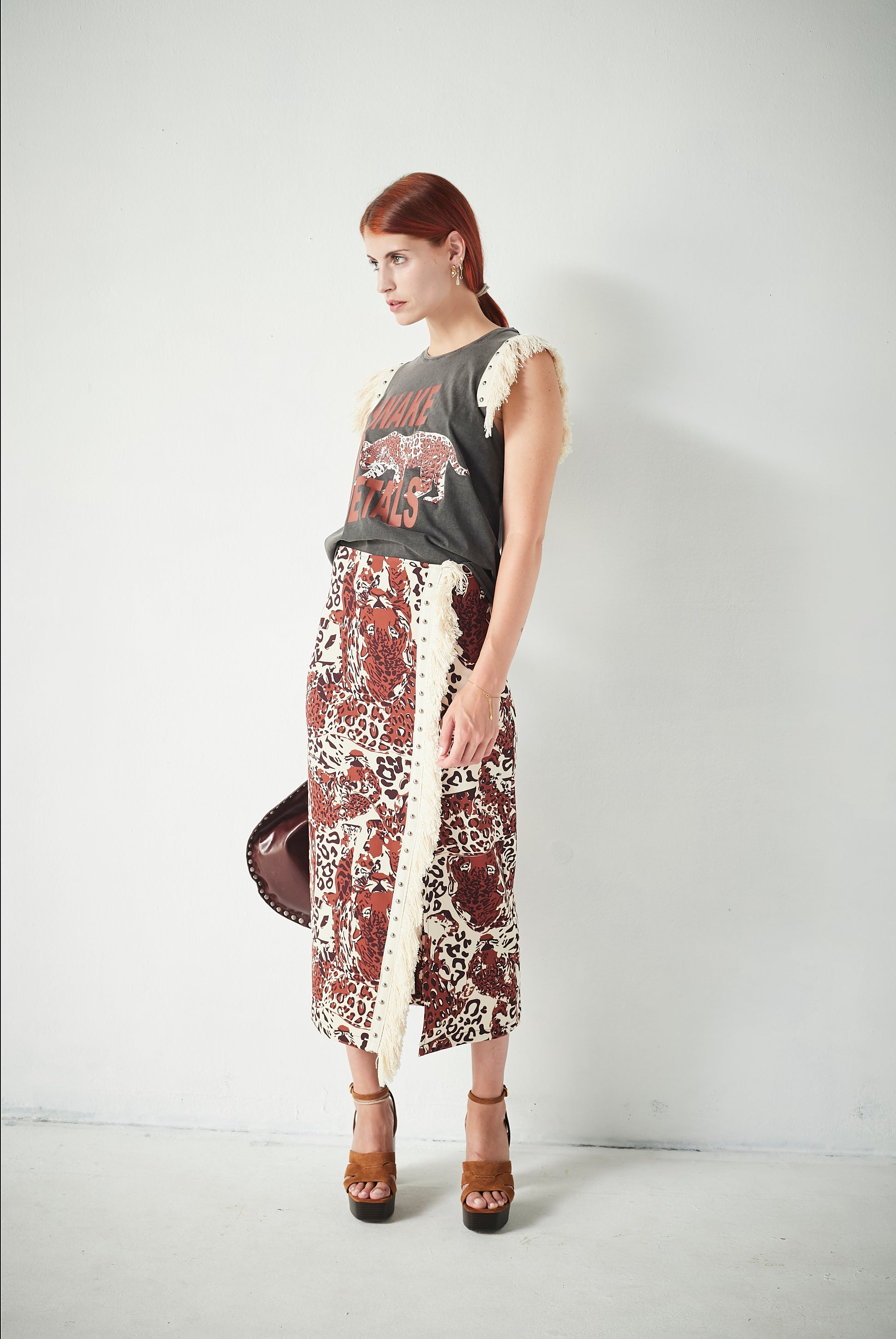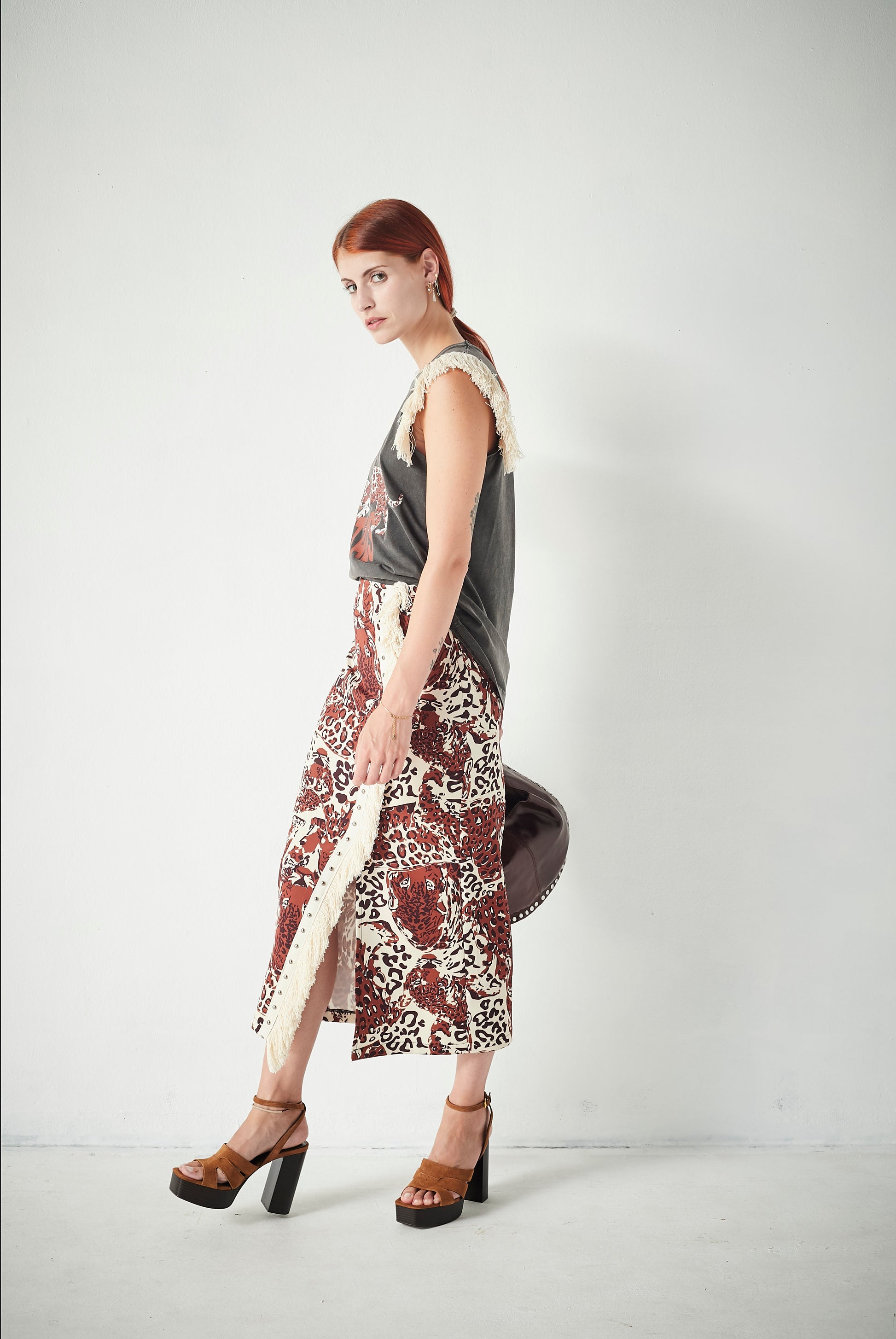 Falda lápiz larga de tiro alto en tejido estampado en tonos beige y marrón. Un diseño favorecedor que incorpora detalles originales para un estilo único.