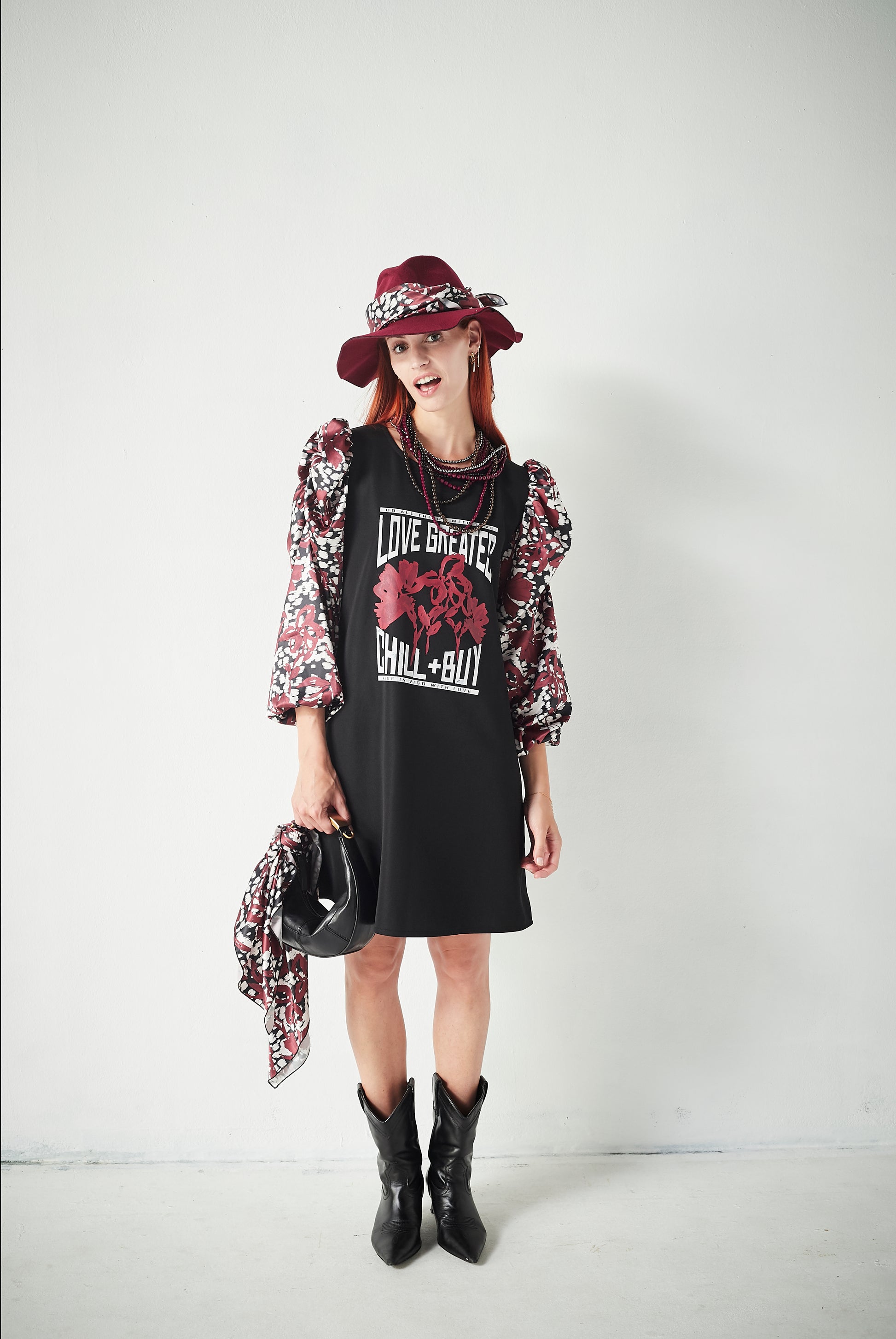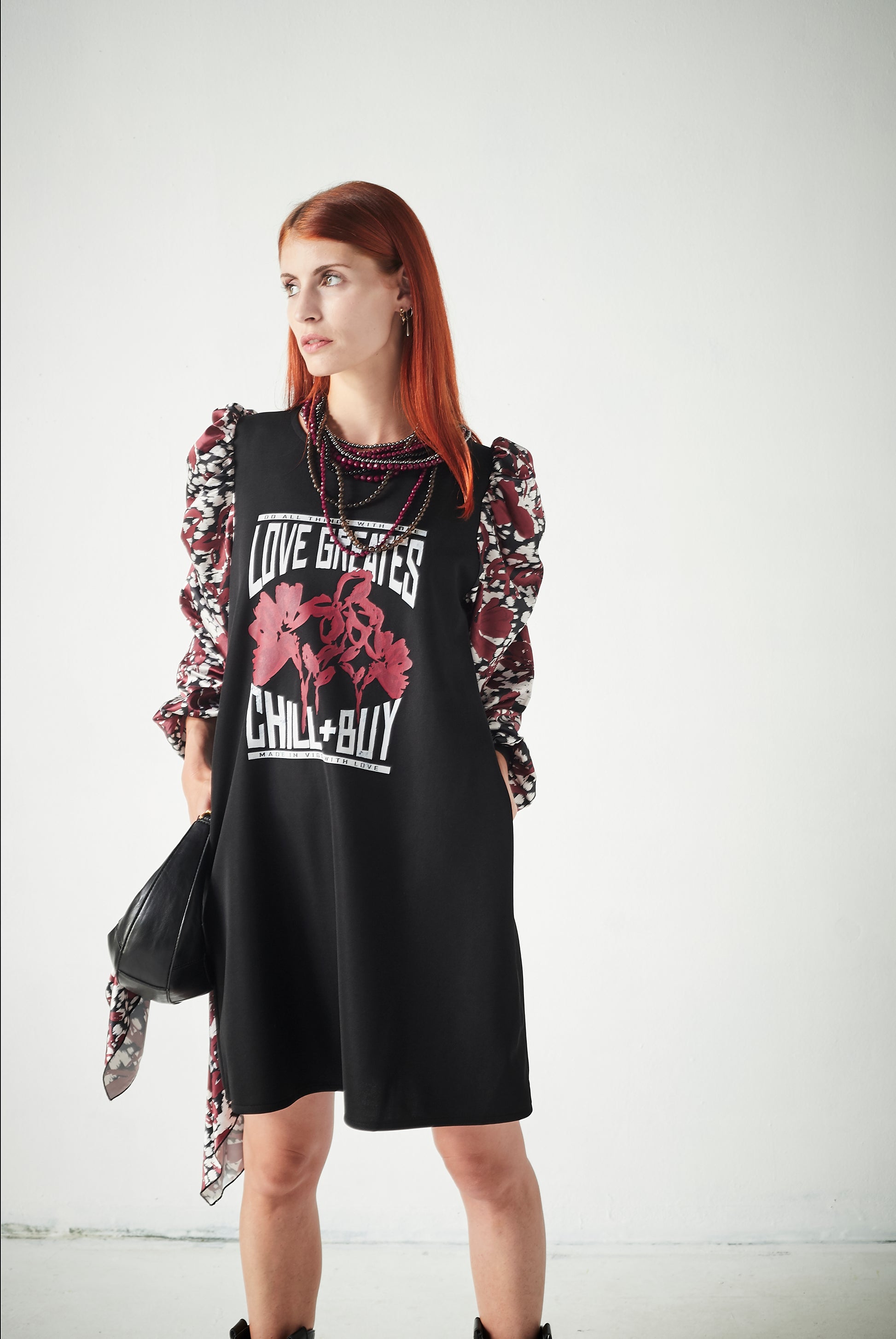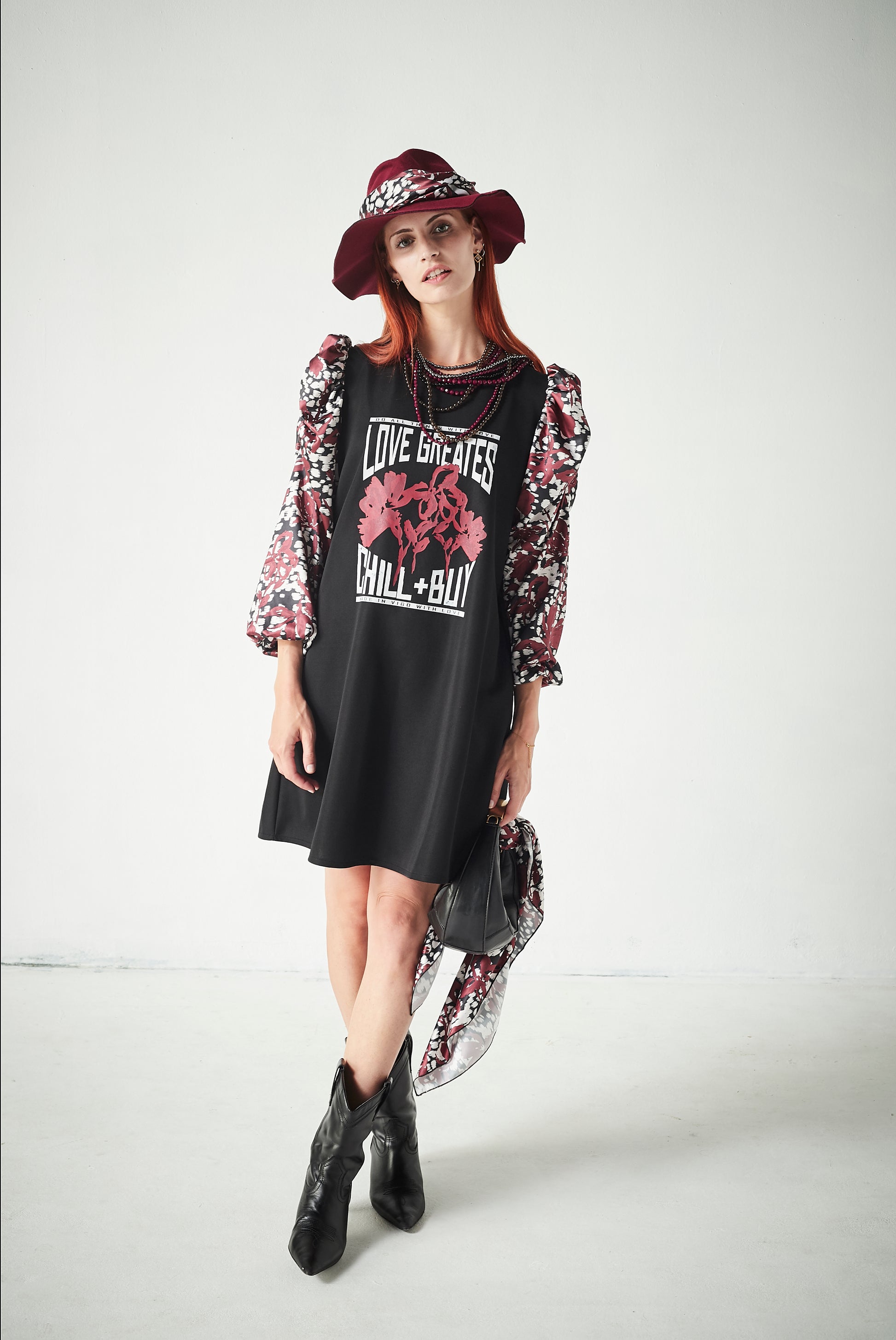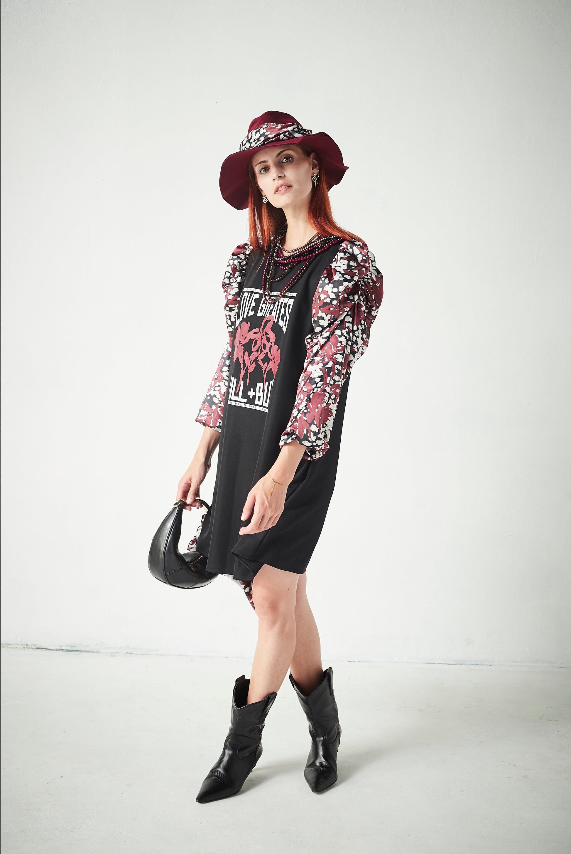 Vestido corto de mujer en tejido estampado en tonos blanco, negro y granate, con corte evasé y cuello redondo. Un diseño versátil que combina comodidad y detalles sofisticados.