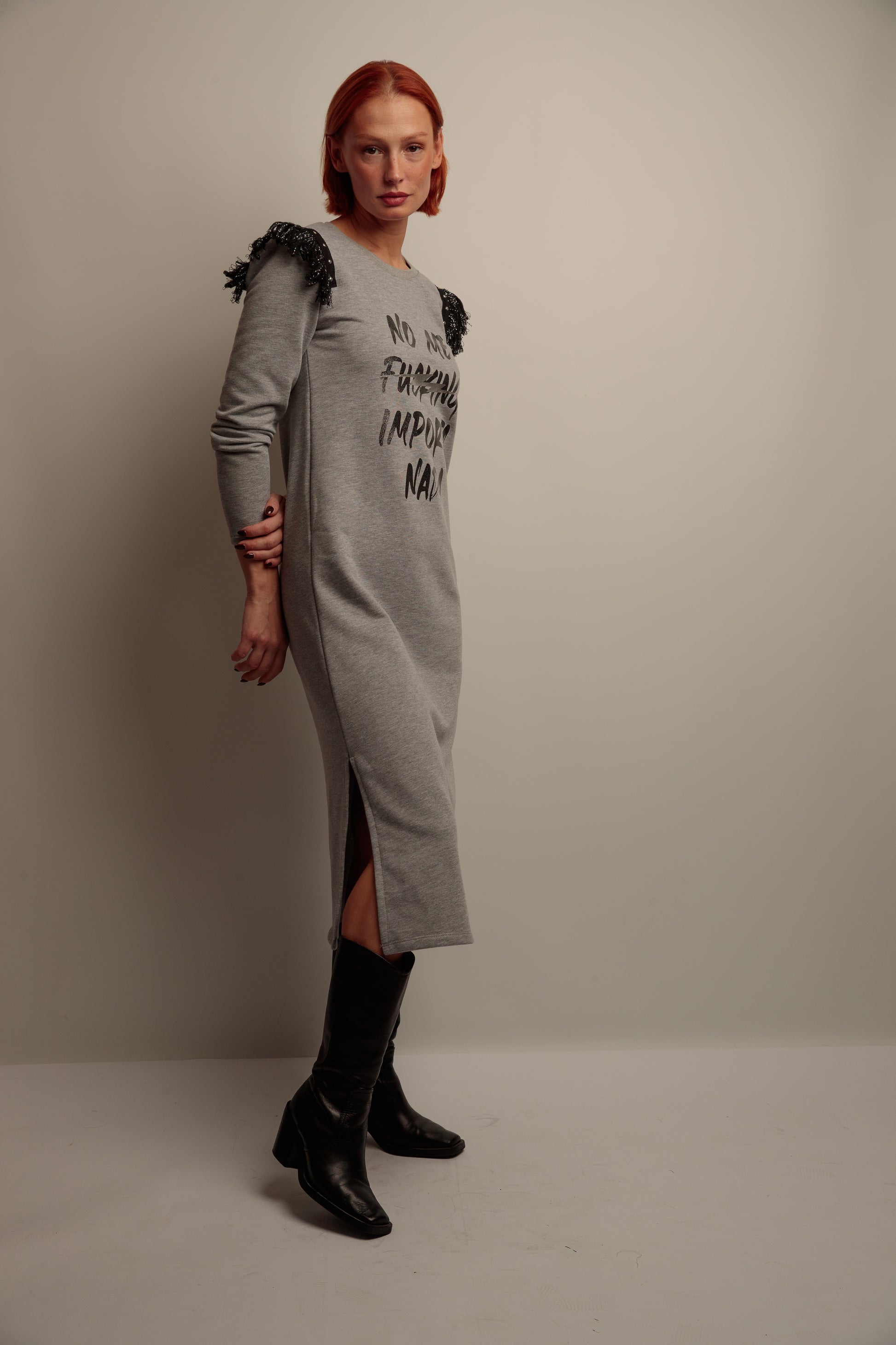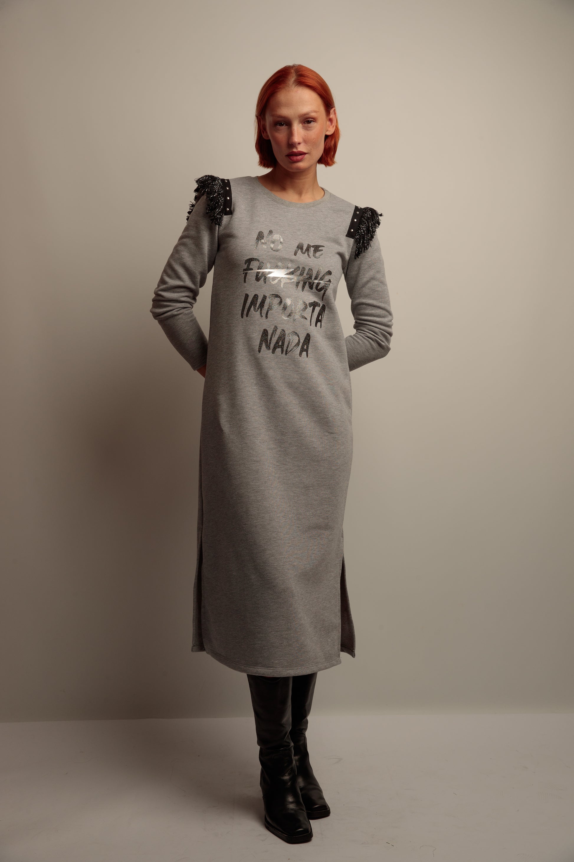 Este vestido largo de algodón combina comodidad y estilo con aberturas laterales que aportan movimiento y frescura. Sus flecos de lurex en el hombro, rematados con tachuelas plateadas, le dan un toque rebelde y brillante. La manga larga lo hace perfecto para cualquier época, y su diseño frontal confeccionado en Vigo asegura calidad y originalidad en cada detalle. Ideal para quienes buscan diversión y personalidad en su look.