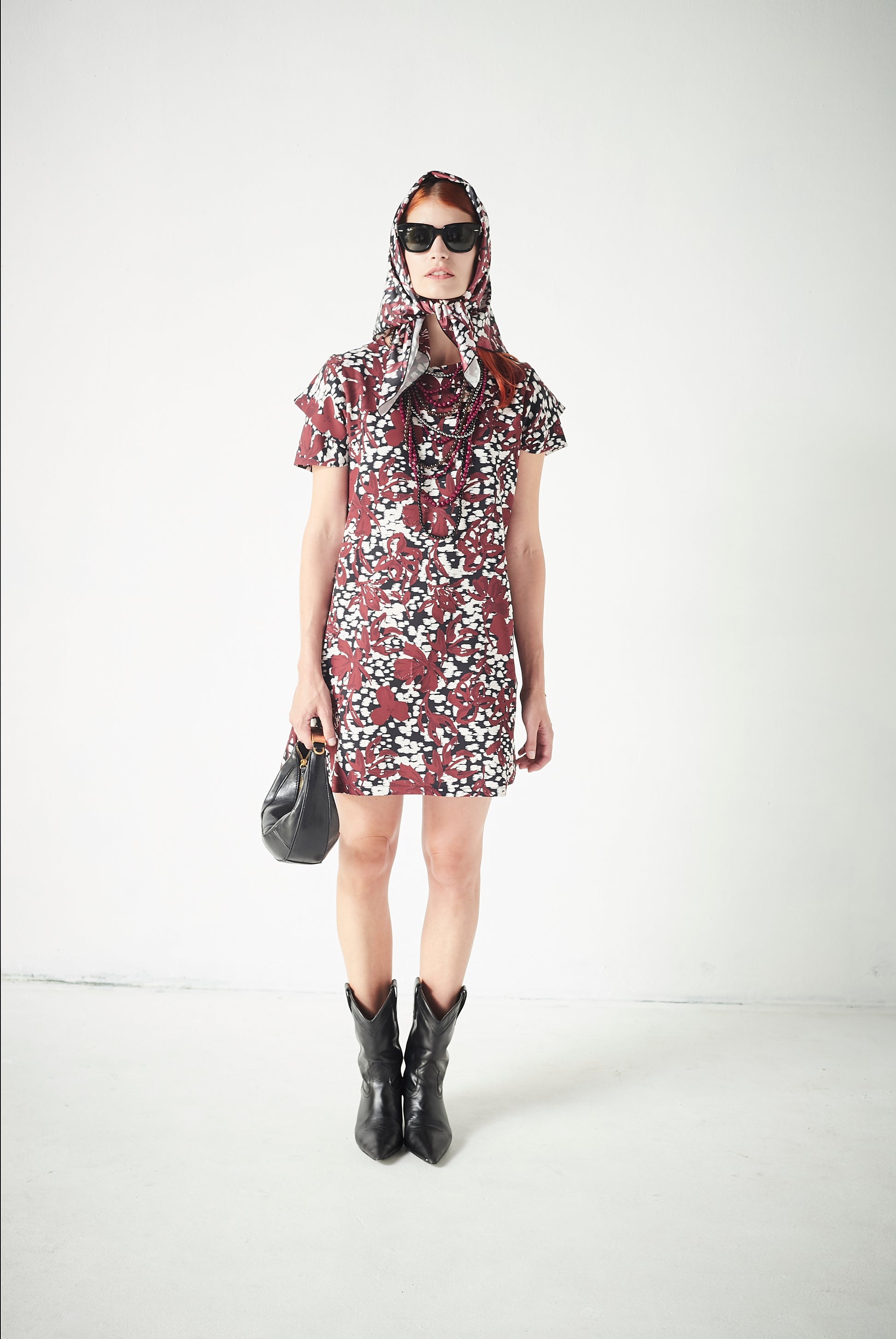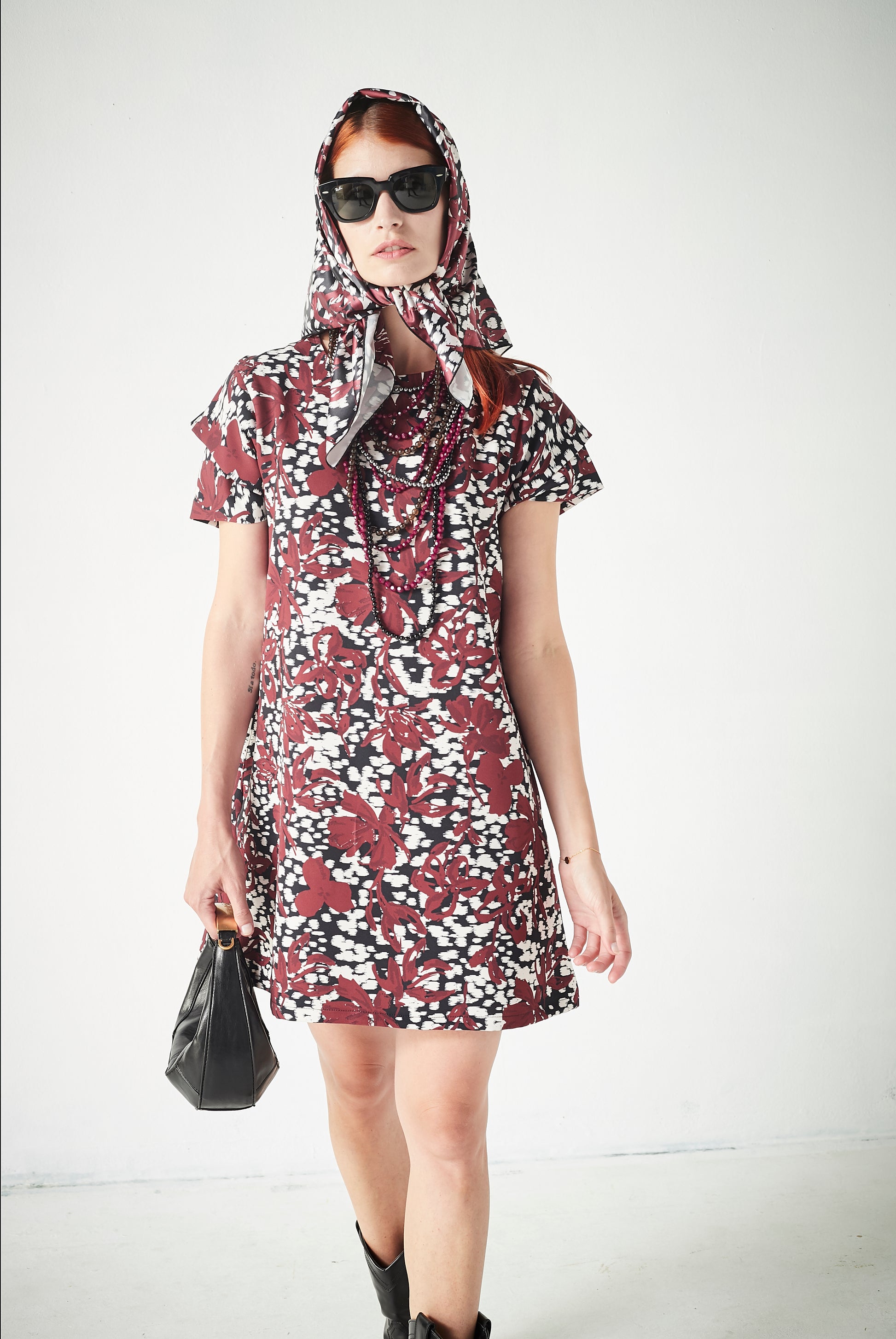 Vestido corto de mujer con corte evasé y cuello redondo, diseñado en tejido estampado en tonos negro, granate y beige. Un modelo cómodo y versátil con detalles diferenciadores.