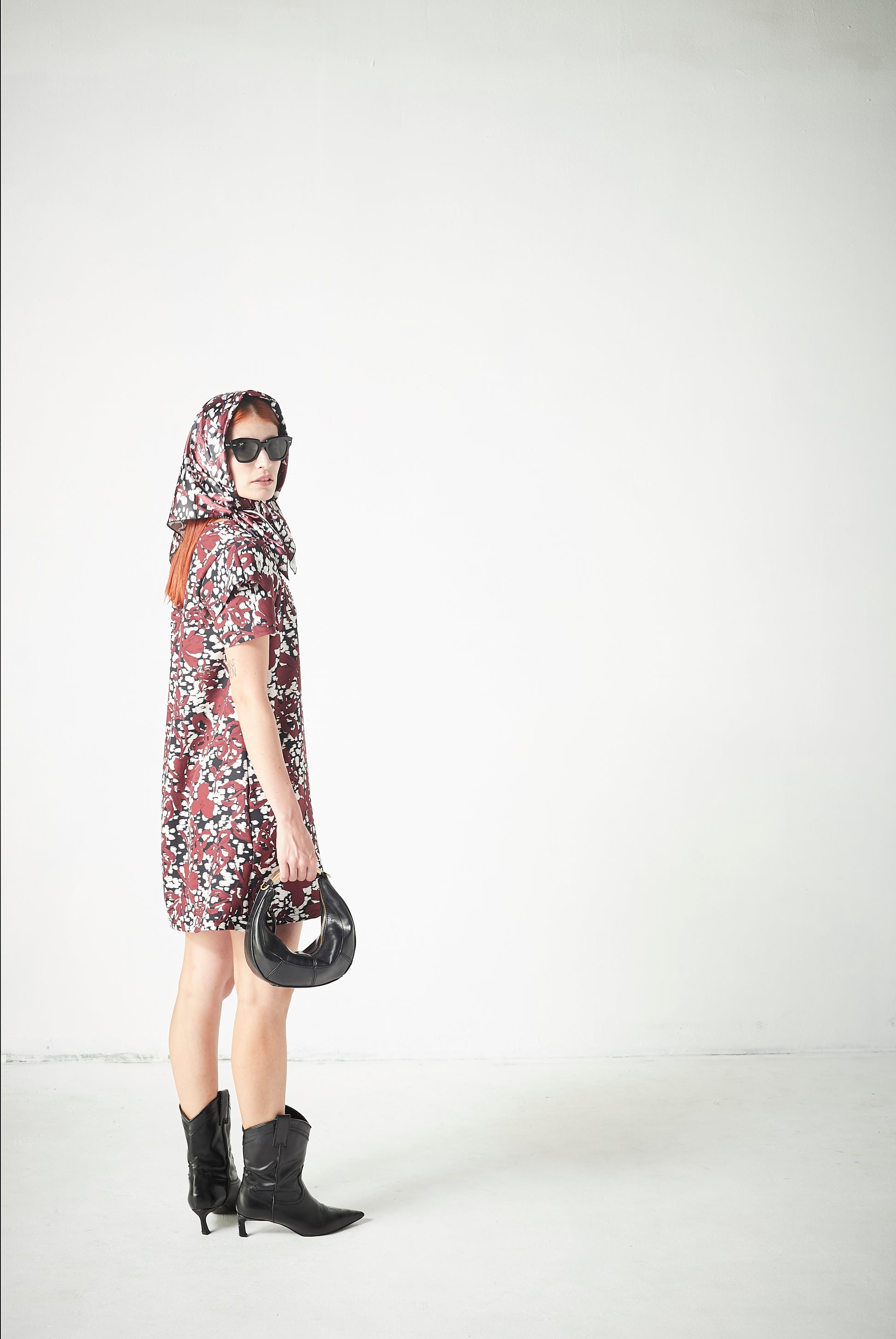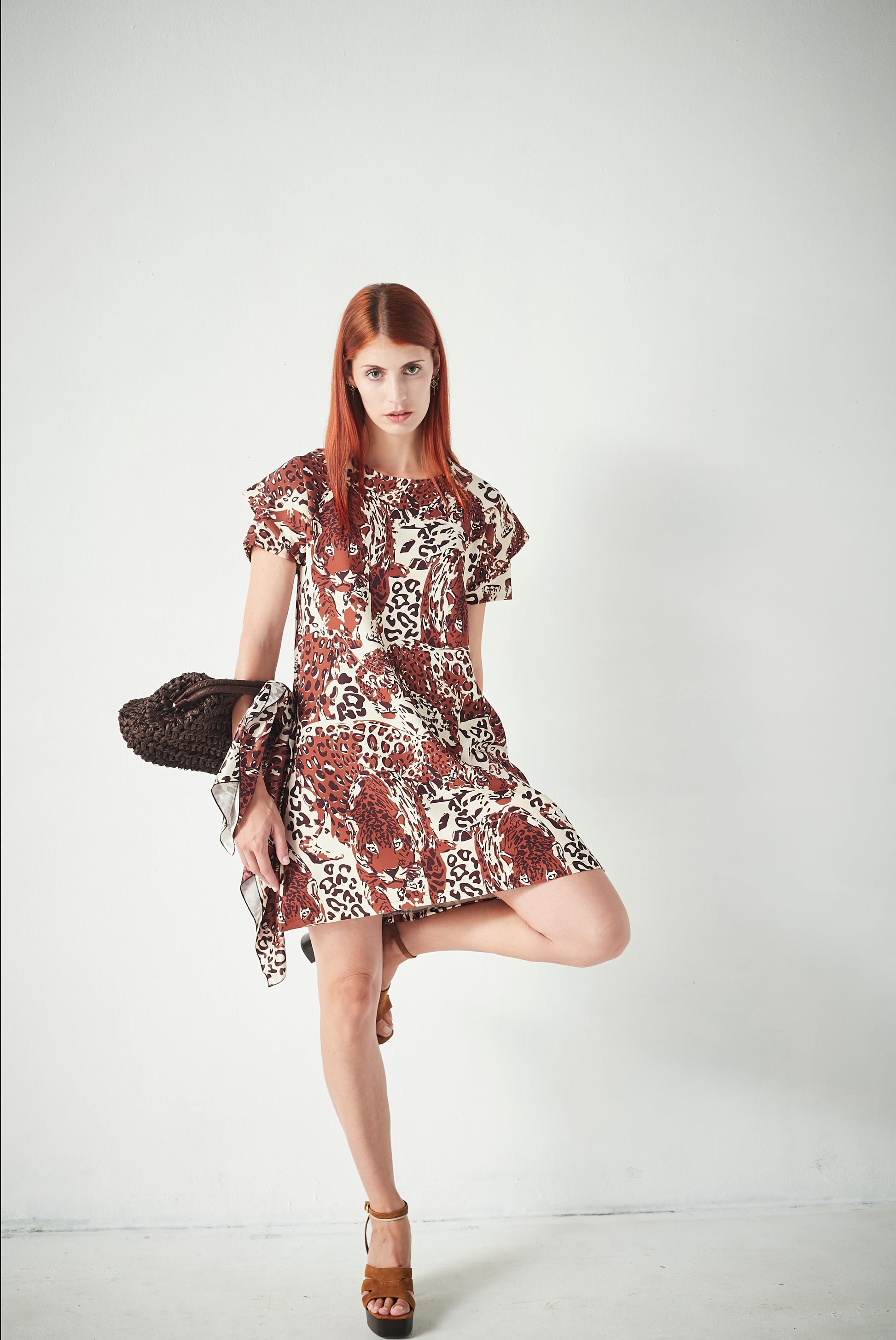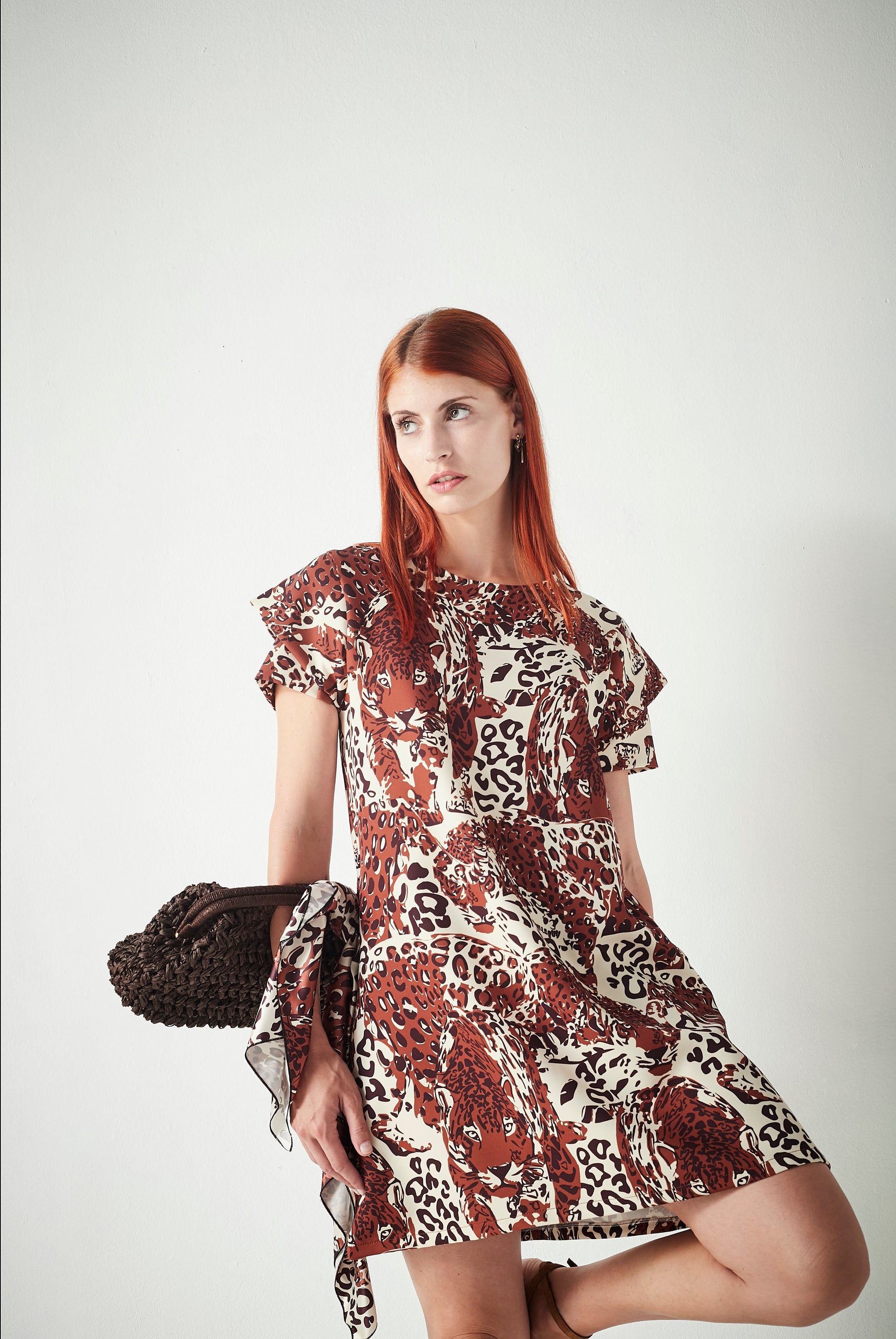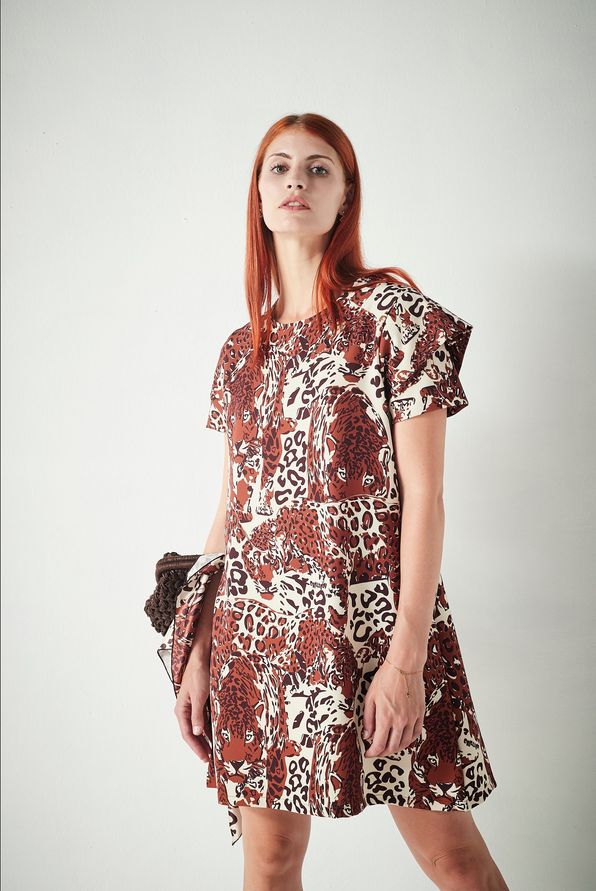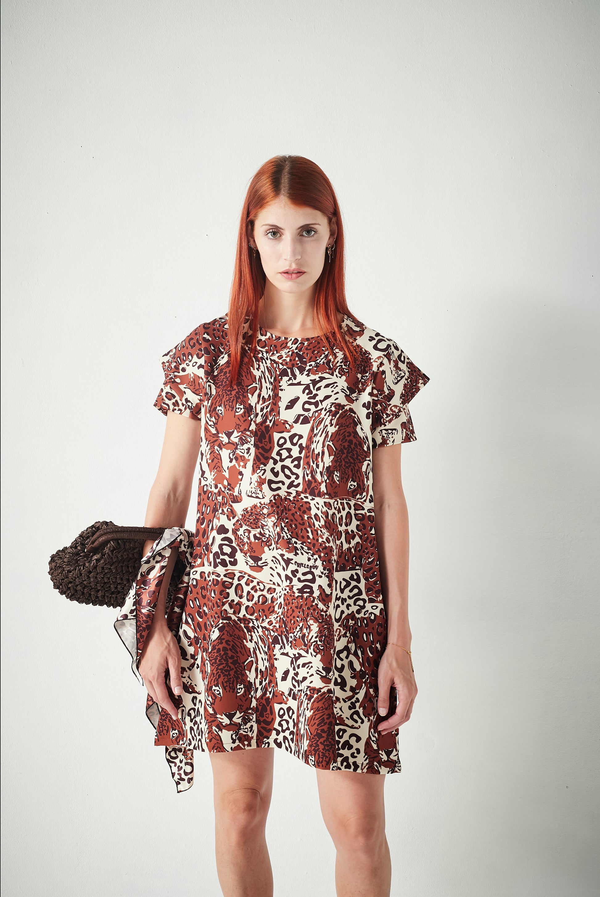 Vestido corto de mujer con corte evasé y cuello redondo, diseñado en tejido estampado en tonos marrones. Un modelo cómodo y versátil con detalles diferenciadores.