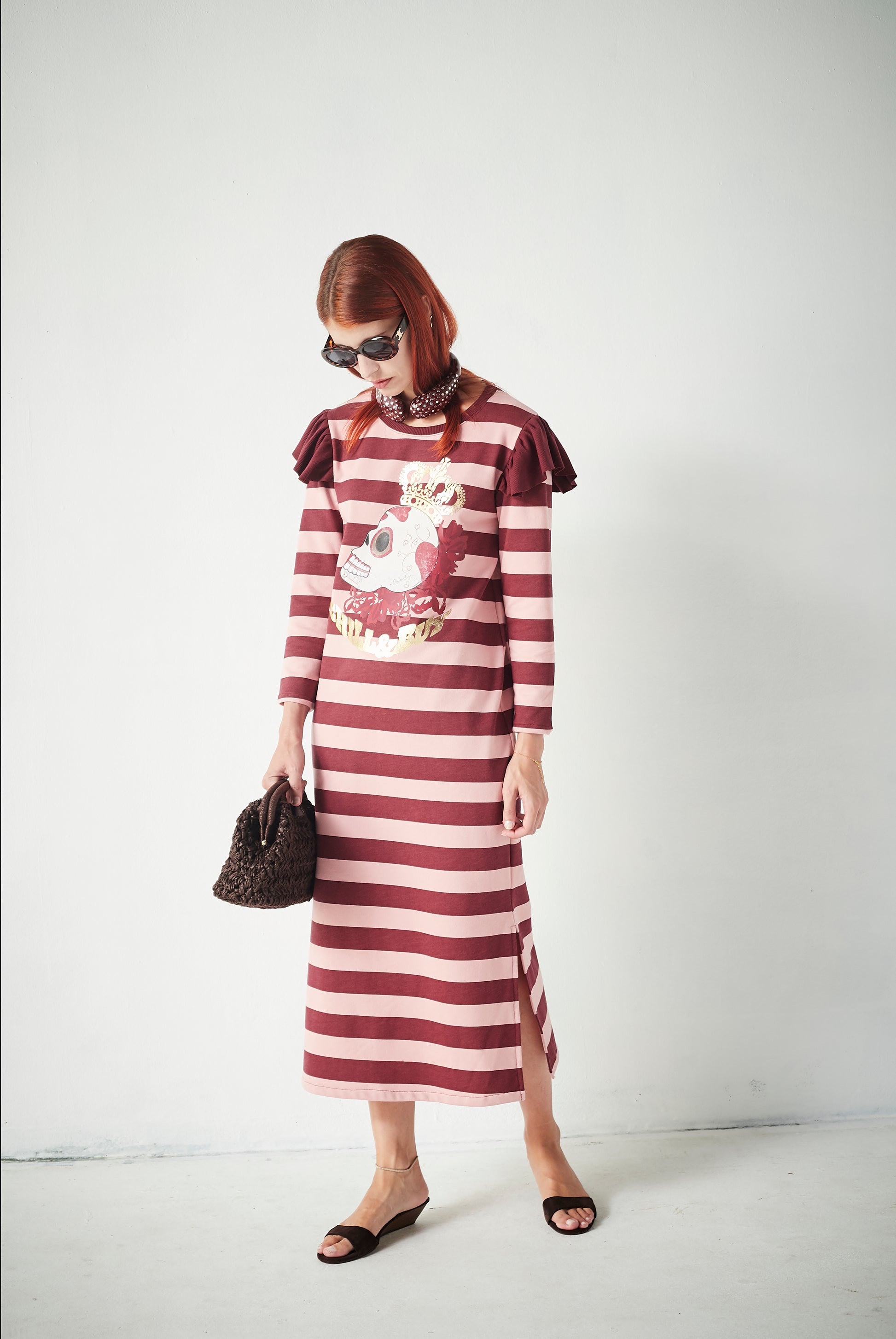 Confeccionado en tejido de punto con estampado de rayas en rosa y granate.