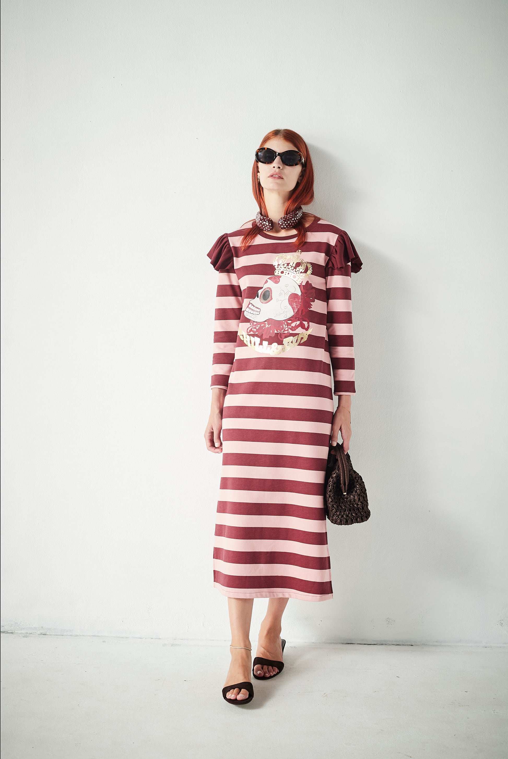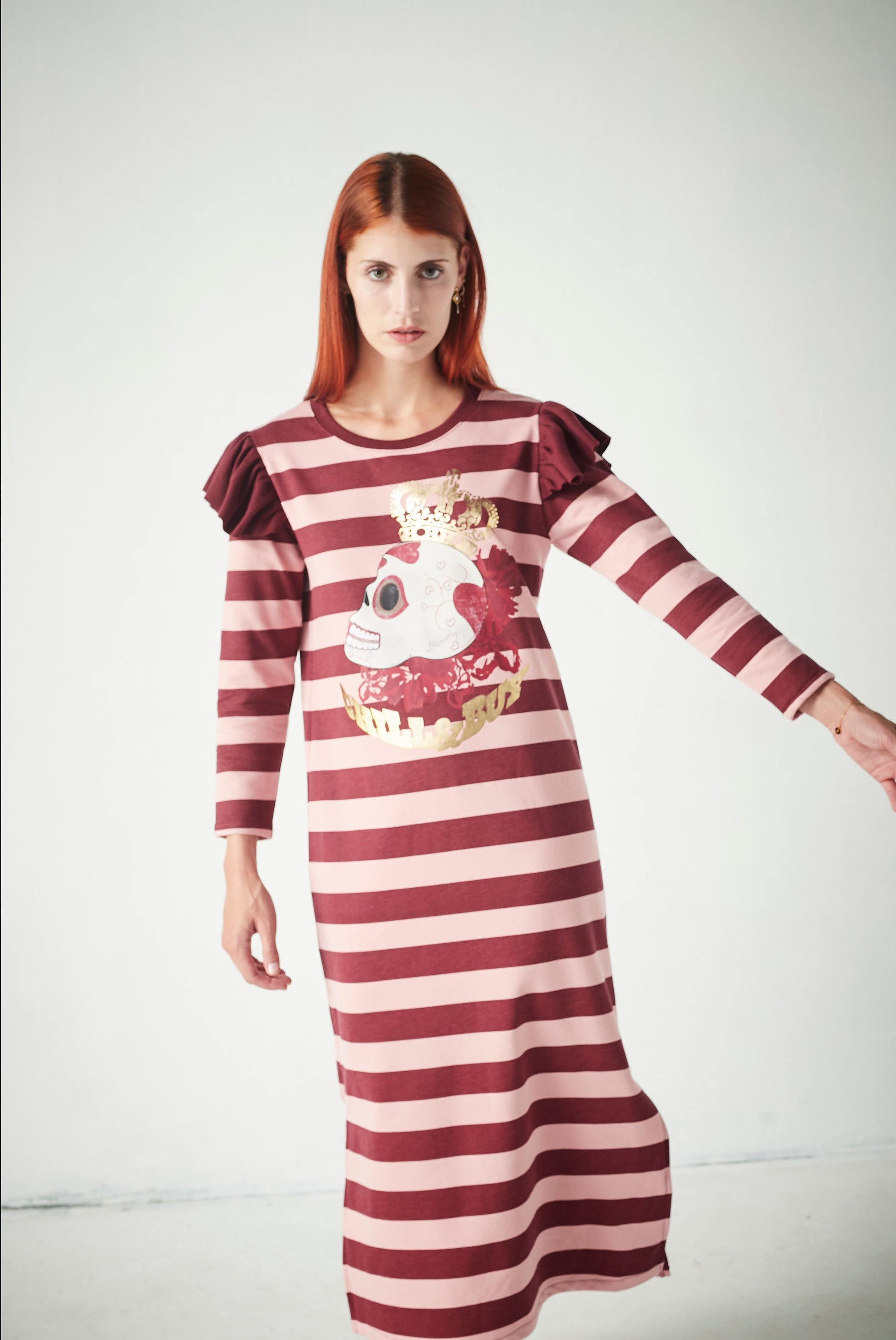 Vestido largo de punto en rayas rosa y granate con cuello redondo y manga larga. Un diseño cómodo y actual que incorpora detalles distintivos para realzar el estilo.
