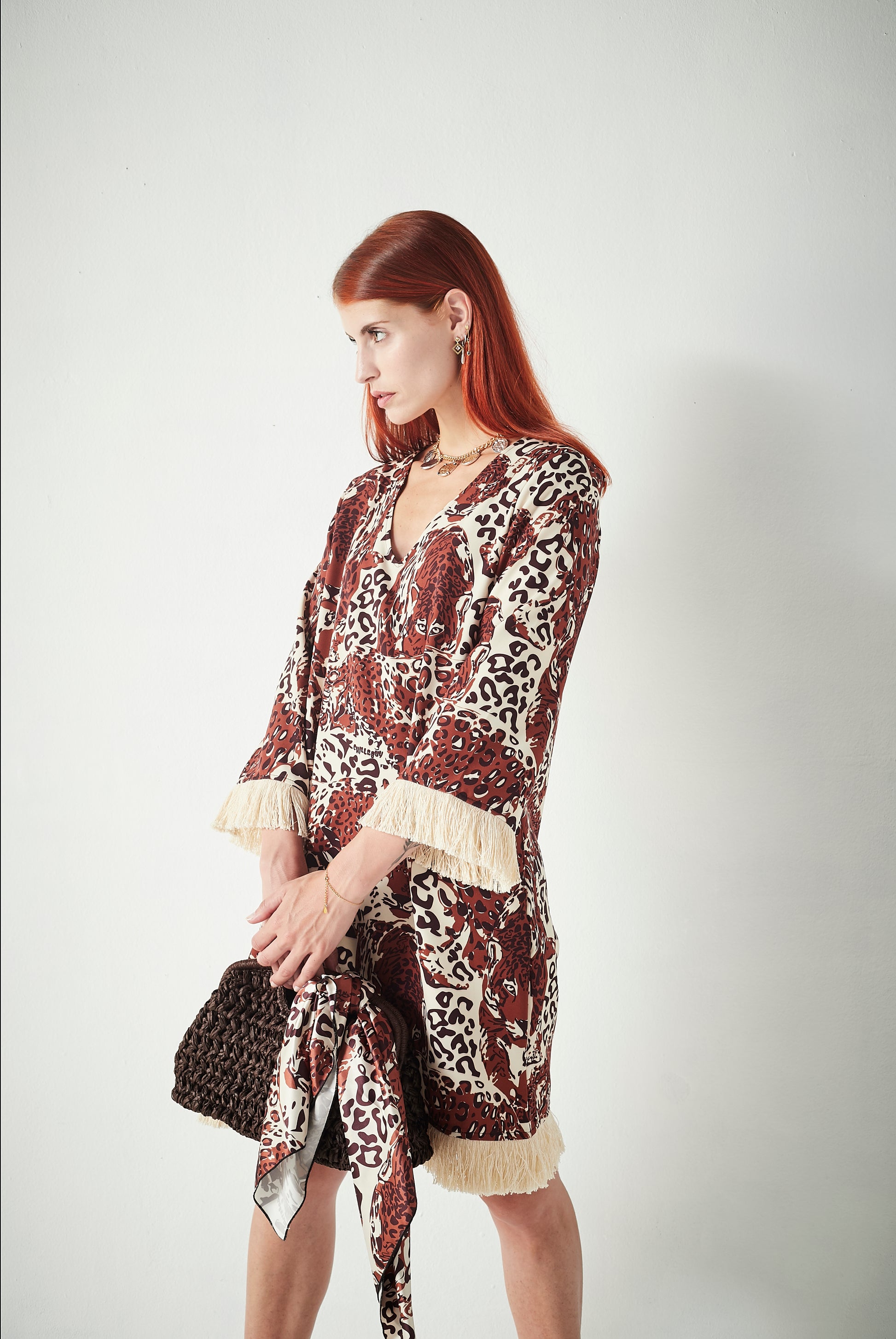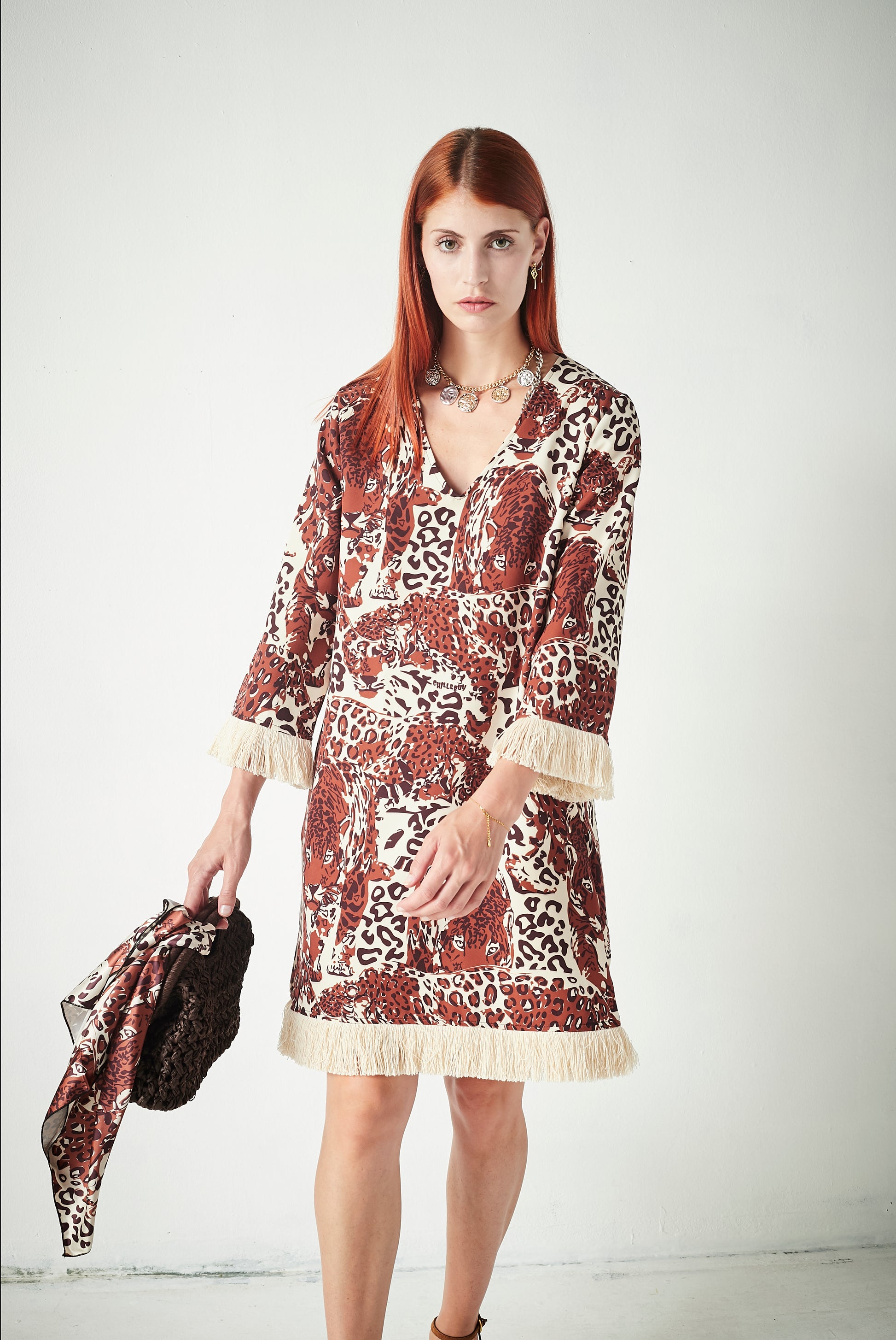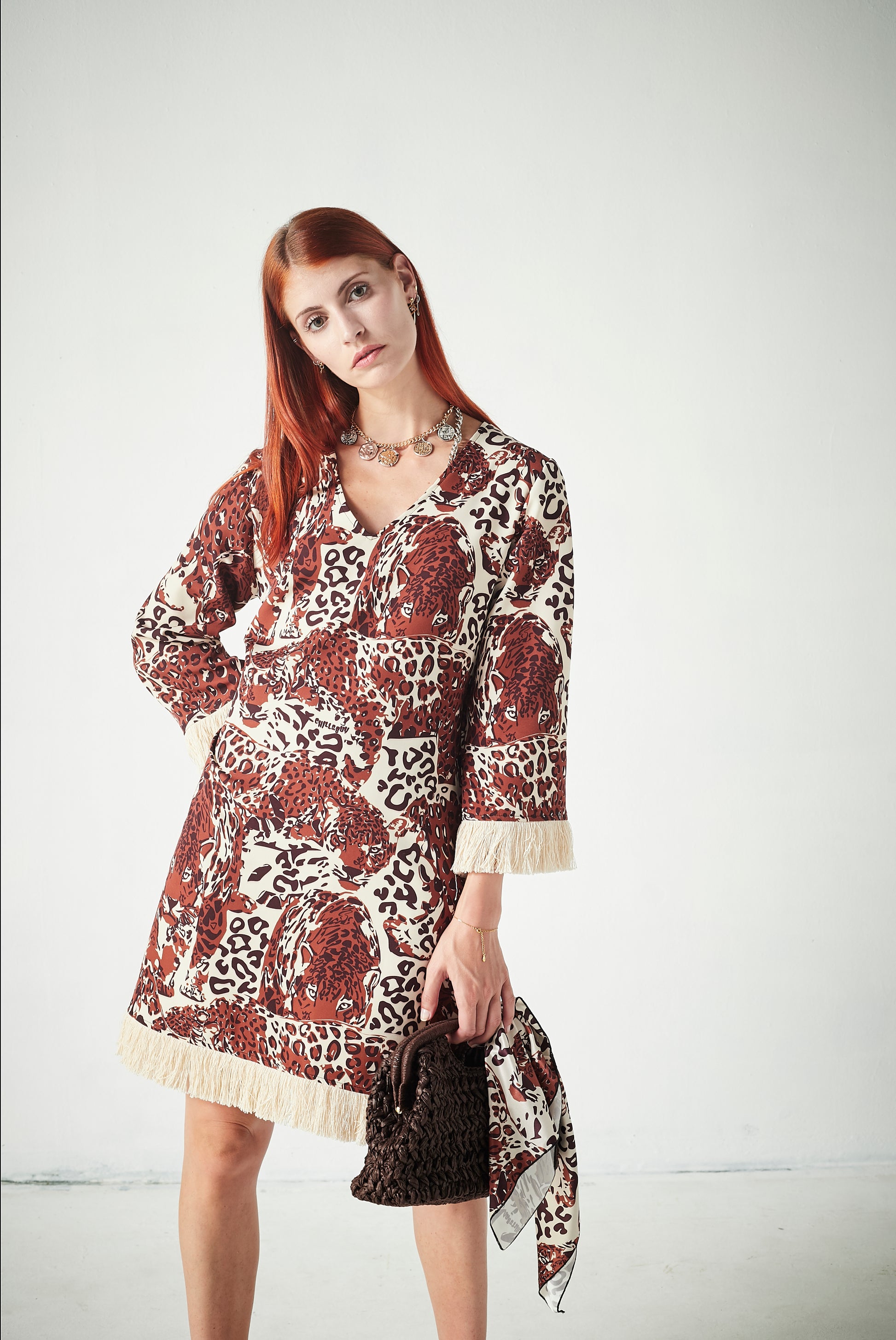 Vestido corto de mujer en tejido estampado en tonos beige y marrones, con corte evasé y cuello pico. Un diseño favorecedor que incorpora detalles distintivos para un estilo único.