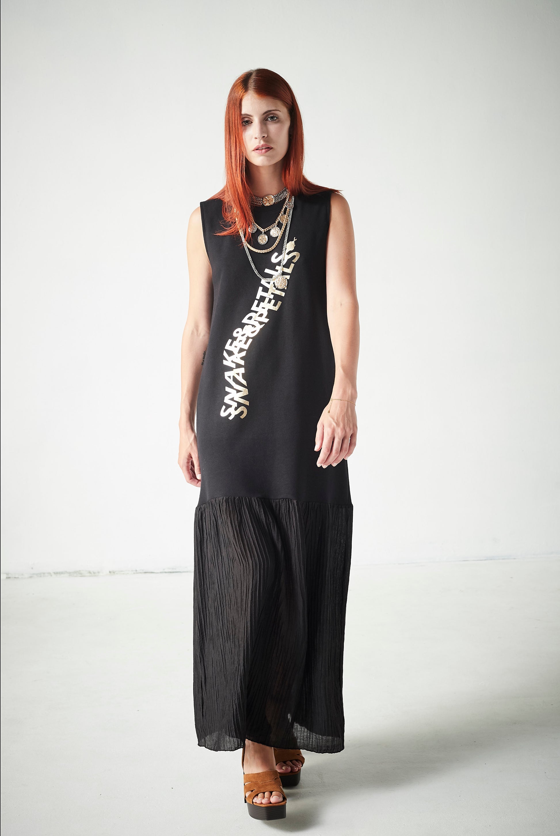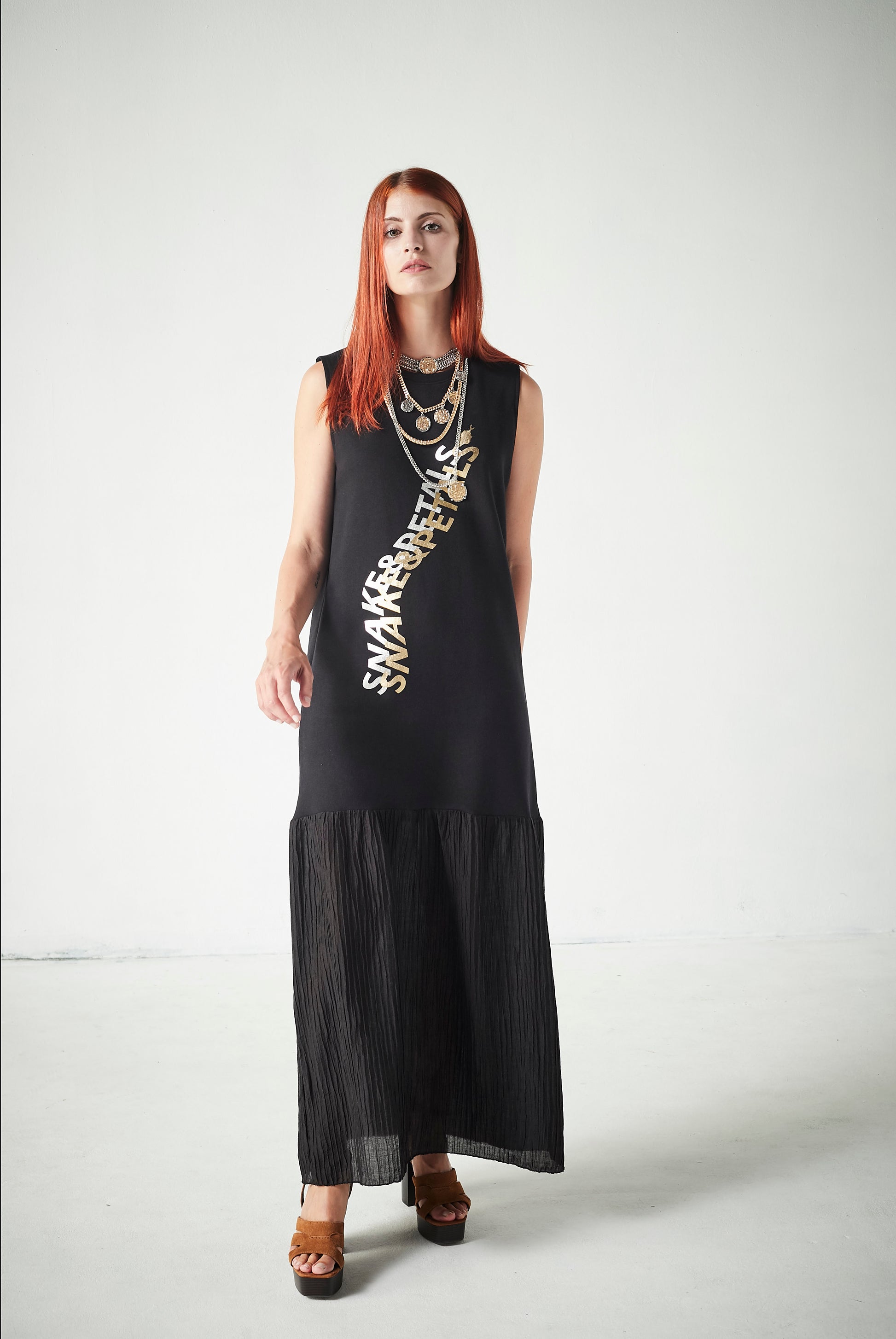 Vestido largo con cuello redondo y diseño que combina texturas para un acabado sofisticado y actual.