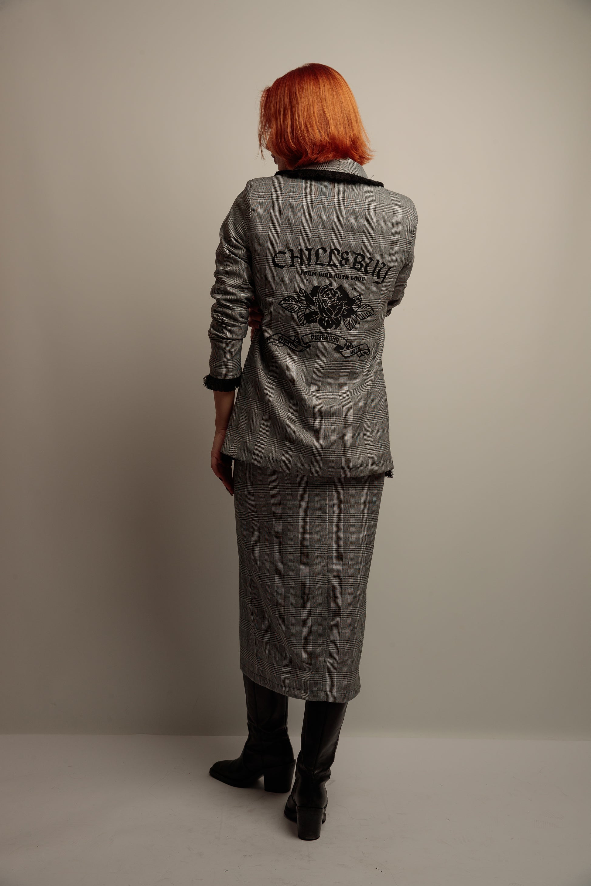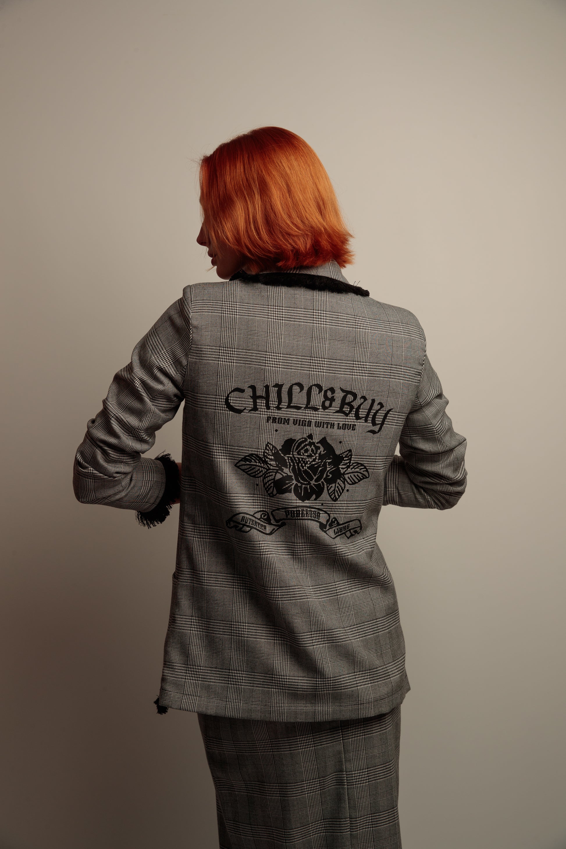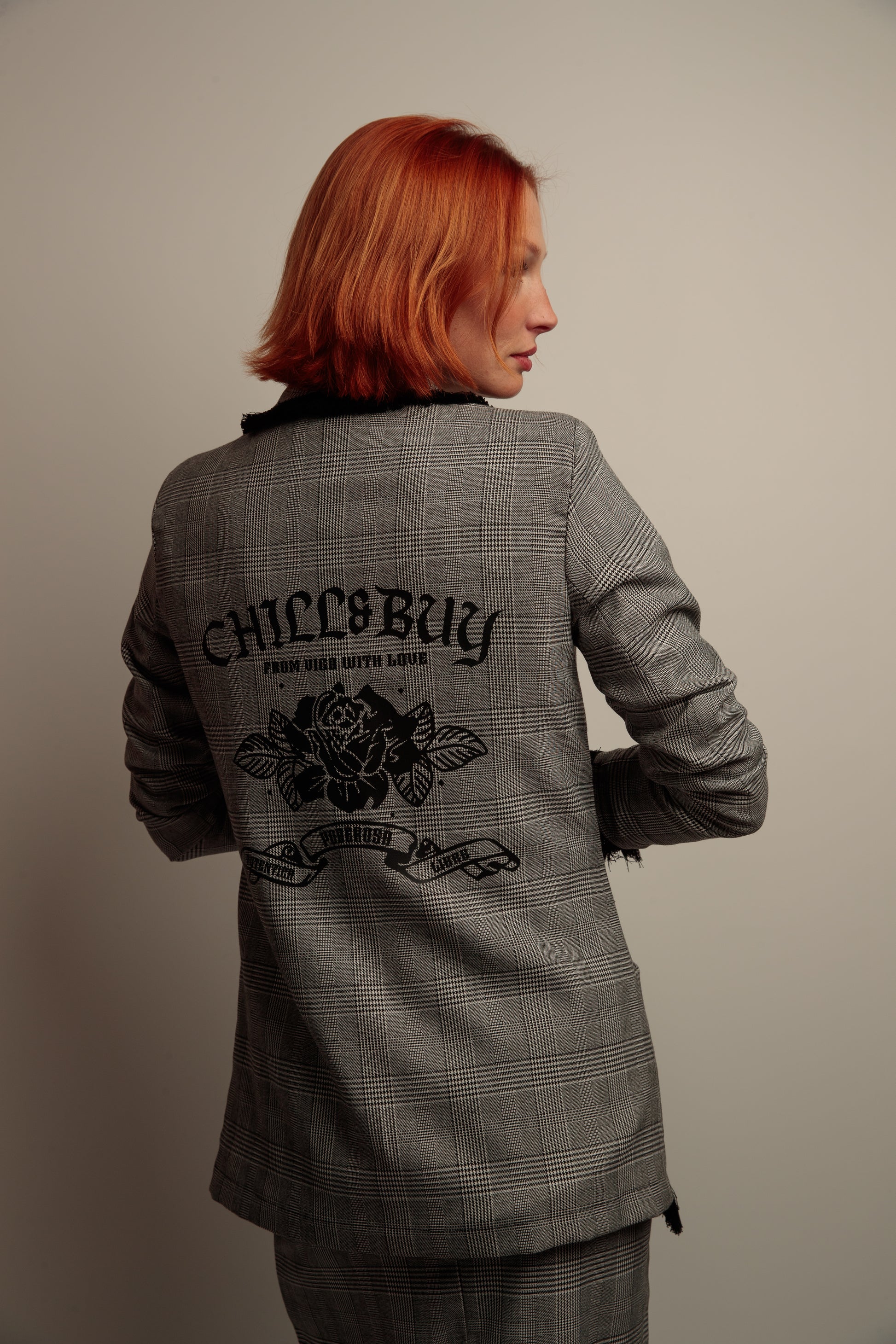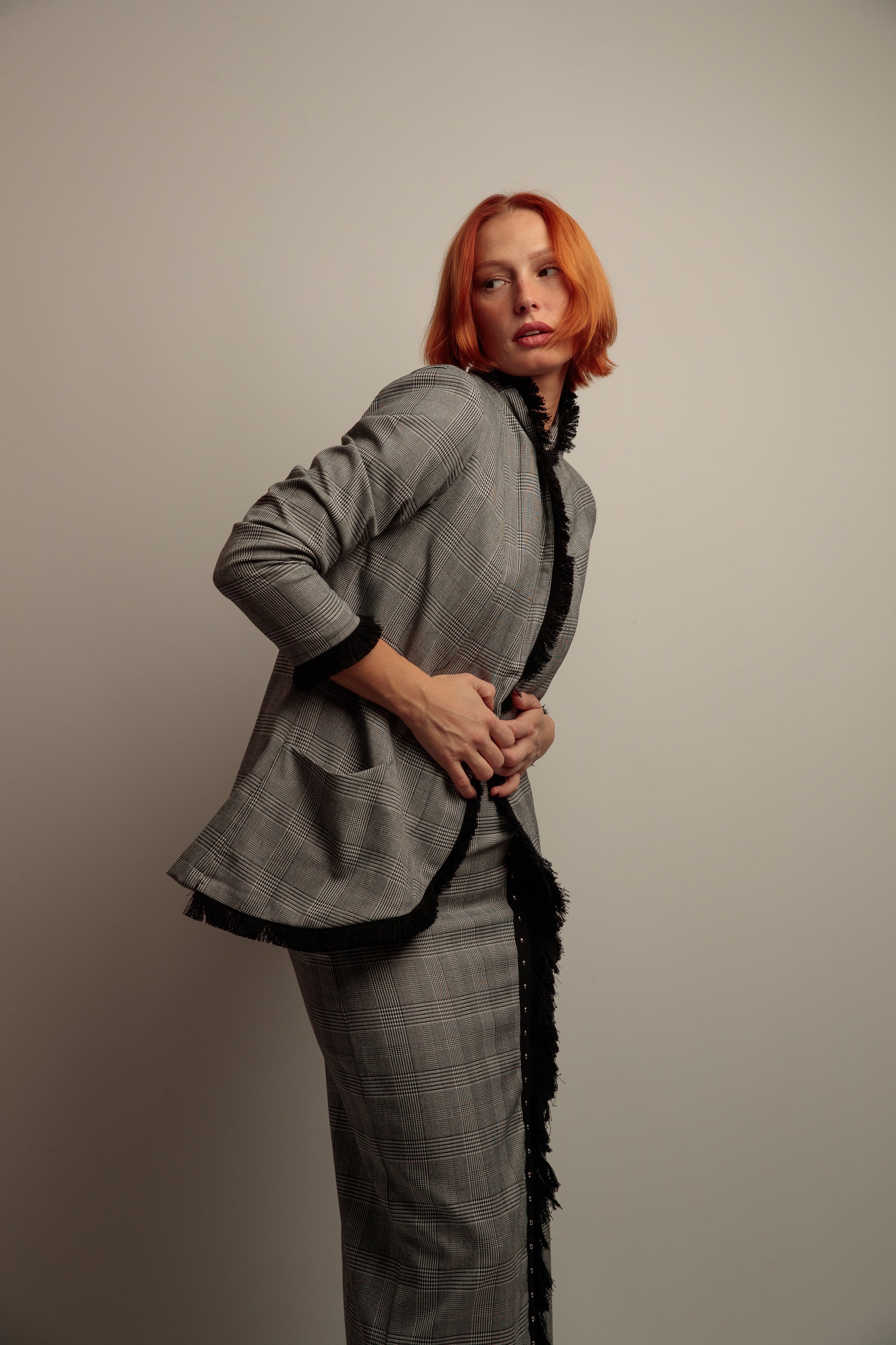 Este blazer de algodón con flecos de algodón en la solapa aporta un toque divertido y único a tu look. Forrada para mayor comodidad, cuenta con prácticos bolsillos y un corte smoking que realza tu estilo con un guiño atrevido. Además, está confeccionada con cariño en Vigo, garantizando calidad y autenticidad en cada detalle. ¡Haz que cada día sea una pasarela llena de personalidad!