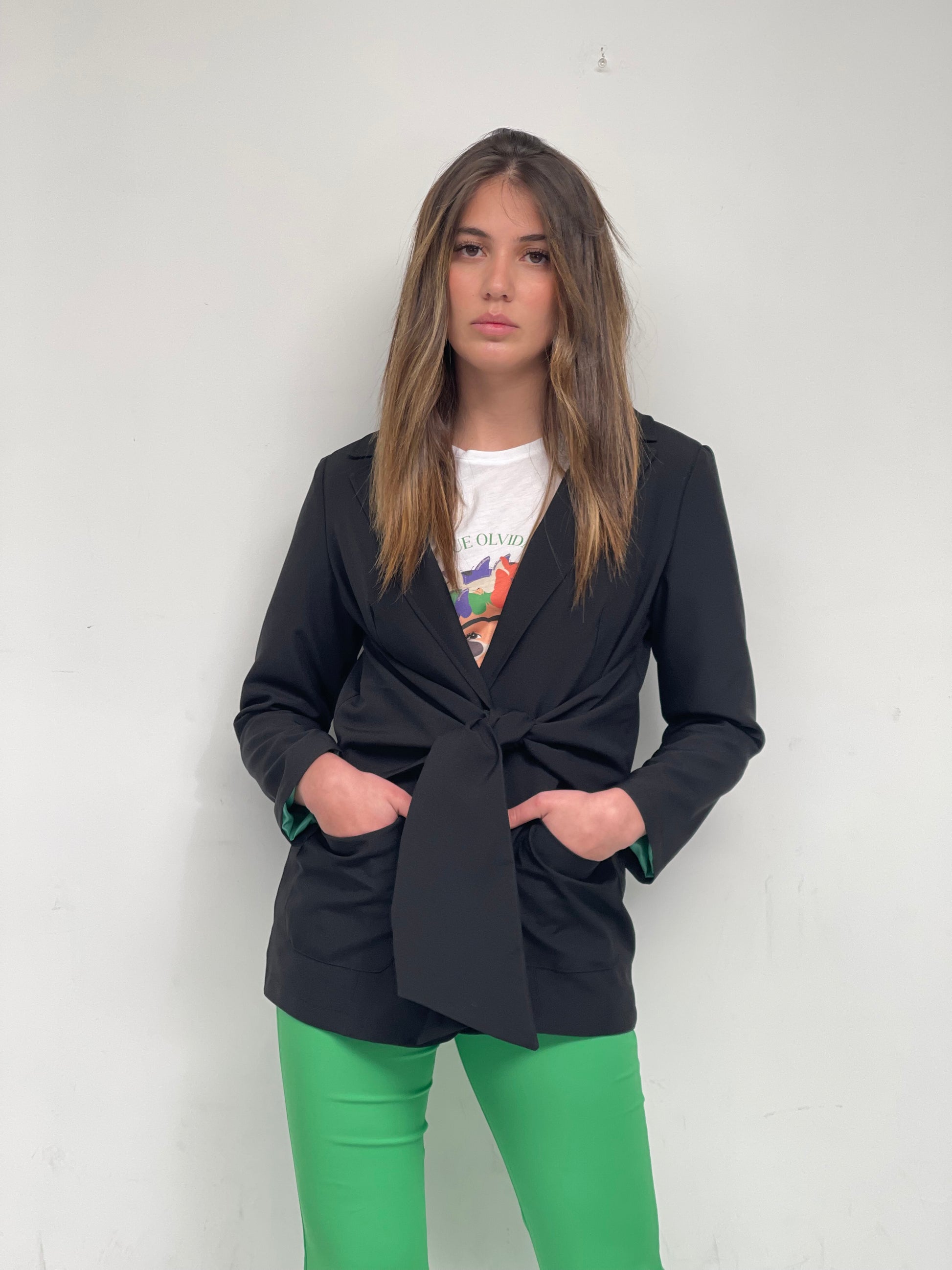 Blazer estructurado con solapas y forro interior que garantiza comodidad y durabilidad. Diseñado con bolsillos funcionales, hombreras marcadas y un distintivo lazo ajustable desde la cintura que permite abrocharlo al frente o la espalda, ofreciendo versatilidad en el styling. Negro profundo con estampación trasera que añade carácter editorial. Confeccionado artesanalmente en Vigo con atención al detalle. Una pieza versátil que transforma cualquier look con sofisticación minimalista.