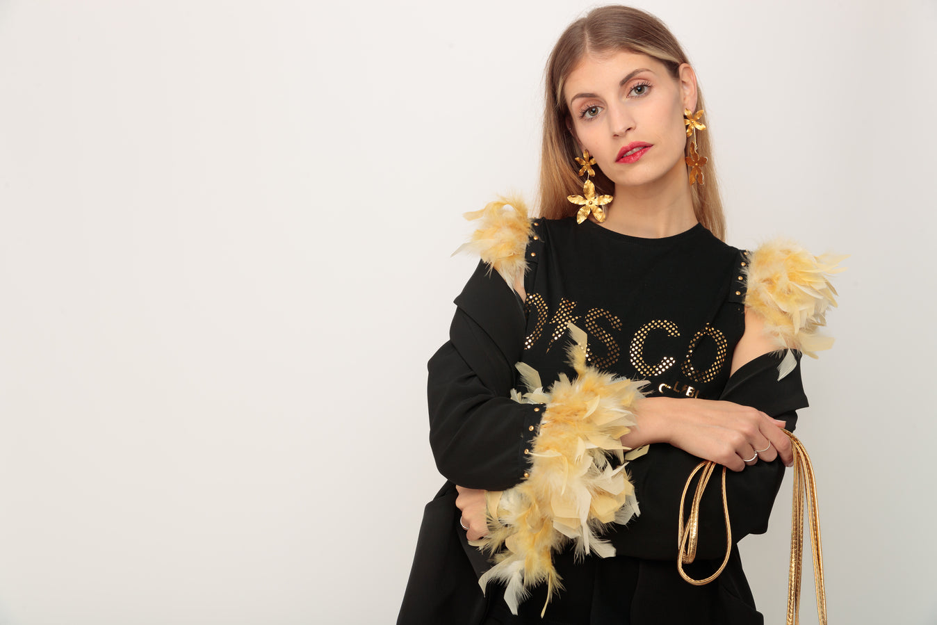 Blazer corte smoking, forrada y con bolsillos. Detalle de plumas en color dorado en el puño. Confeccionada en tejido tipo crep con elastano.