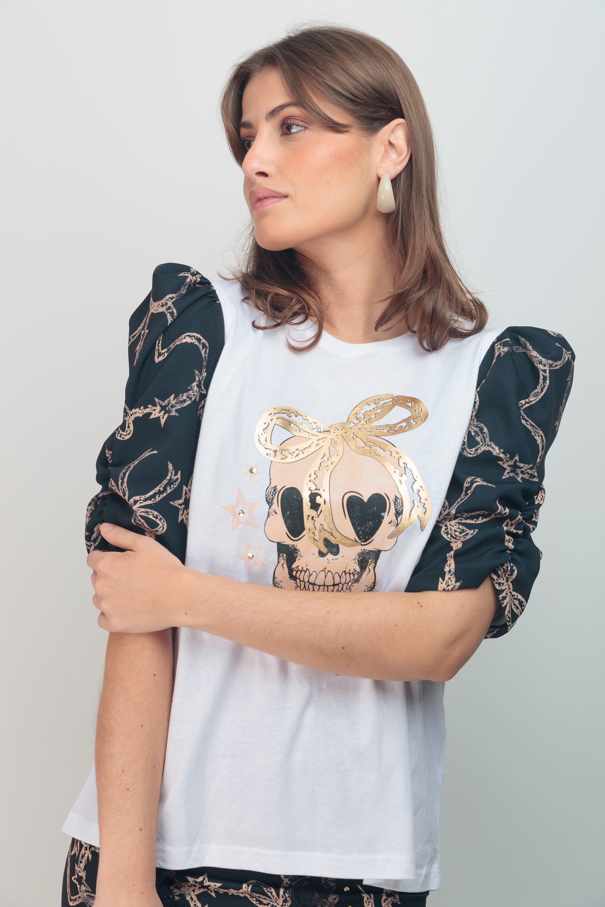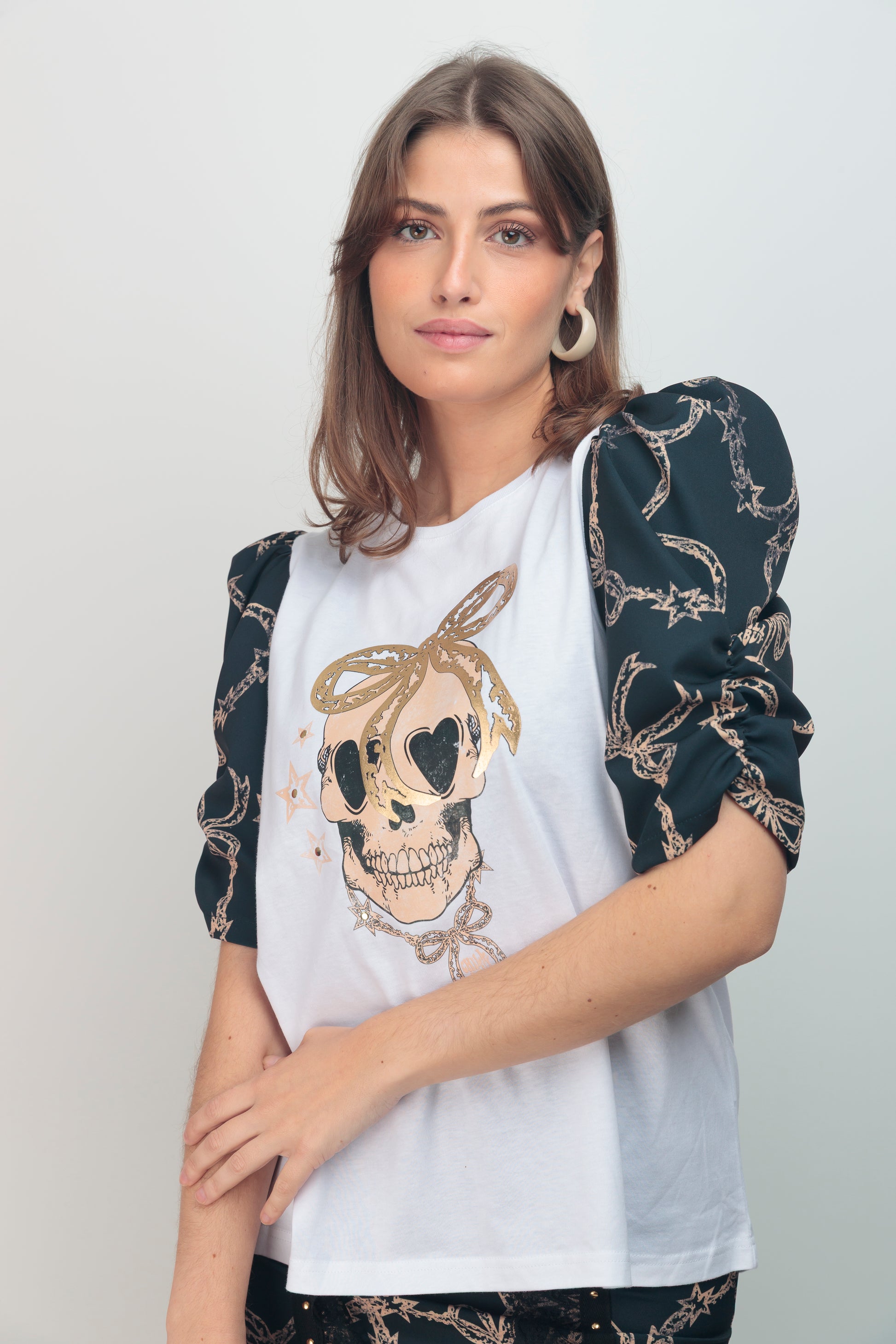 Camiseta de algodón puro con cuello redondo que ofrece comodidad y versatilidad. Corte evasé que proporciona libertad de movimiento y una silueta moderna y favorecedora. Bajo asimétrico que equilibra las proporciones de la prenda. Mangas abullonadas con fruncido vertical que crean volumen estructurado justo por encima del codo, un detalle de diseño que eleva el conjunto. Detalle frontal que marca el carácter editorial de la pieza. Una camiseta versátil que funciona tanto en looks minimalistas como en propuestas más elaboradas.