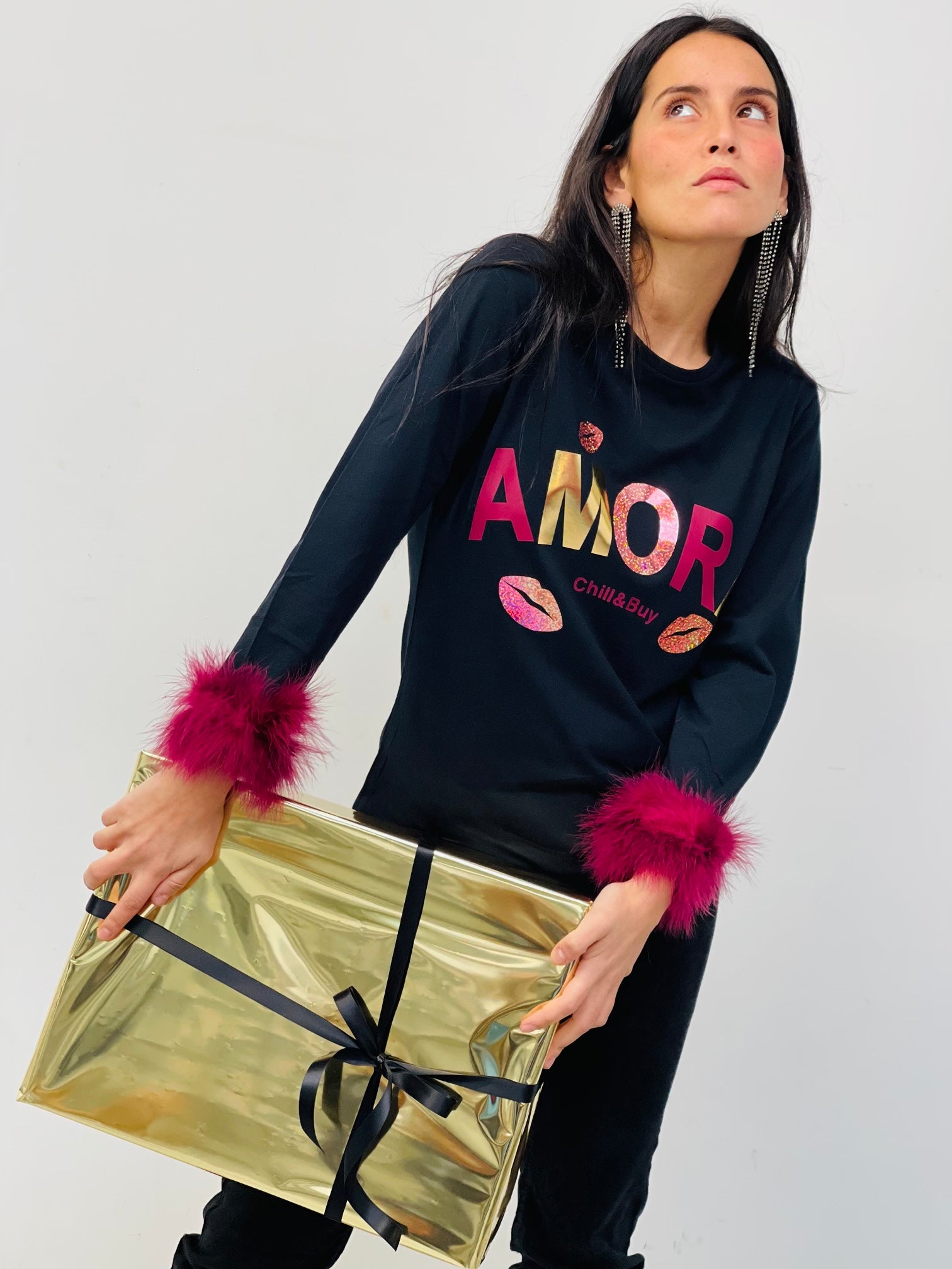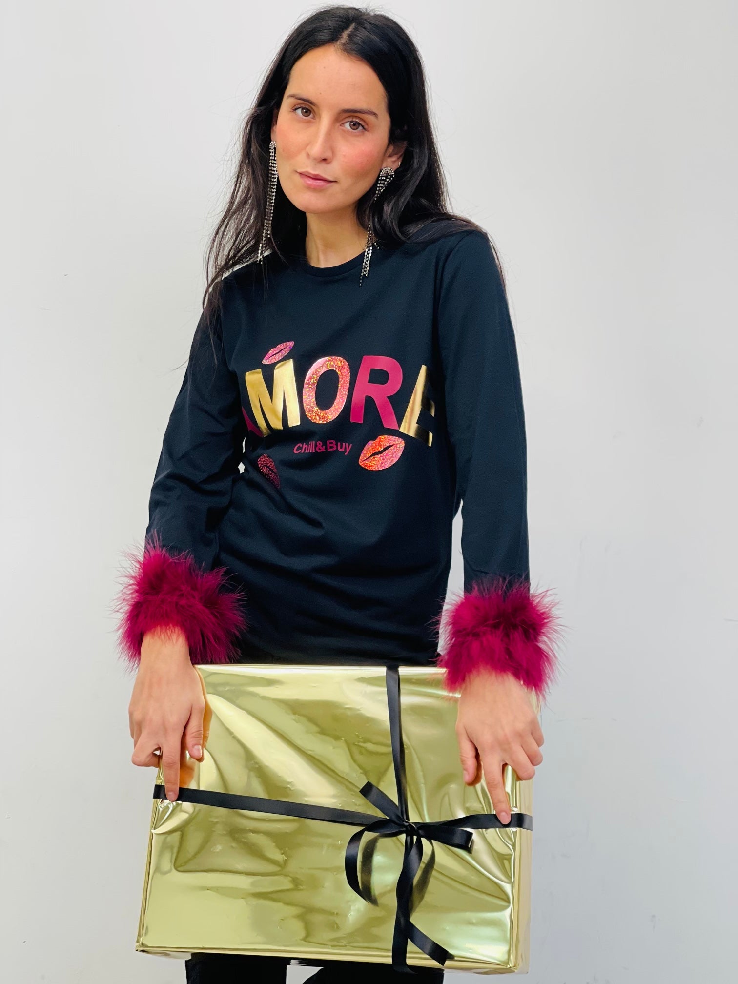 Camiseta manga larga en color negro con cuello redondo, corte entallado y bajo recto. Detalle de fleco de marabú en los puños. Diseño frontal de la palabra Amore. Confeccionado en Vigo.
