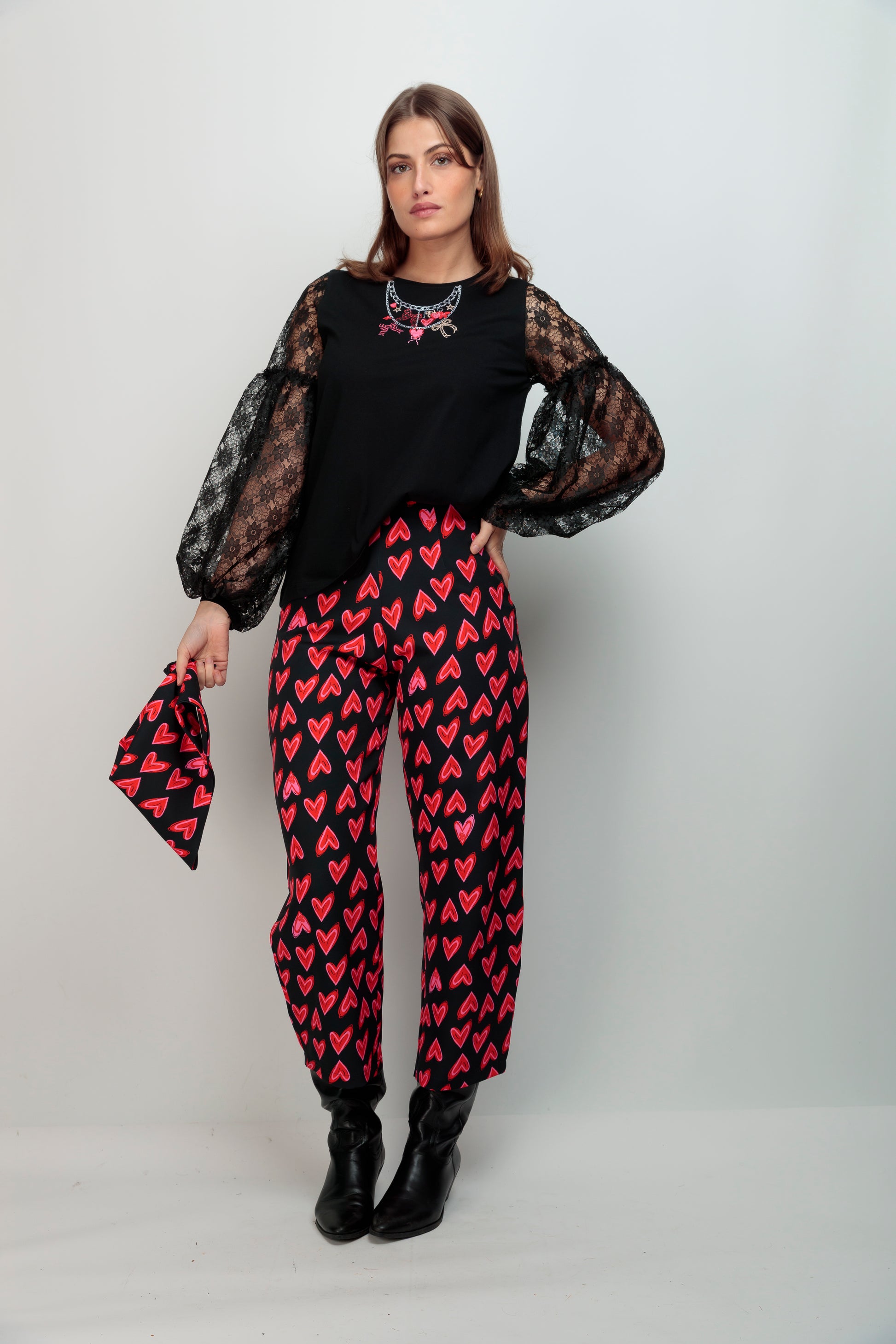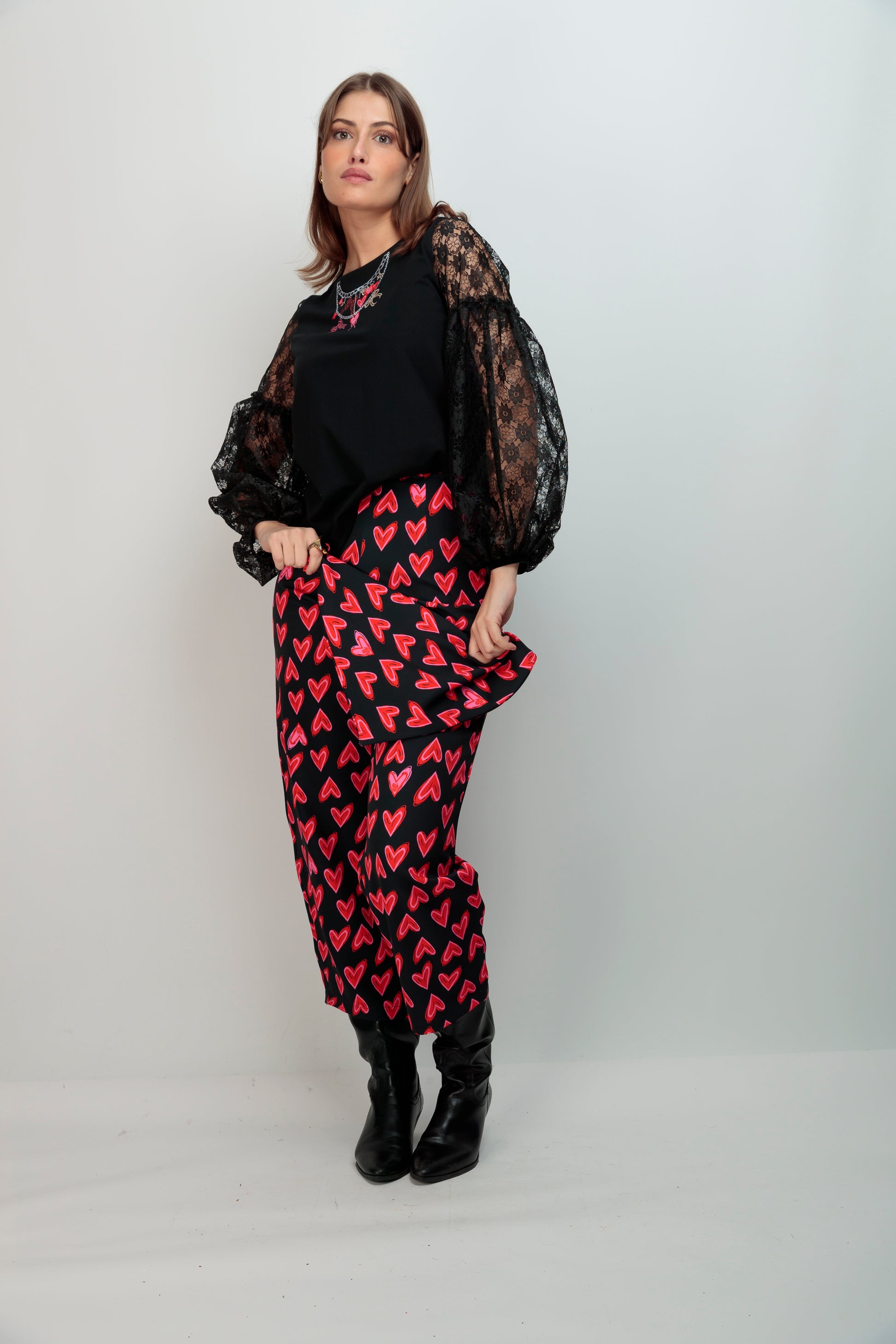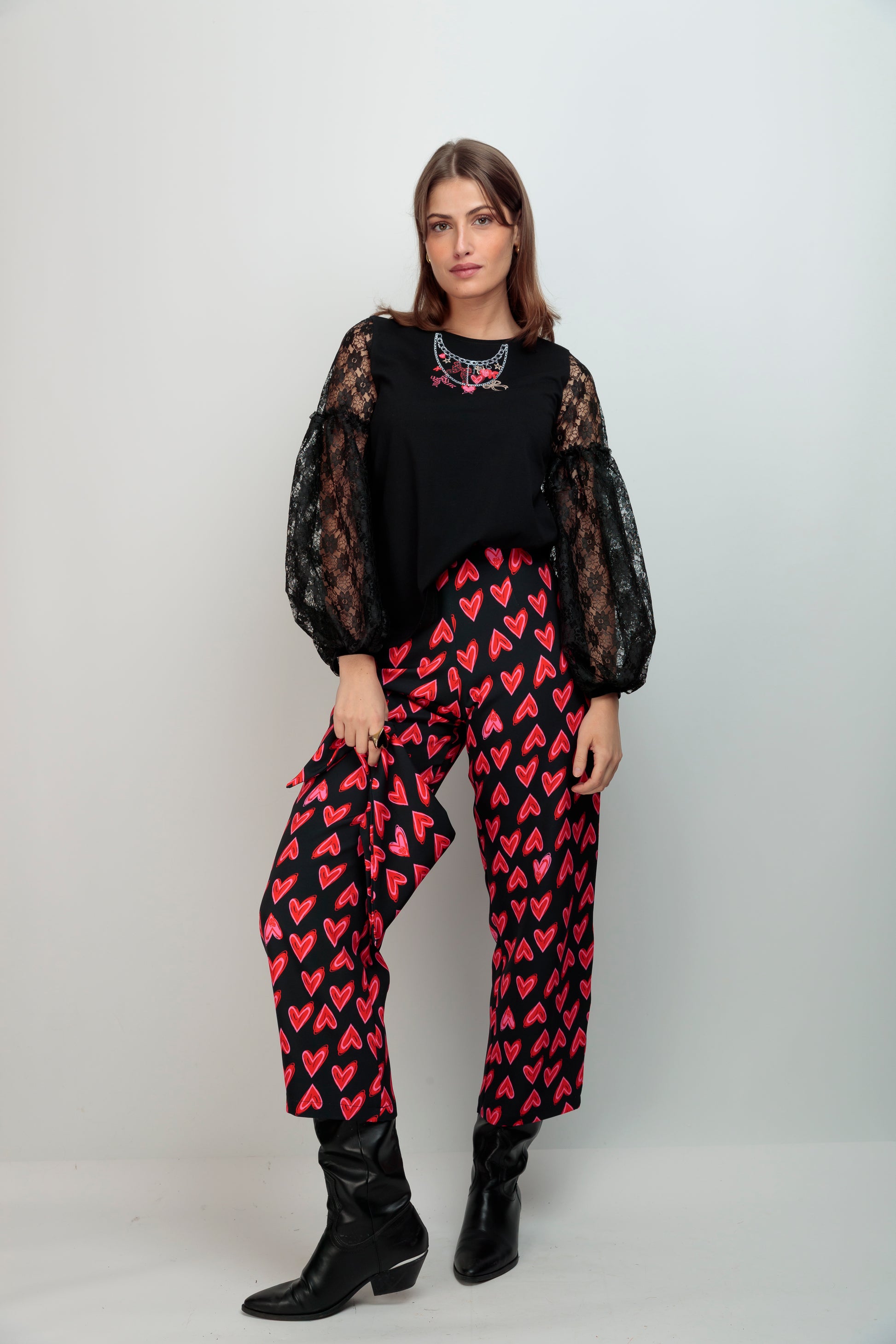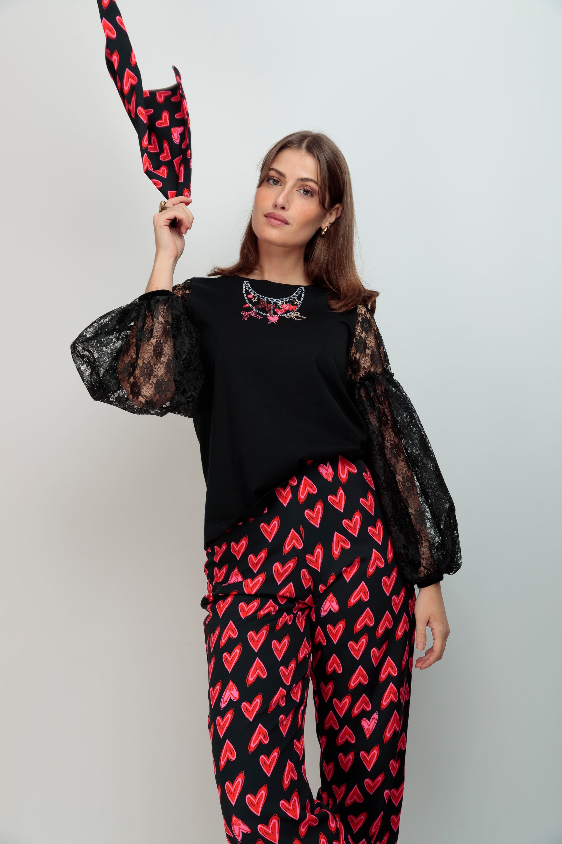 Camiseta de algodón con cuello redondo y corte evasé que crea una silueta fluida y elegante. Destaca por su bajo asimétrico y mangas largas abullonadas con detalles de corte en el brazo, rematadas con puños de terciopelo que añaden textura y sofisticación. Un diseño frontal que combina comodidad con presencia editorial, perfecto para crear looks versátiles que transitan del día a la noche.