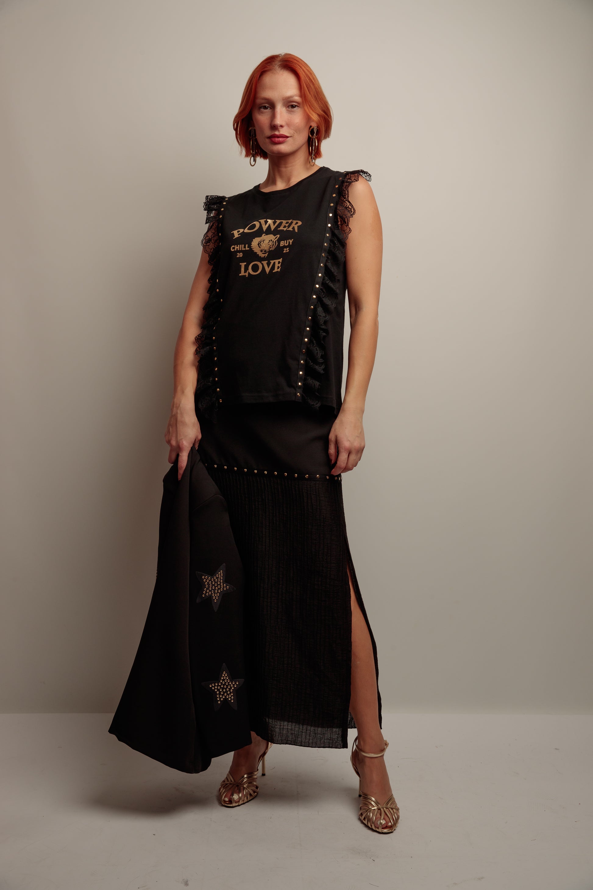 Camiseta de algodón con cuello redondo, corte evasé y bajo asimétrico. Detalle de blonda de encaje en color negro en el frontal rematada con tira de tachuelas metálicas en color dorado. Estampación frontal en color dorado.