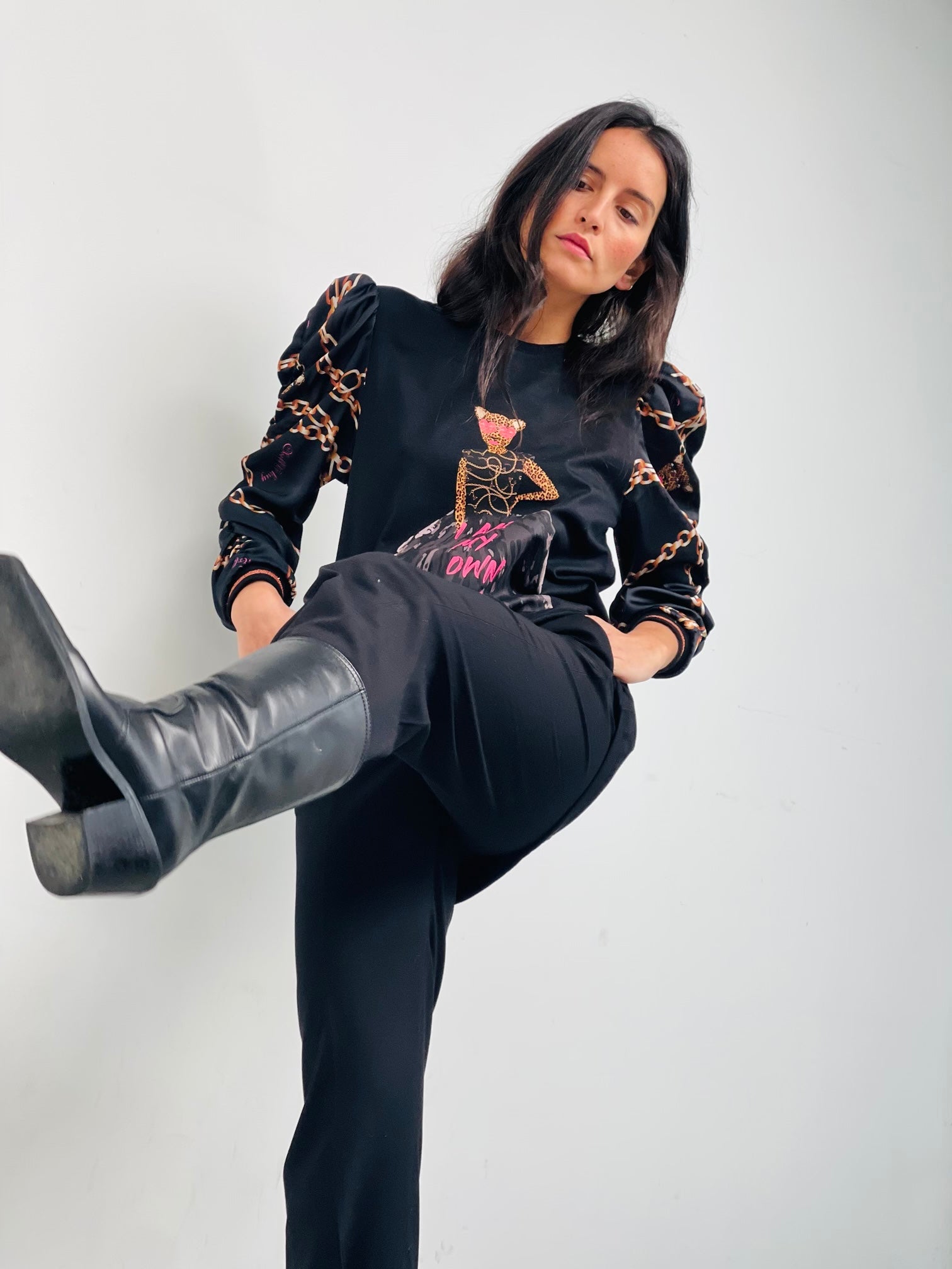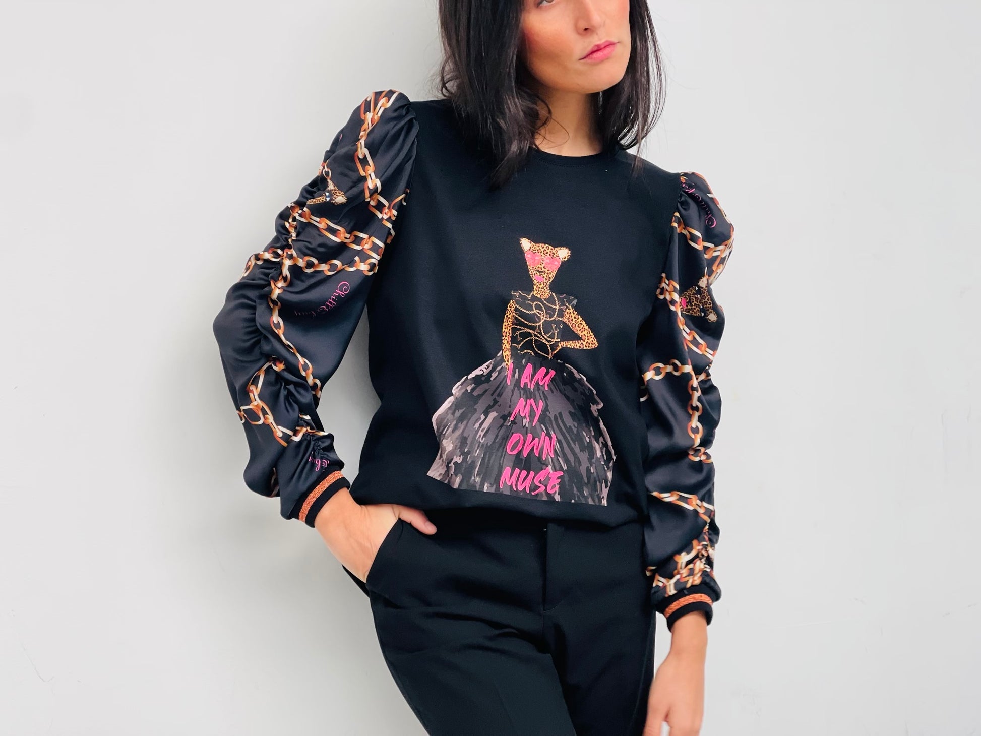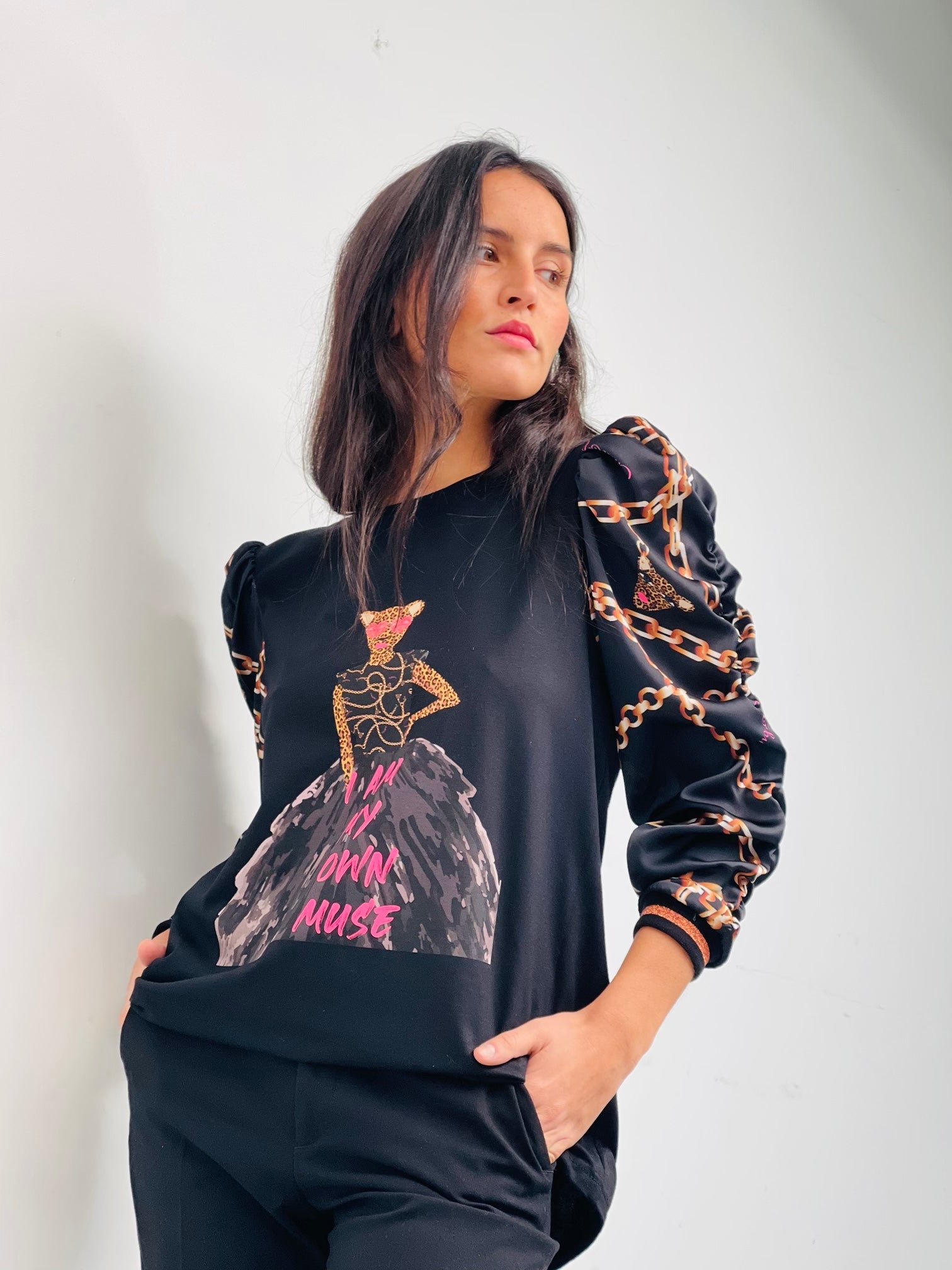 Camiseta de algodón en color negro, con cuello redondo, corte evasé y bajo asimétrico. Detalle de manga larga abullonada con frunces y puño de rib en color negro.