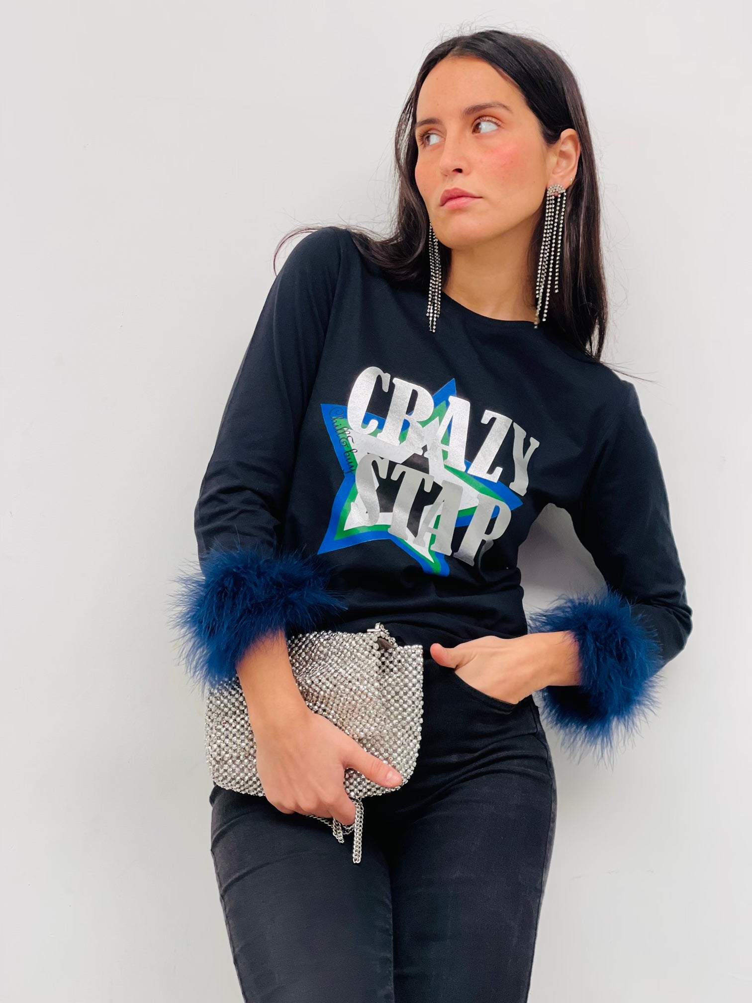 Camiseta de algodón en color negro con cuello redondo, corte entallado y bajo recto. Manga larga con detalle de fleco marabú en color azulón en el puño. Estampación frontal a contraste. Confeccionado en Vigo.