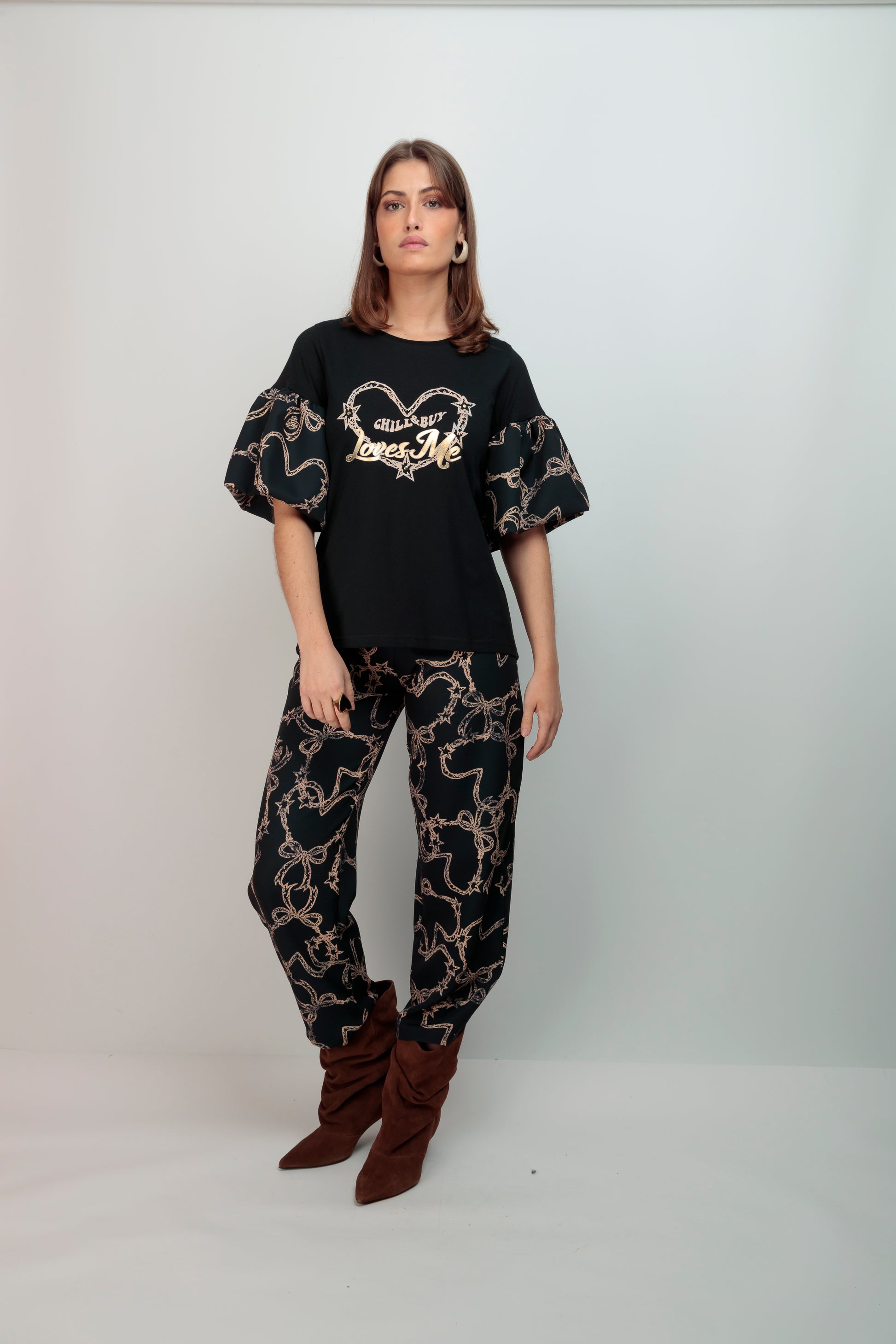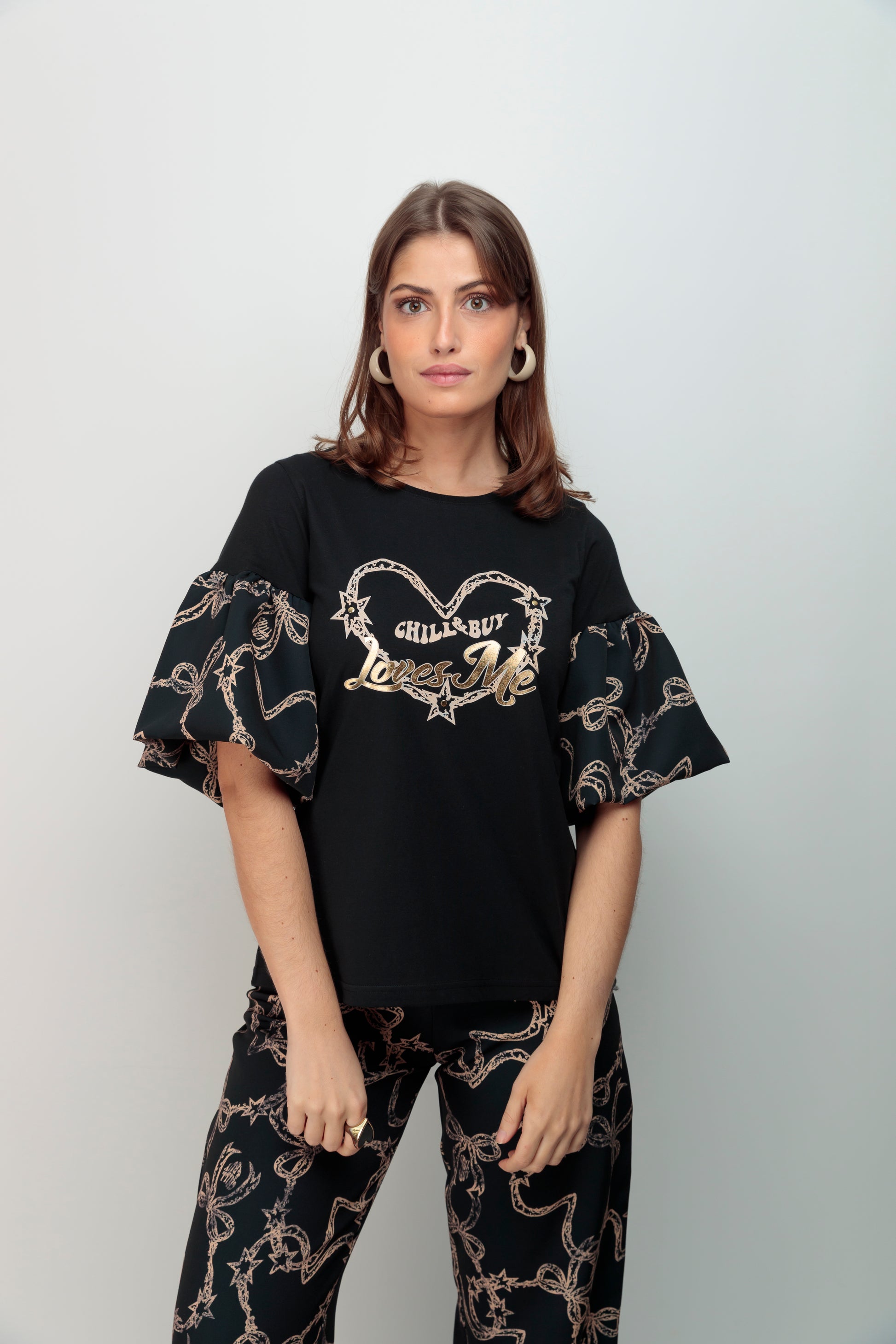 Camiseta de algodón premium con cuello redondo y corte evasé que favorece la silueta. Bajo asimétrico que añade movimiento y sofisticación al diseño. Mangas cortas con volante doble estampado que aporta textura y dinamismo. Detalles dorados en el frente que elevan el look con un toque de lujo editorial. Pieza versátil para crear outfits de día con carácter y presencia.