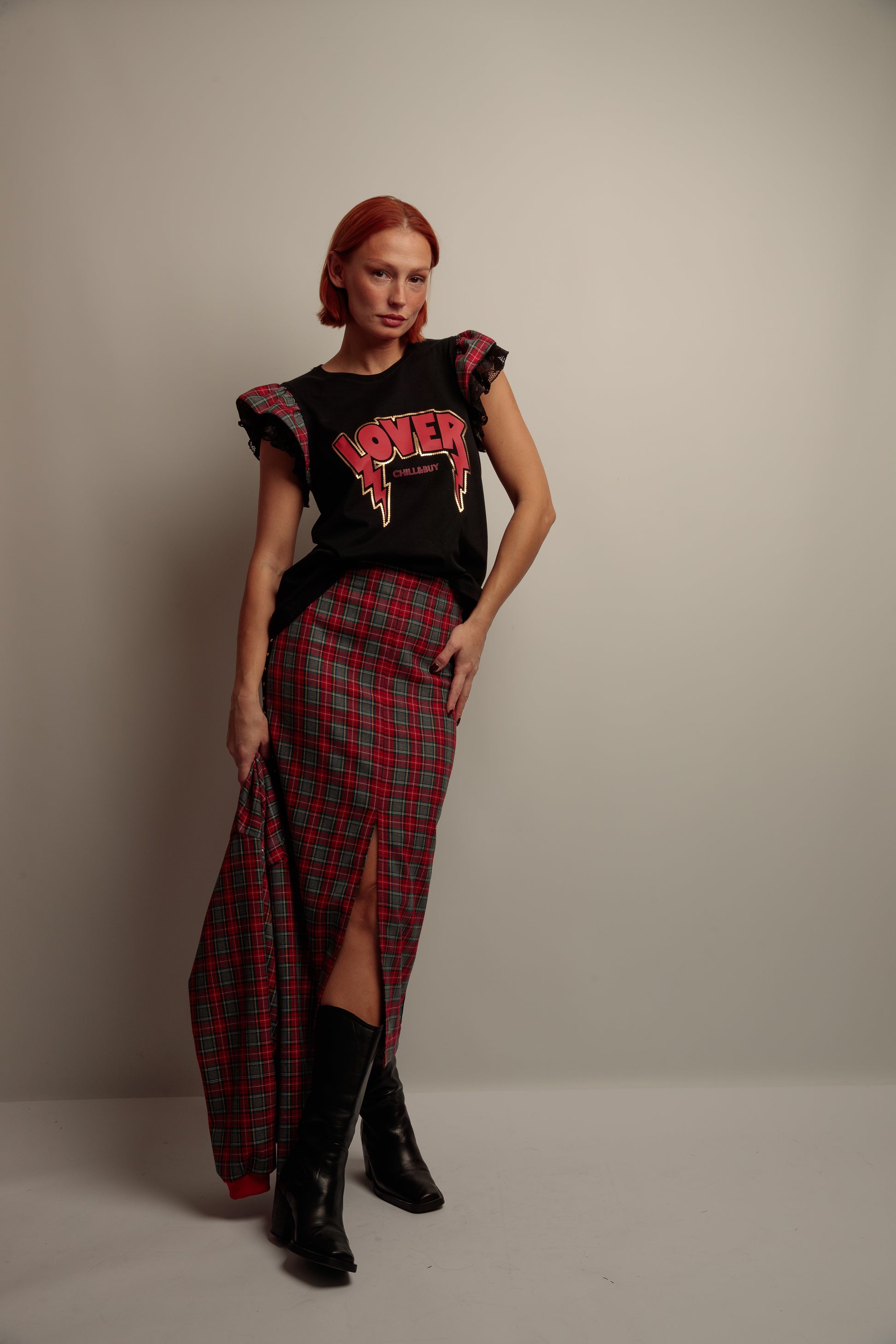 Camiseta de algodòn con cuello redondo, corte evasé y bajo asimétrico. Detalle de dos volantes en la sisa, combinando tejidos. Estampación frontal. Confeccionado en Vigo.