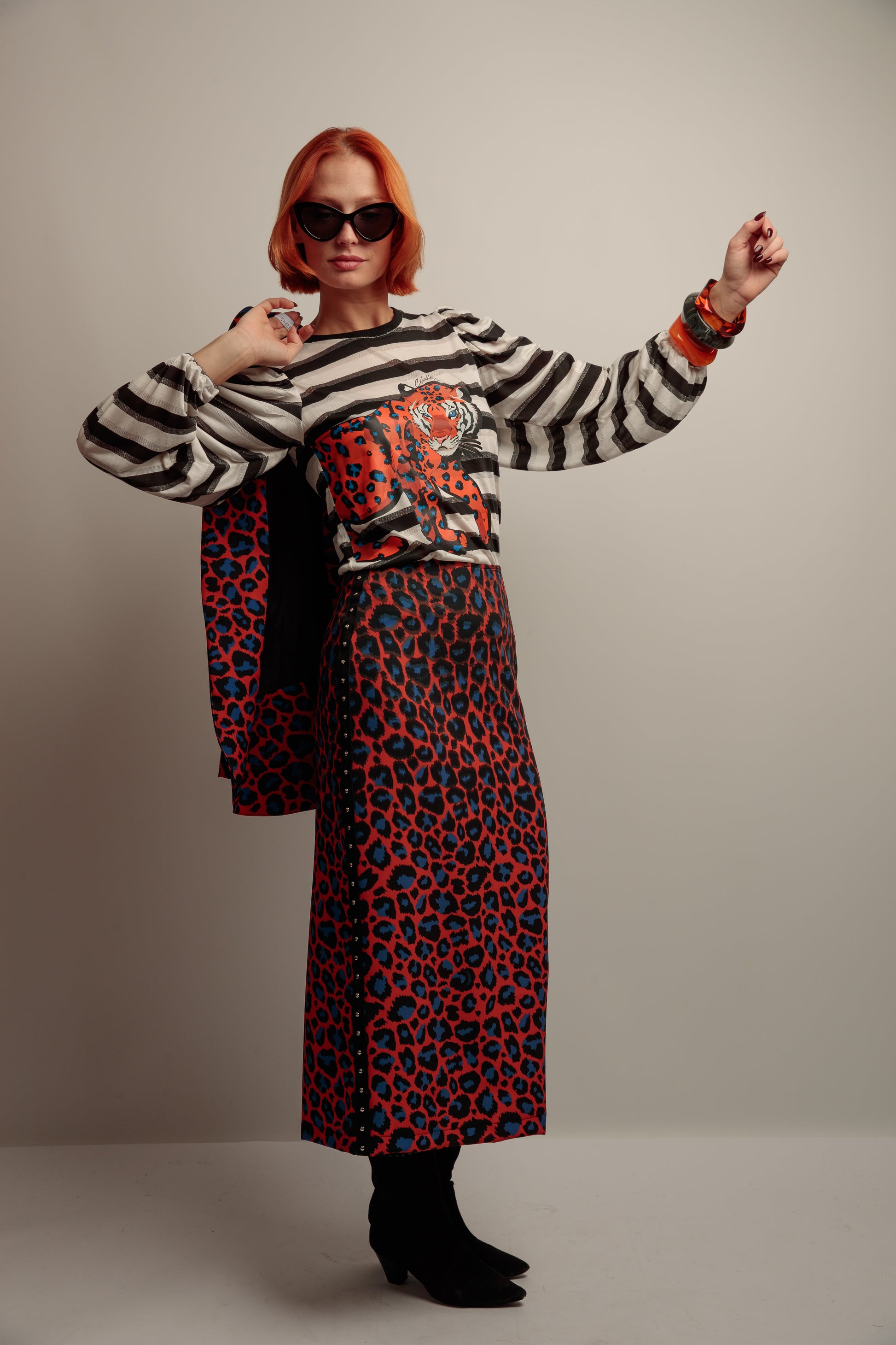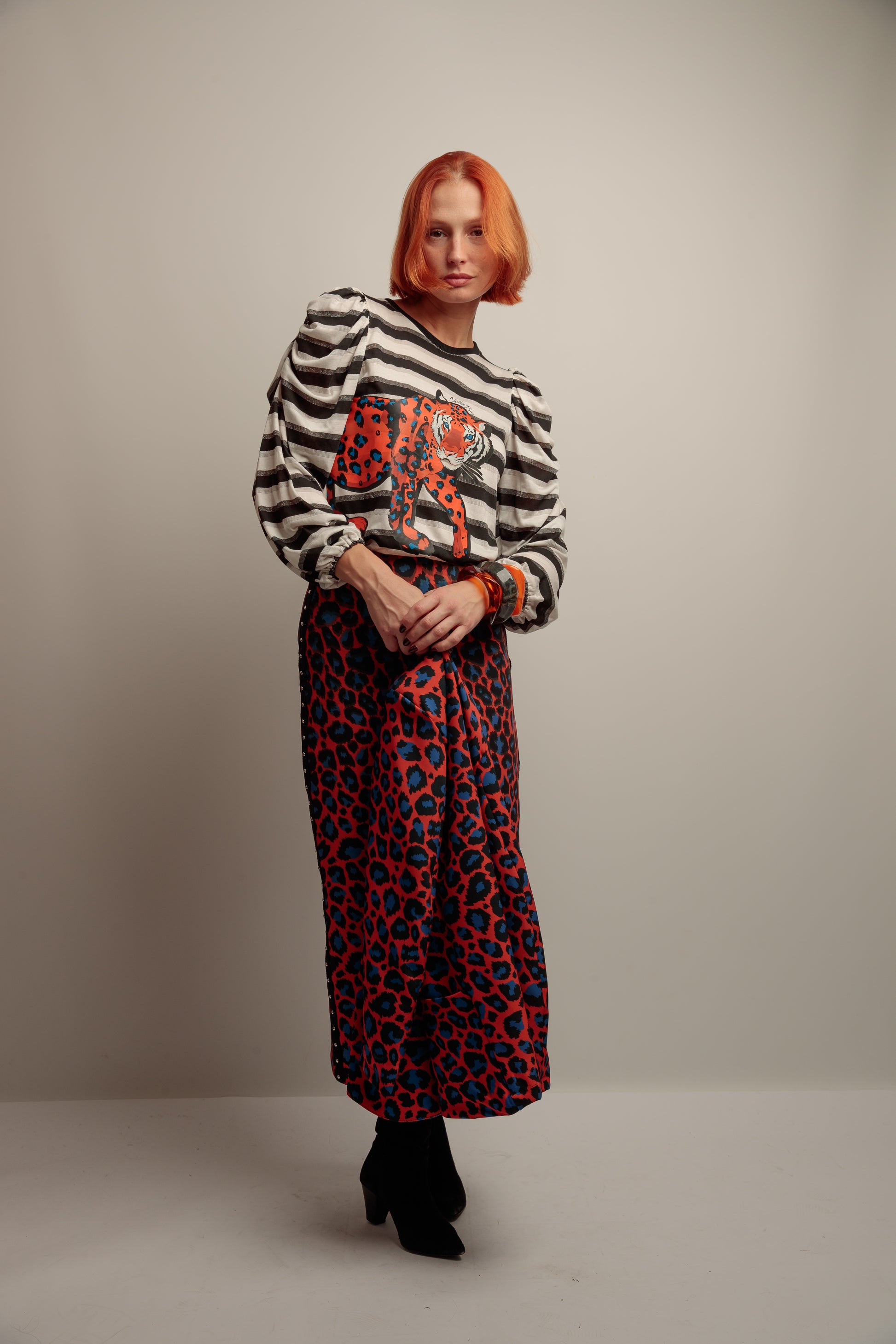 Camiseta de algodón con cuello redondo, corte evasé y bajo asimétrico. Detalle de manga larga abullonada con goma en el puño. Confeccionado en tejido algodón de rayas en color blanco y negro con hilatura de lurex color plateado. Estampación frontal a contraste. Confeccionado en Vigo.