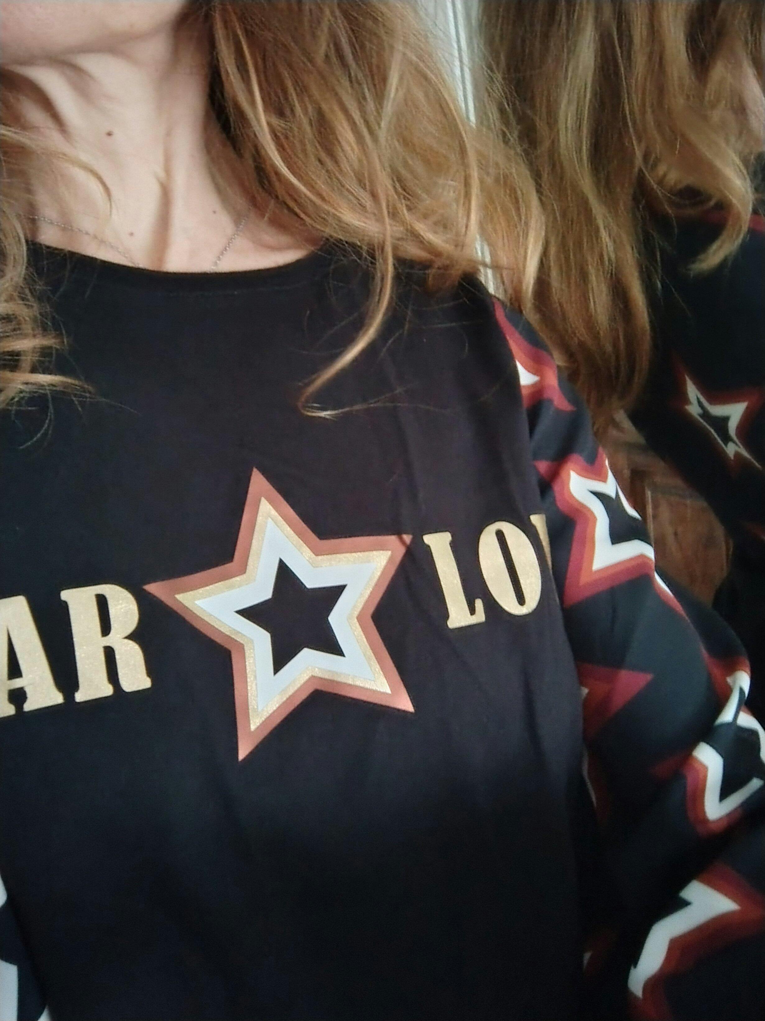 Camiseta de algodón en color negro, con cuello redondo, corte evasé y bajo asimétrico. Detalle de manga larga campana en tejido estampado con detalle de combinación de tejidos. Estampación frontal a tono.