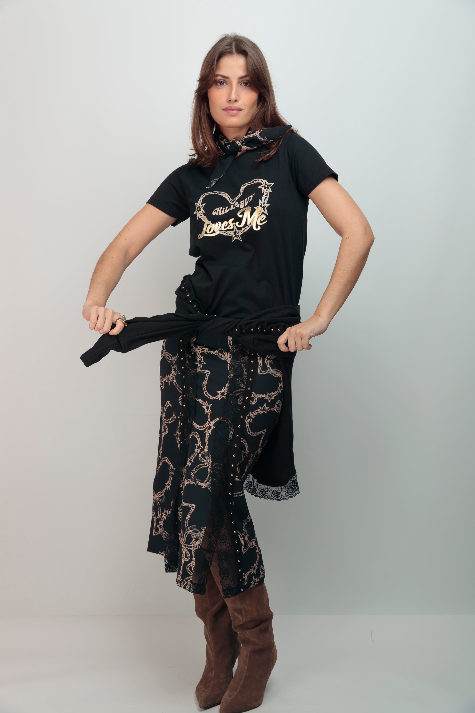 Camiseta de algodón manga corta con una silueta que prioriza el movimiento. El corte evasé fluye naturalmente desde el torso, mientras que el bajo asimétrico introduce una línea de interés visual. El detalle frontal combina un corazón con la frase "Loves Me" en dorado, creando un punto focal que transmite calidez sin perder sofisticación. Una pieza que funciona tanto como básico elevado como protagonista en looks más minimalistas.