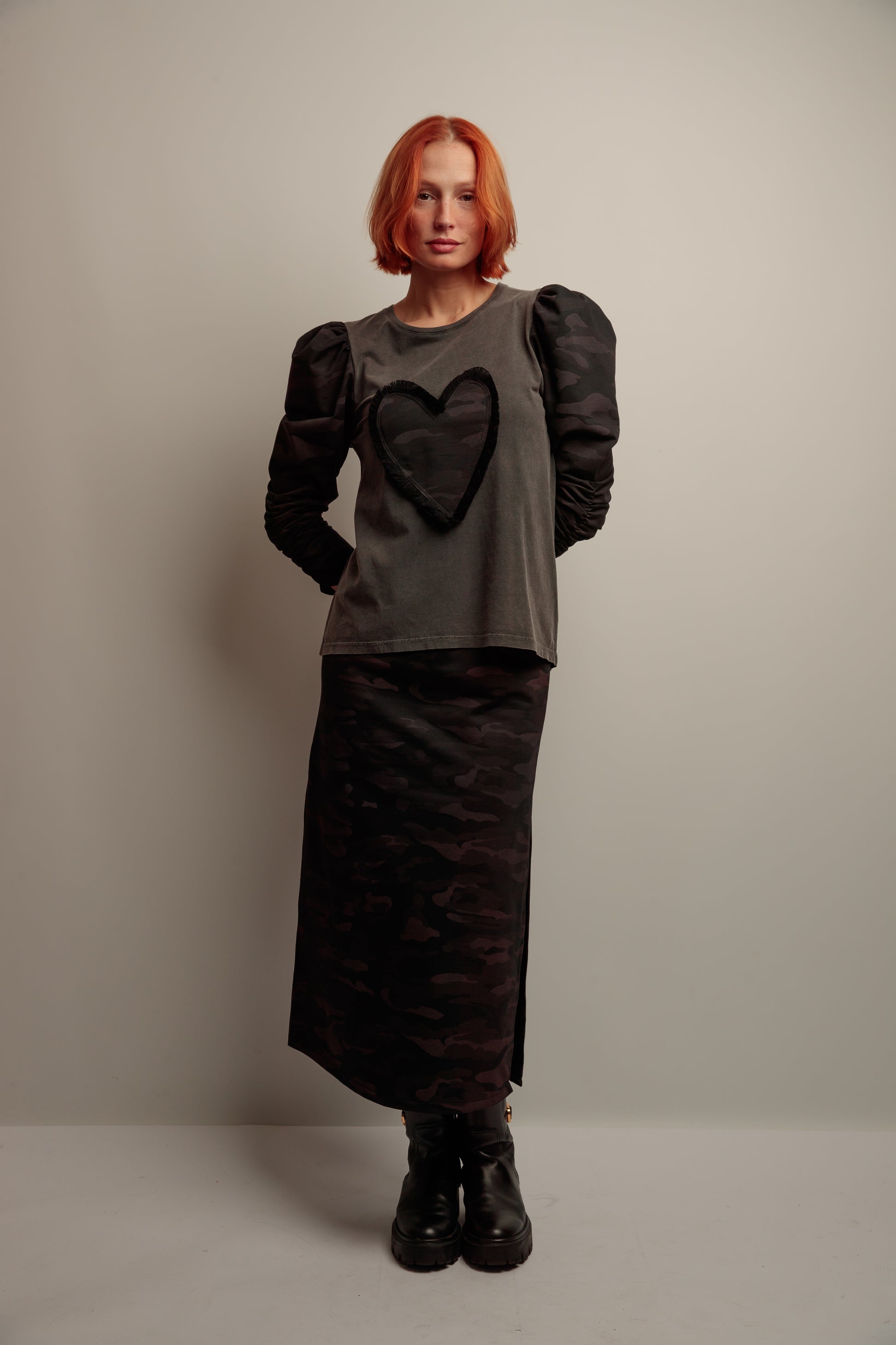 Camiseta cuello redondo lavada en color negro, con corte evasé y bajo asimétrico. Detalle de manga larga abullonada en tejido estampado camuflaje negro con tonos grises. Diseño de corazón de tejido camuflaje rematada con flecos negros en el frontal. Confeccionada en Vigo.