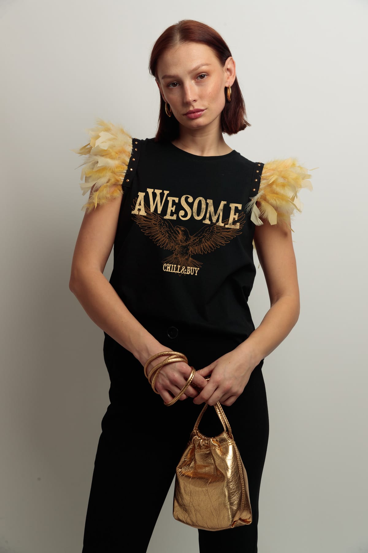 Camiseta de algodón, con cuello redondo, corte evase y bajo asimétrico. Detalle de plumas en color dorado rematadas con tira de tachuelas en color dorado a tono con el diseño frontal. Las plumas se pueden meter en la lavadora en un programa delicado y dejar secar al aire libre.