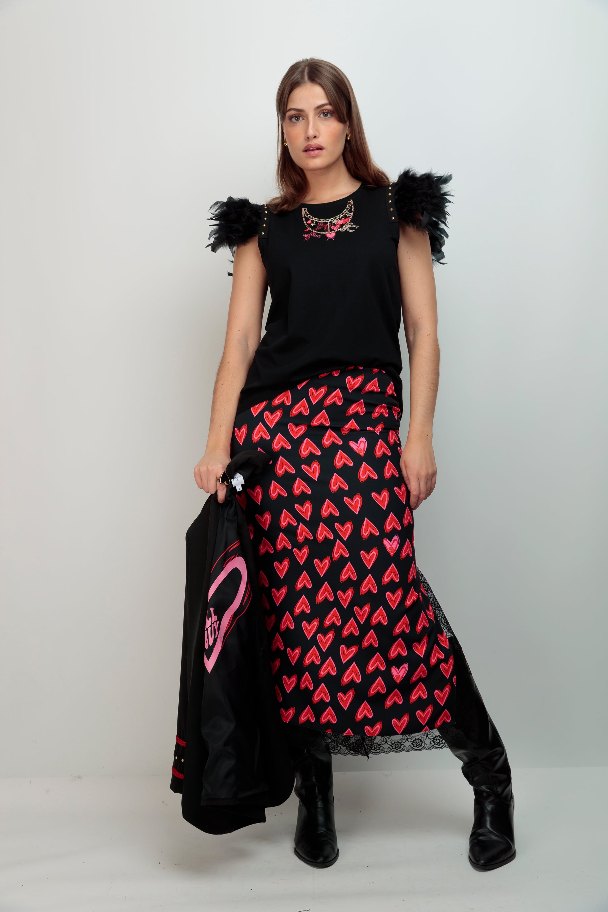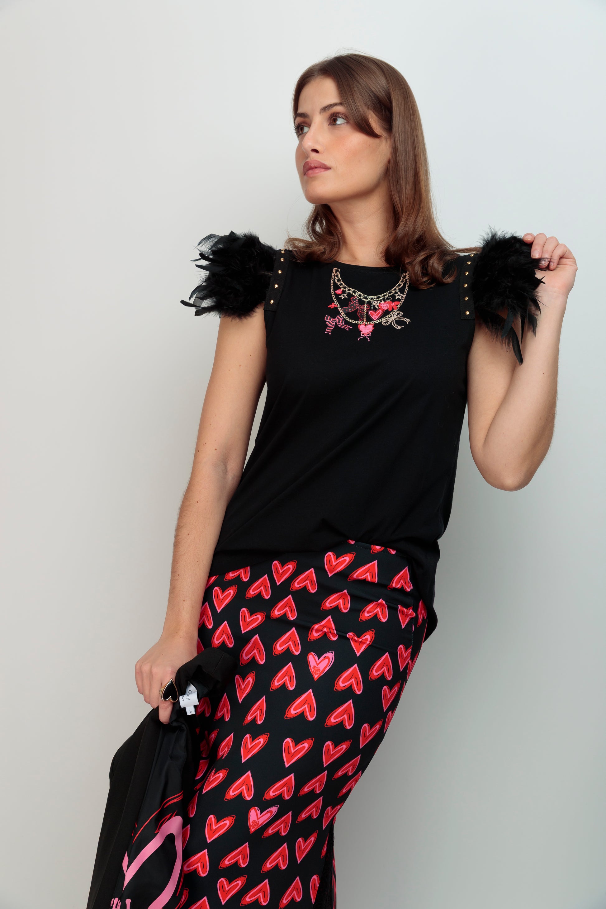 Camiseta de algodón con cuello redondo y corte evasé que abraza la silueta con elegancia. El bajo asimétrico añade movimiento y sofisticación al diseño. El detalle distintivo: plumas negras en el hombro rematadas con una tira de tachuelas doradas que capturan la luz y elevan el look cotidiano a una declaración de estilo. Pieza versátil que transita del día a la noche con presencia editorial.