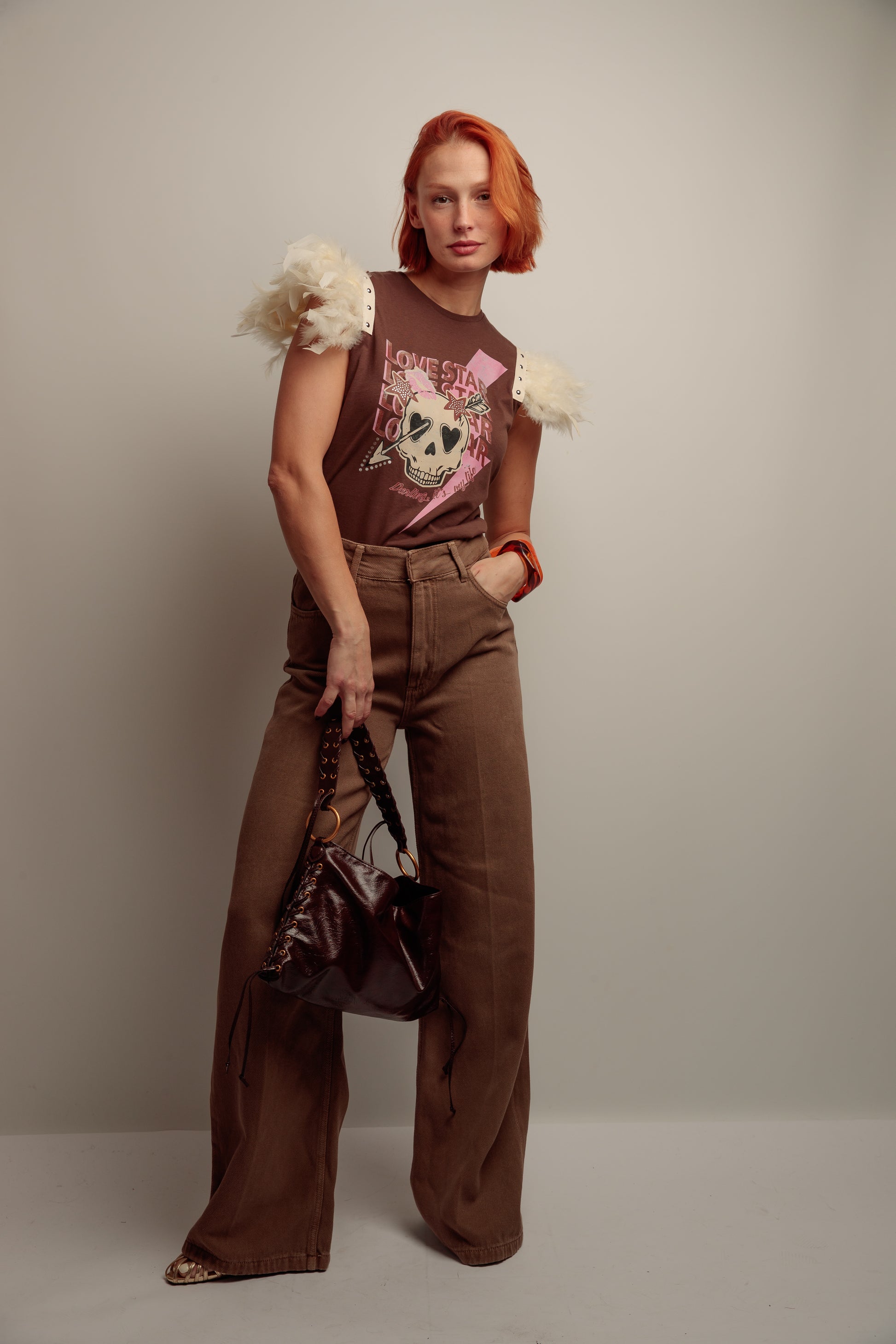 Camiseta básica de algodón con cuello redondo, corte entallado y bajo recto. Detalle de plumas en color beige rematadas con tira de tachuelas metálicas en color plata. Diseño frontal. Confeccionado en Vigo.