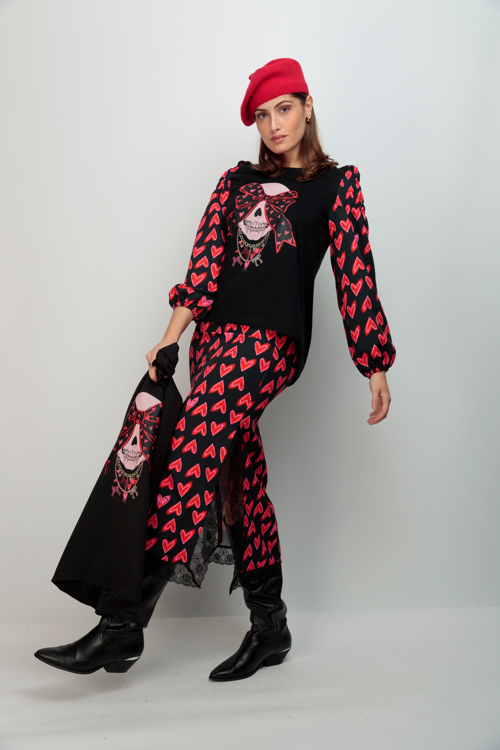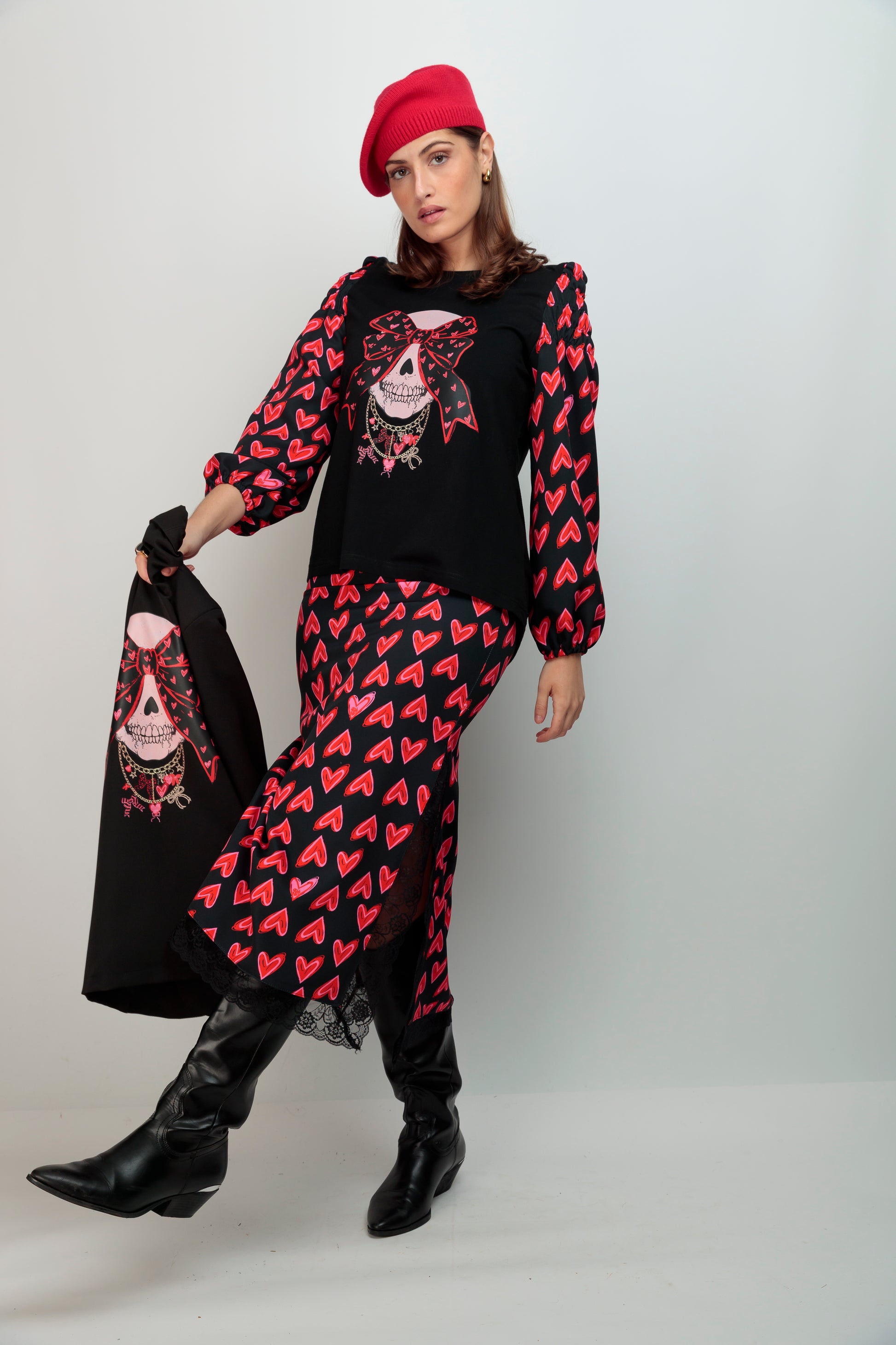 La Camiseta Reina Skull Collares es tu aliada para looks con actitud. Elaborada en algodón puro, luce un diseño frontal de una calavera adornado con un lazo que captura toda la atención. Su cuello redondo, corte evasé y bajo asimétrico crean una silueta dinámica y favorecedora, mientras que las mangas largas con fruncido elástico en la copa aportan un toque juguetón y contemporáneo. Una prenda que mezcla sofisticación con diversión.