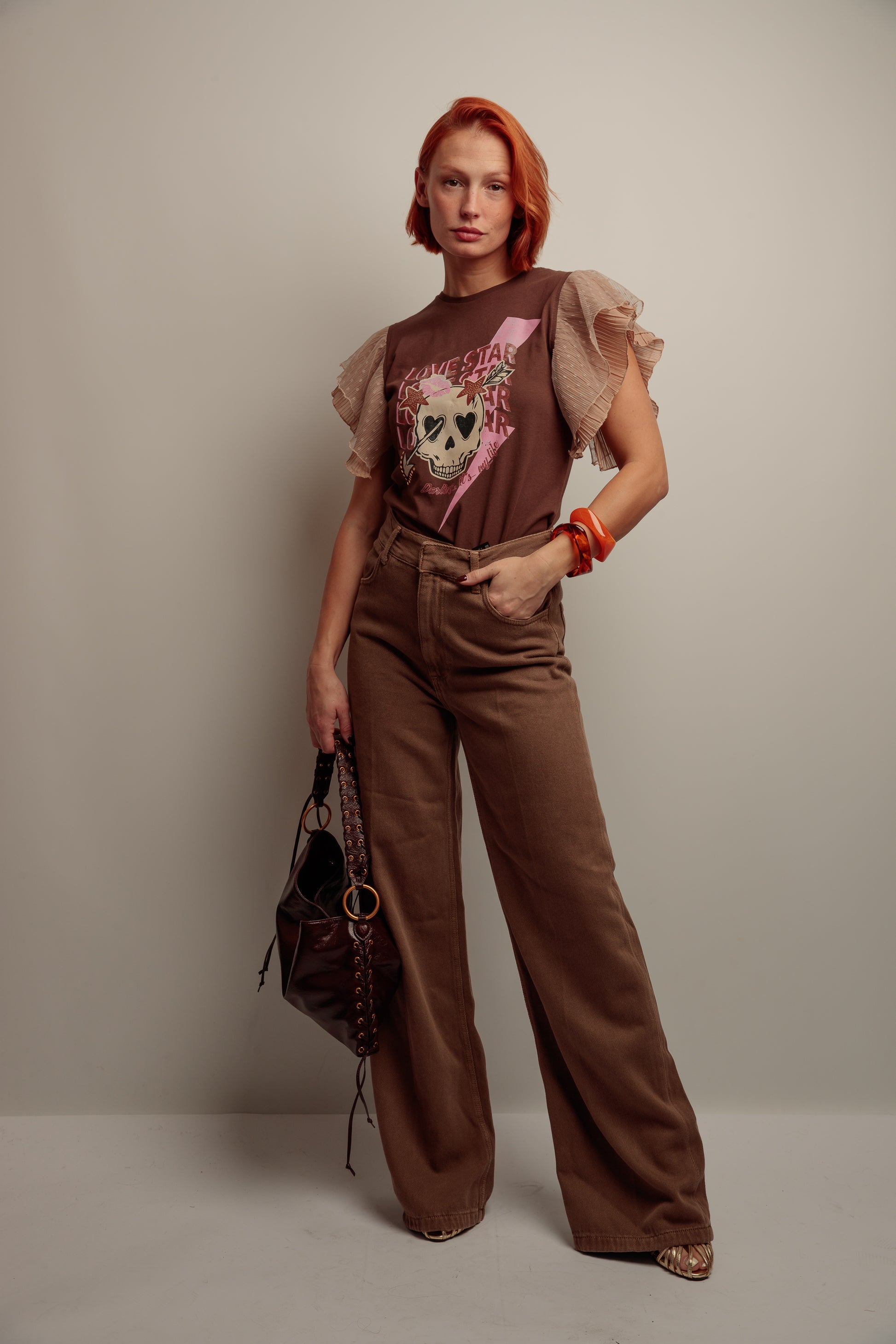 Camiseta de algodón con cuello redondo, corte entallado y bajo recto. Detalle de volantes doble de tul en el hombro en tono beige a contraste. Estampación frontal. Confeccionado en Vigo.