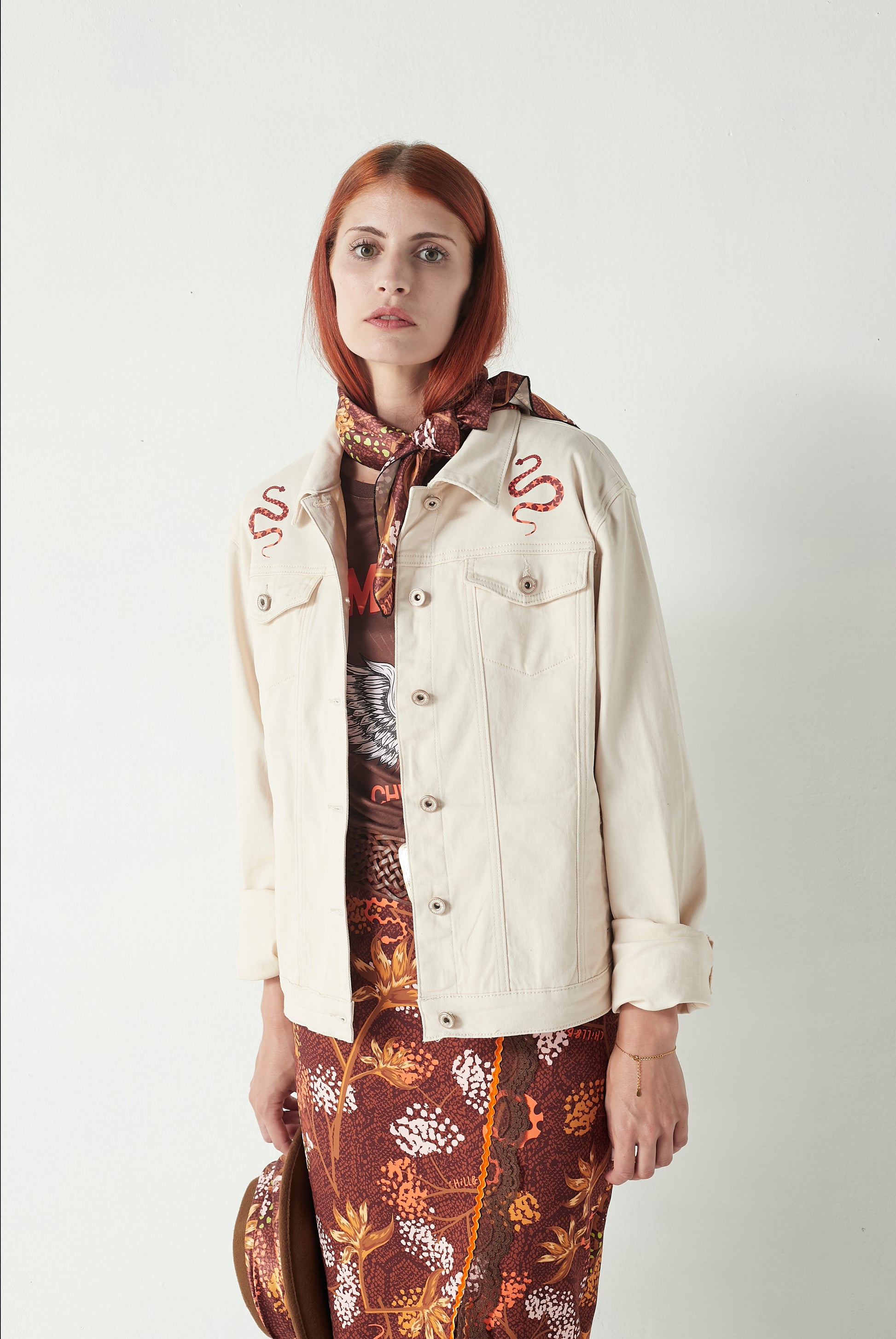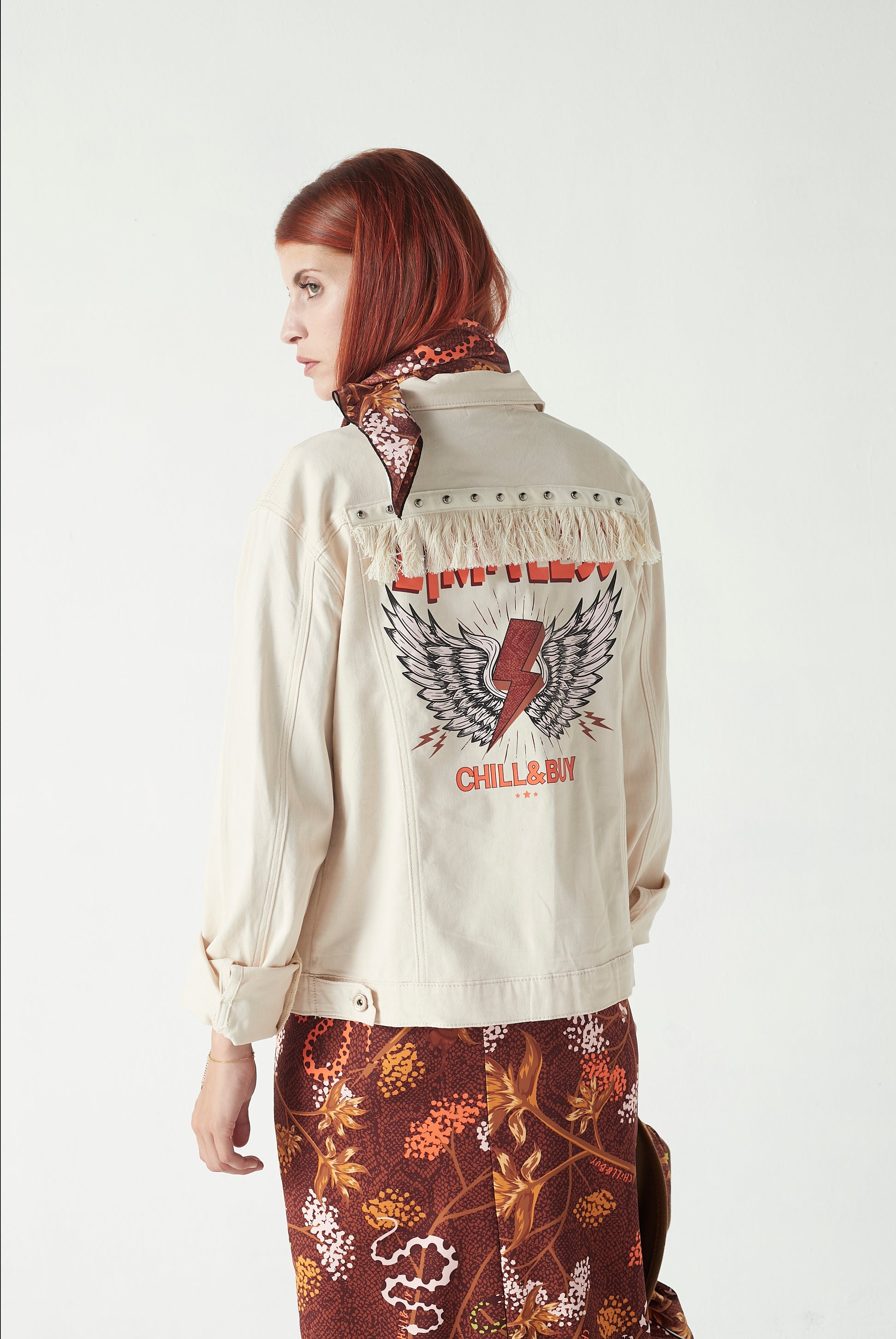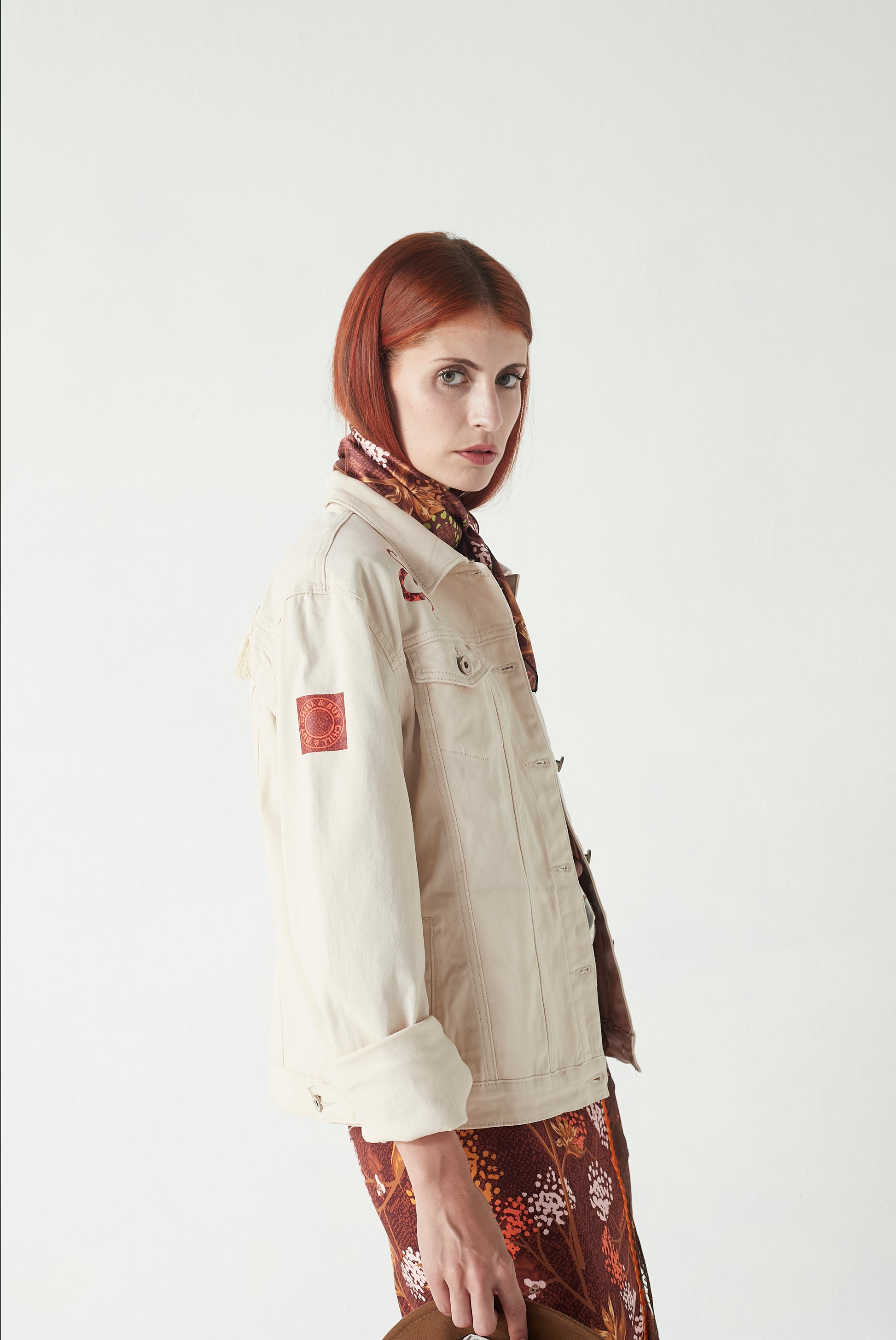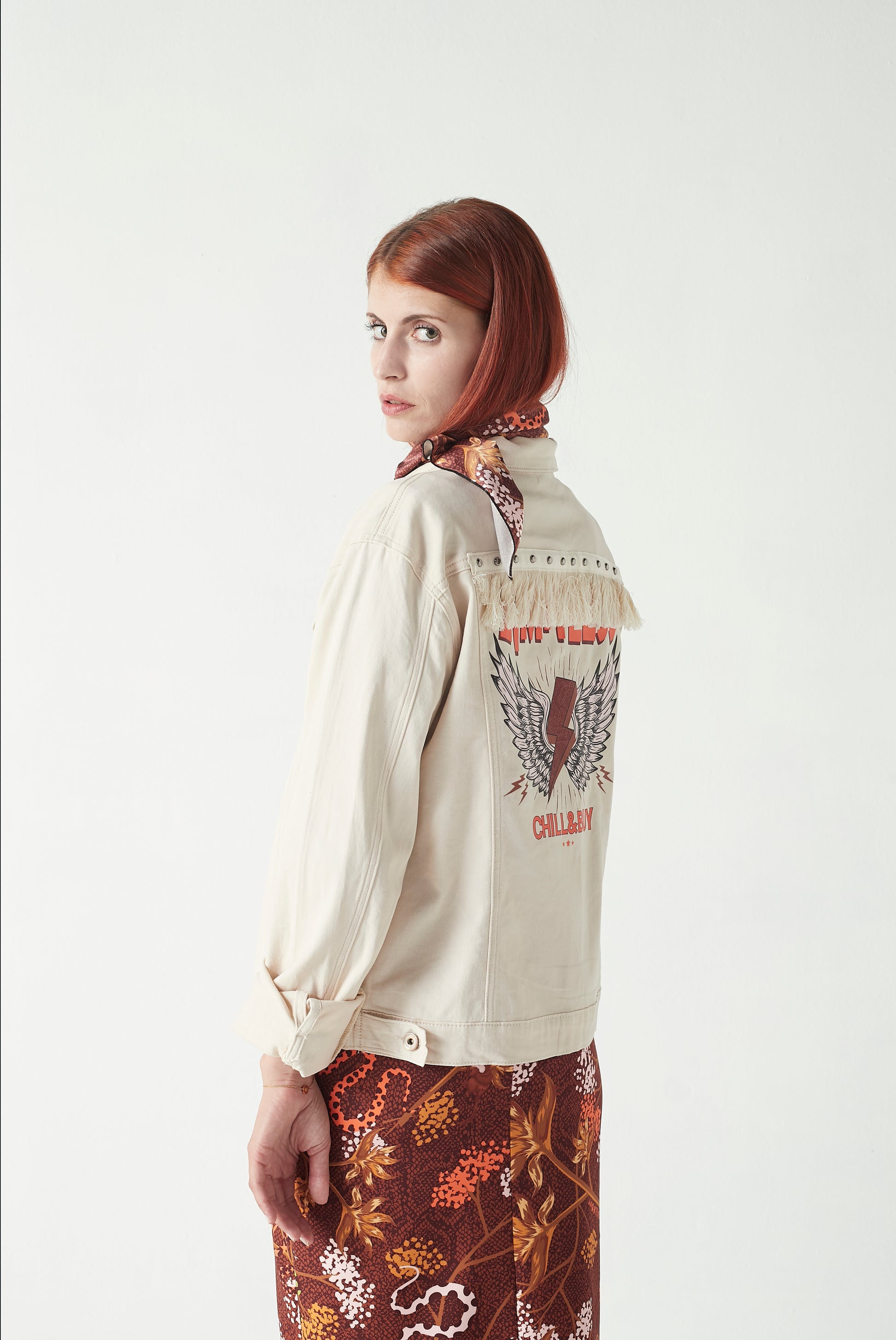 Cazadora entallada en denim elástico color blanco roto, diseñada para aportar estilo y personalidad con un toque distintivo en cada detalle.