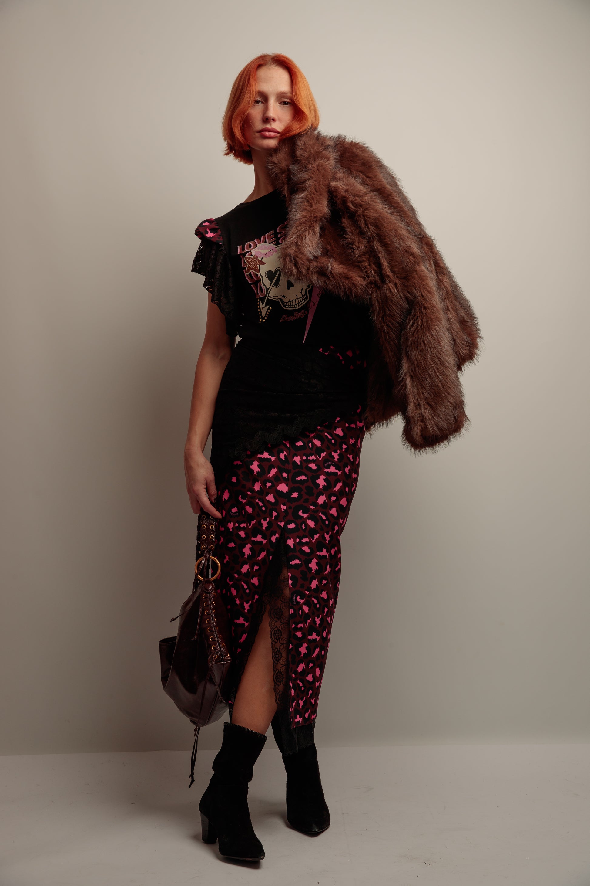 Falda recta larga, sin cinturilla, con corte limpio y talle alto para un efecto más estilizado, con abertura delantera y cierre con cremallera oculto en la espalda. Detalle de blonda de encaje en el bajo y en la abertura. Confeccionado en tejido estampado en animal print base negra y rosa. Confeccionado en Vigo.