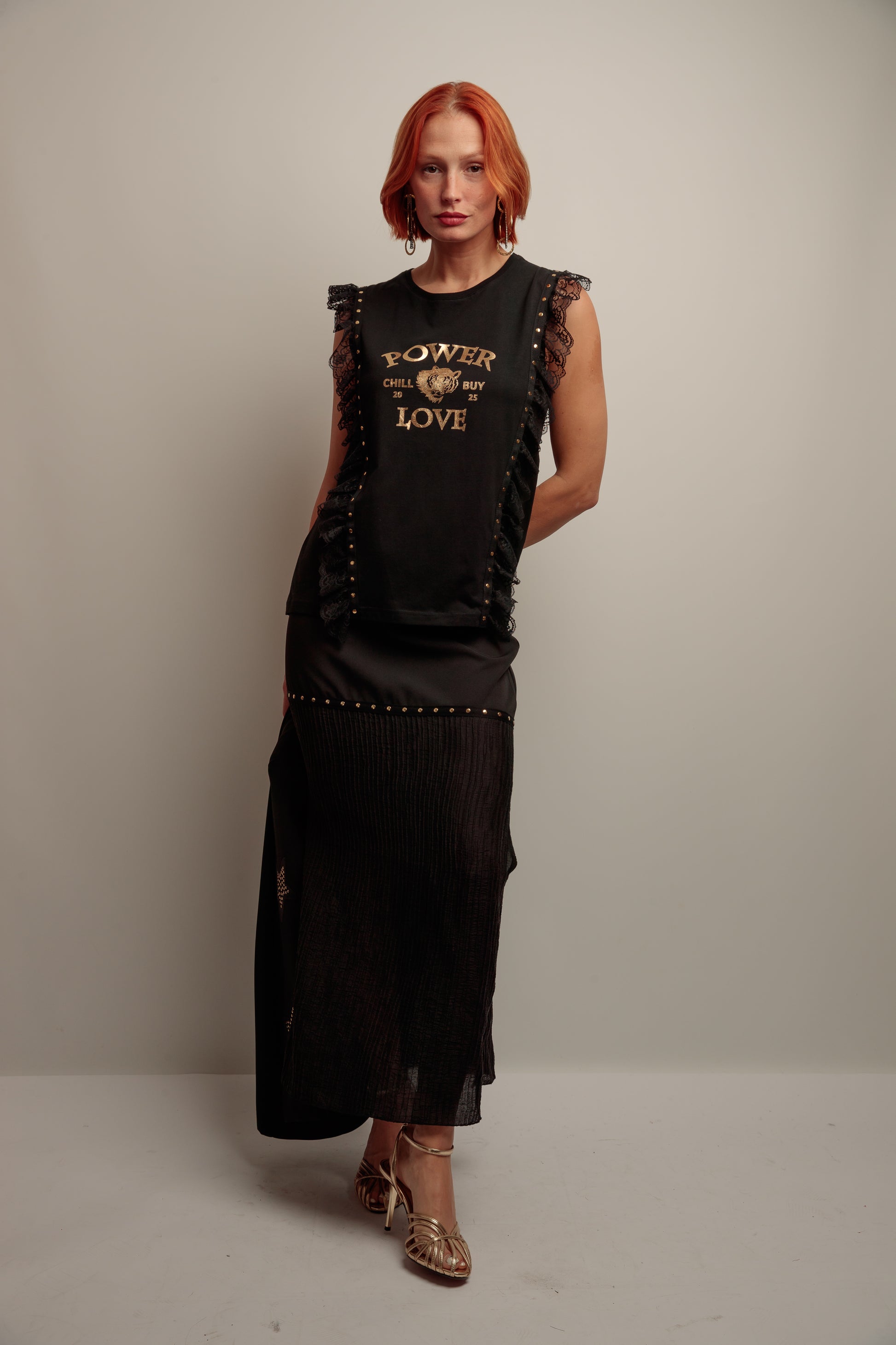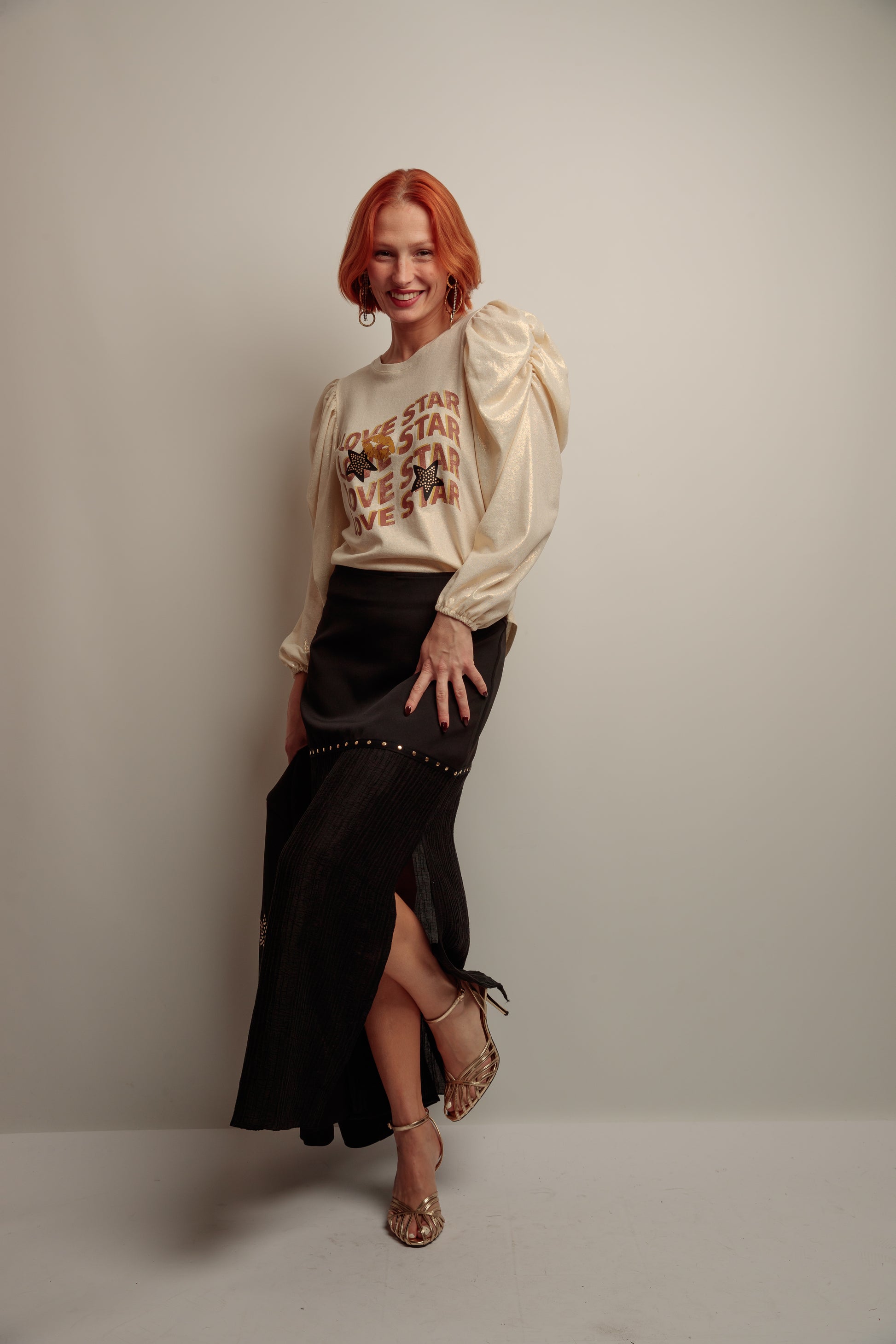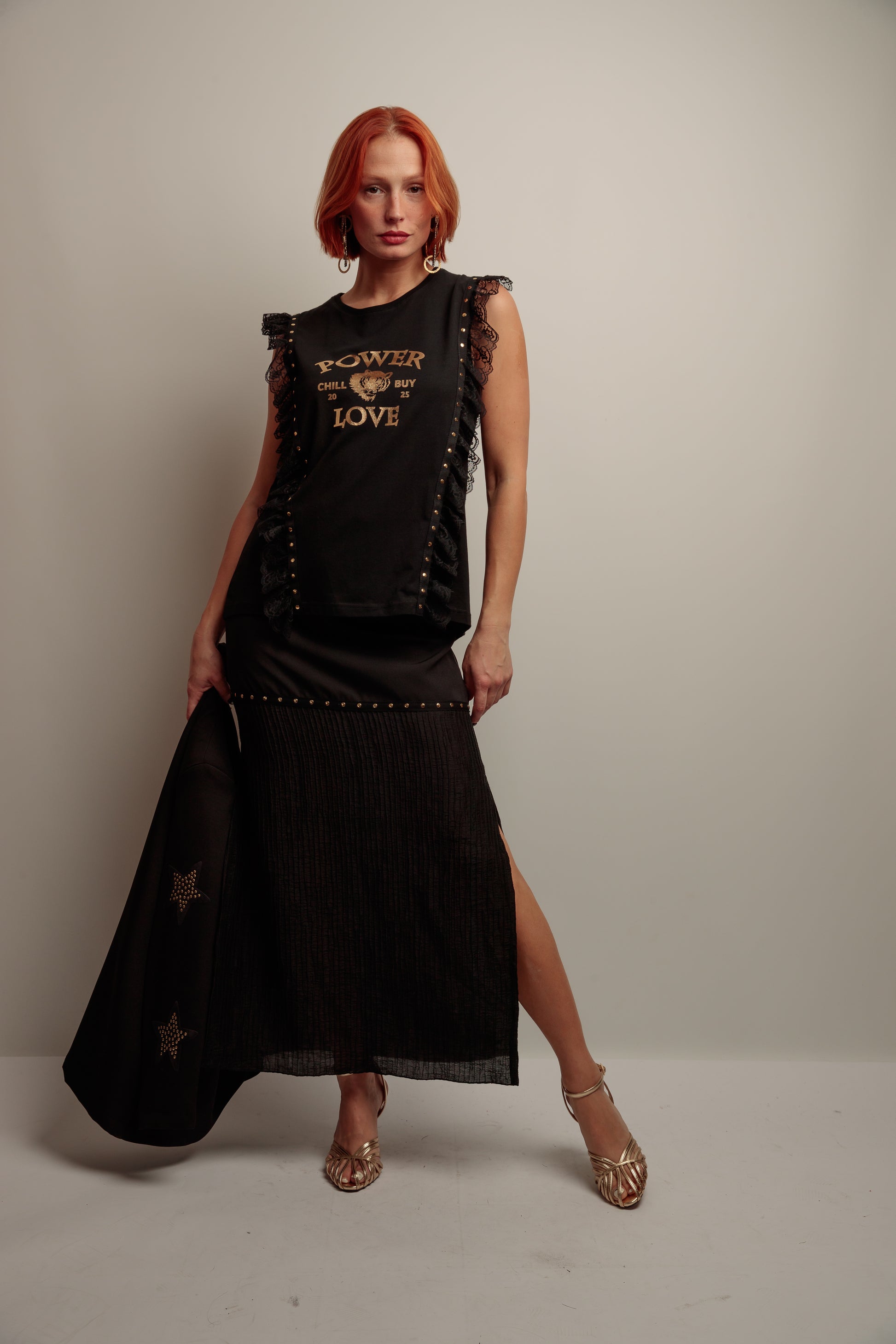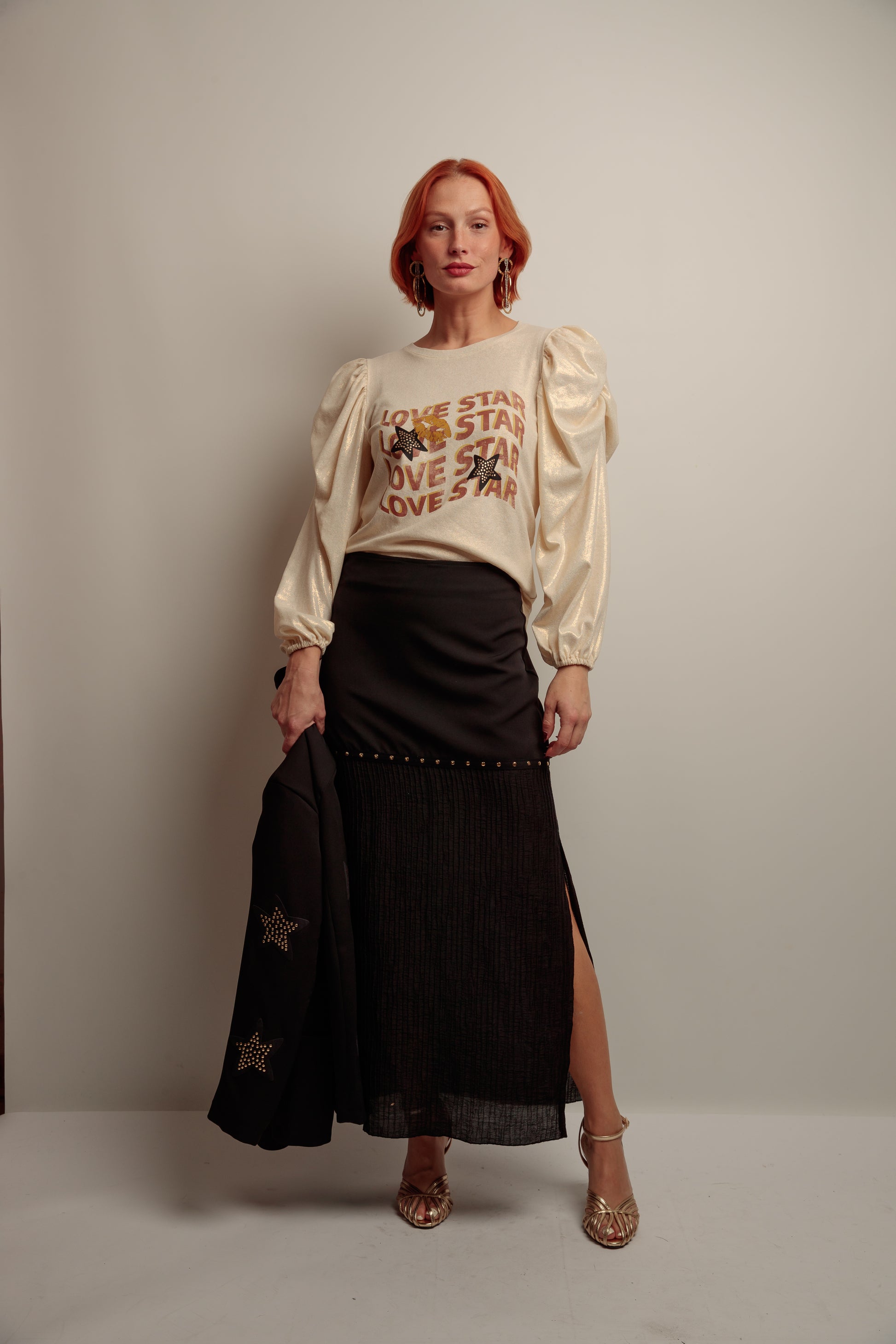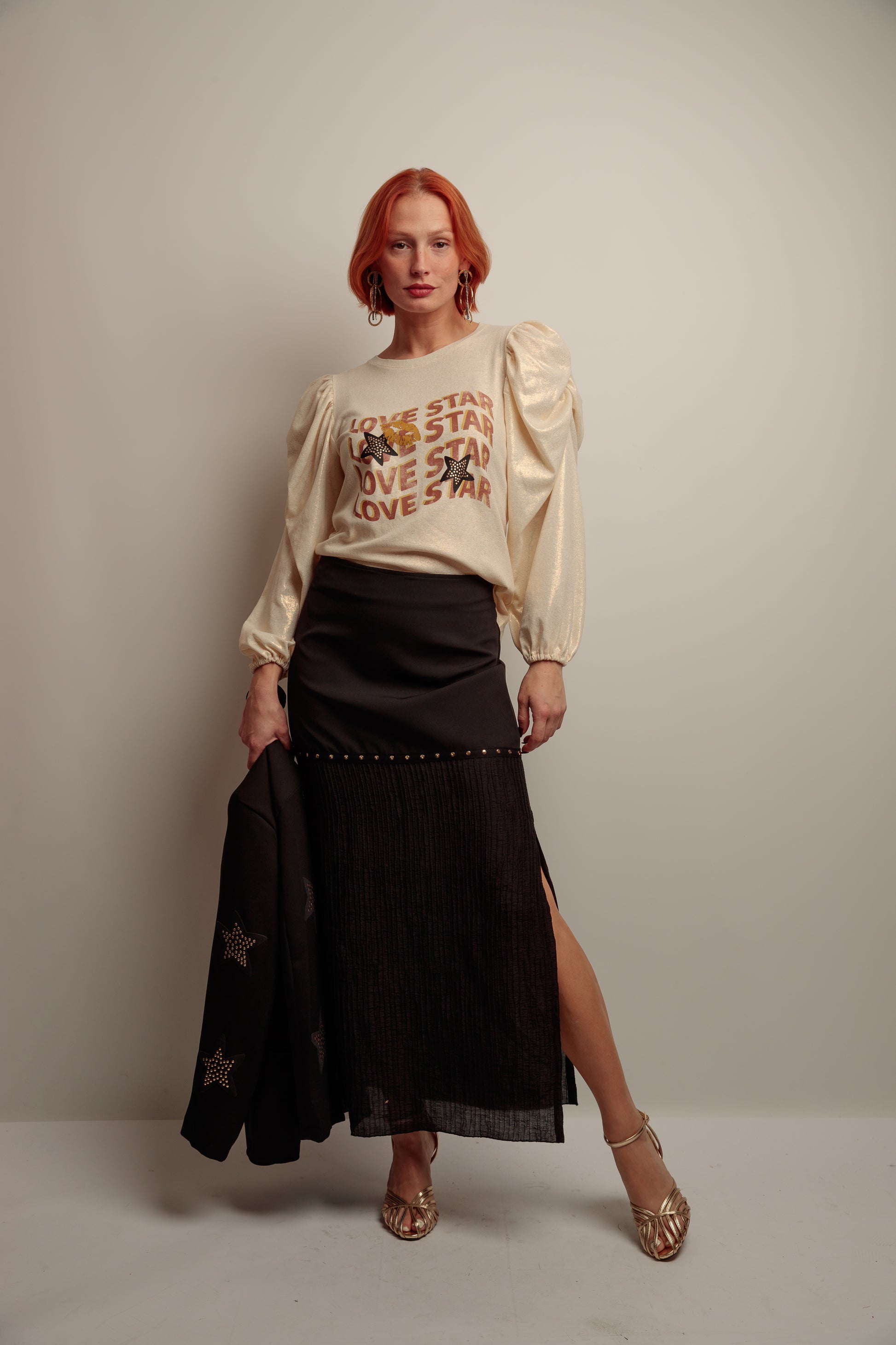 Falda larga de mujer, tiro alto sin cinturilla, combinando dos tejidos, con aberturas laterales y con tira de tachuelas metálicas en color dorado en la costura de los tejidos. Confeccionada en Vigo.