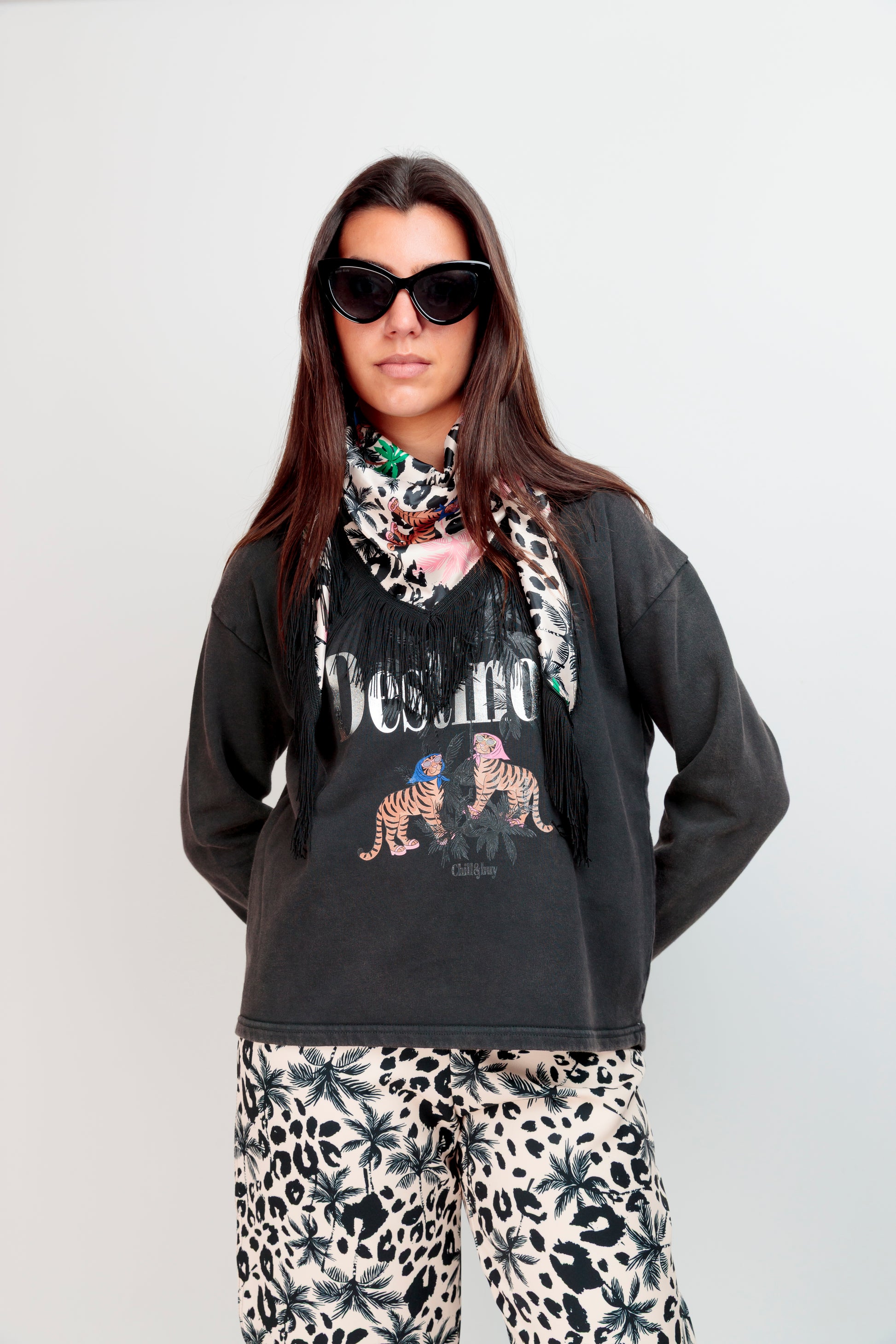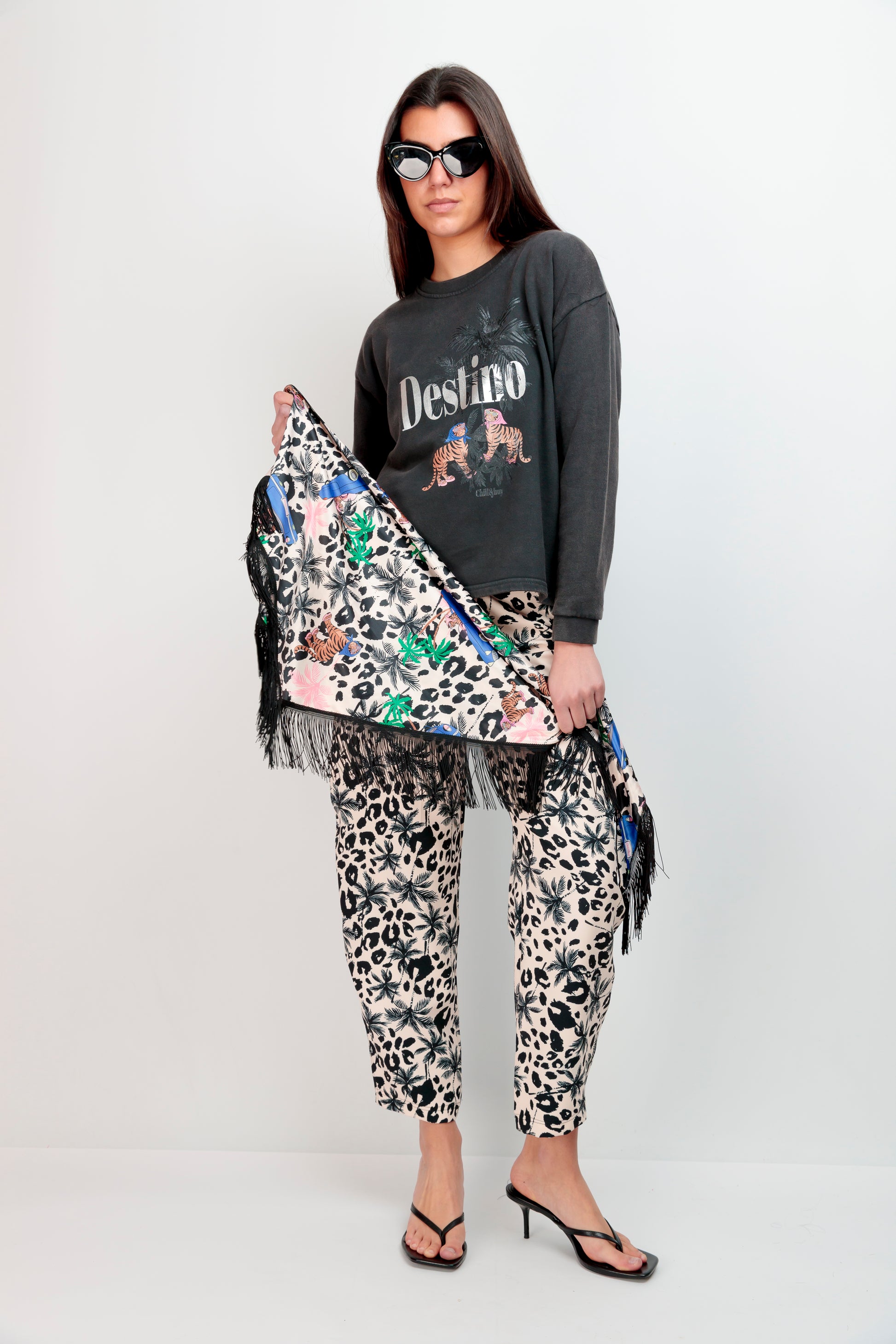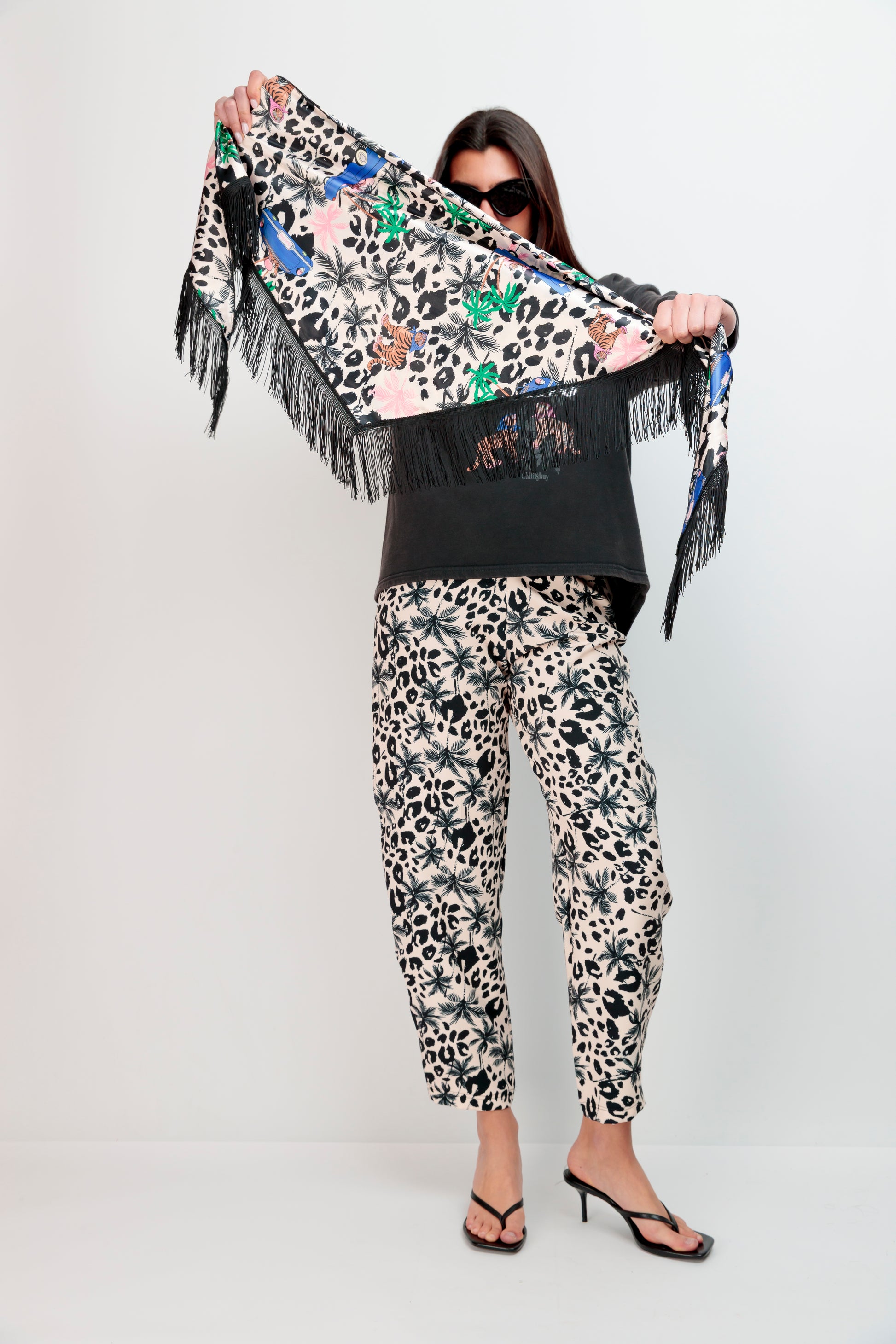 Pañuelo estampado con tejido principal satinado Acabados con tira de flecos negros en color negro.