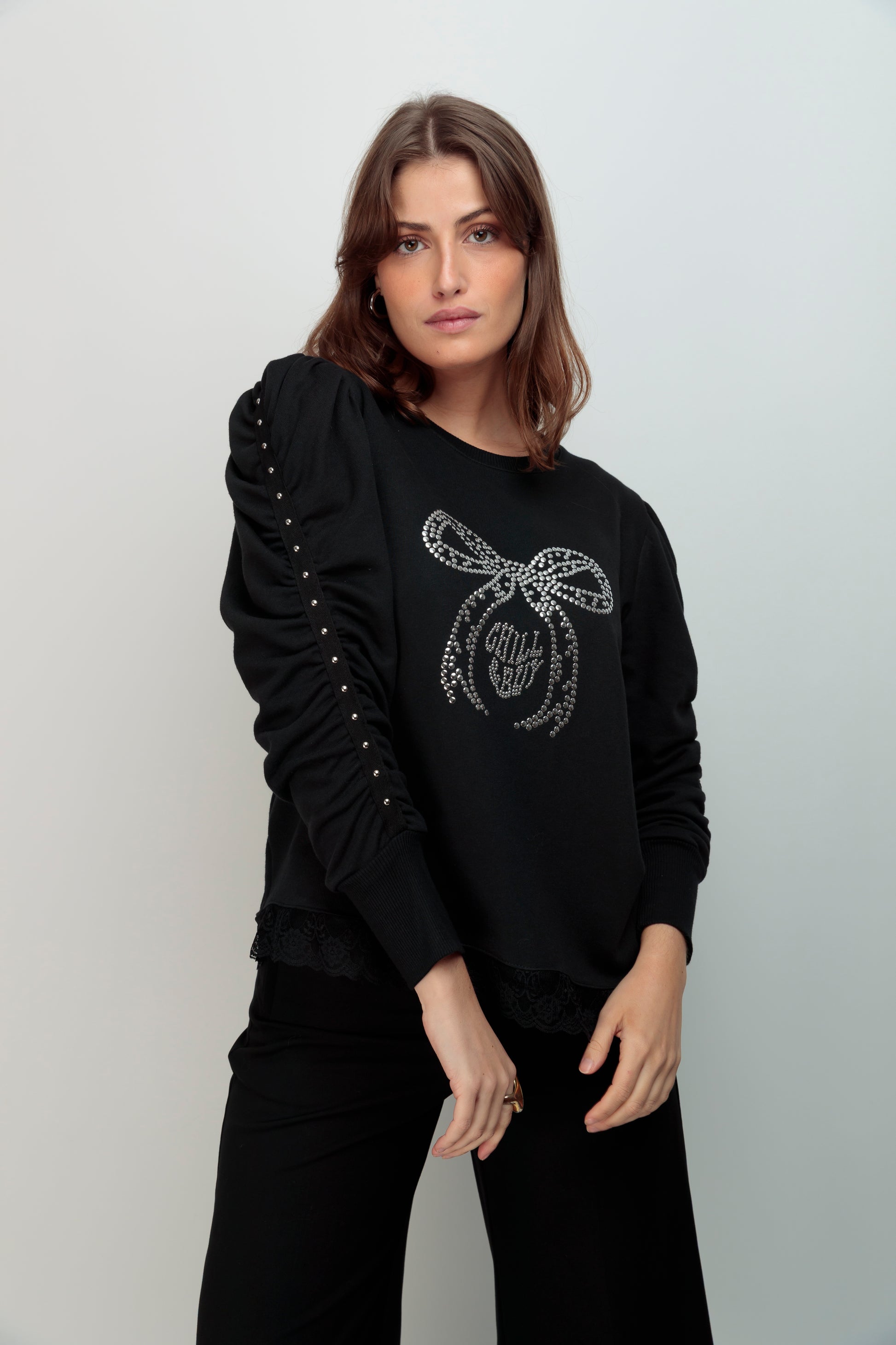 Sudadera de algodón con cuello redondo y manga larga abullonada que combina comodidad con detalles de diseño editorial. Corte evasé con bajo asimétrico realzado por una tira de encaje negro y un lazo frontal en tachuelas plateadas. Las mangas presentan una tira de tachuelas metálicas en plata que añade un toque de sofisticación. Confeccionada en Vigo con atención al detalle y acabados de calidad premium.