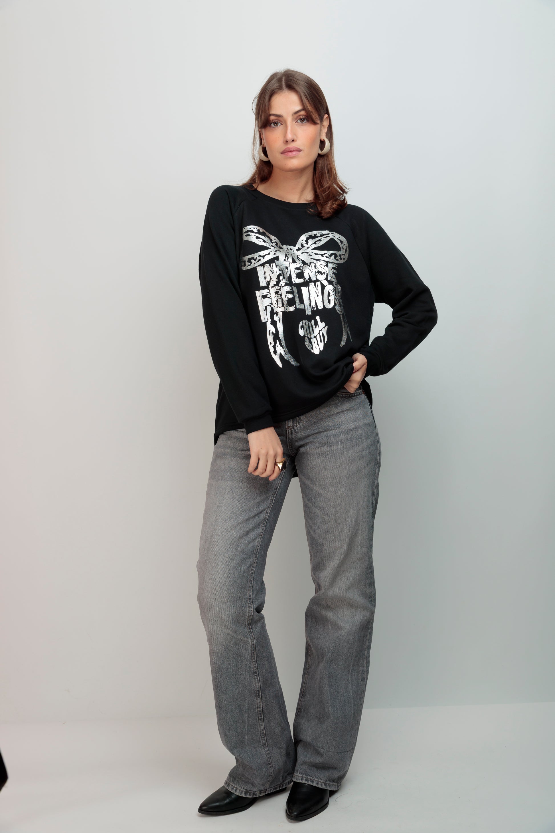 Sudadera de algodón puro con cuello redondo que combina comodidad y diseño contemporáneo. Destaca por sus mangas raglán que ofrecen libertad de movimiento y un bajo asimétrico que añade dinamismo a la silueta. El diseño frontal en plateado aporta un toque editorial y sofisticado, perfecto para crear looks versátiles que transitan del día a la noche. Prenda versátil que se adapta a cualquier estilo personal.