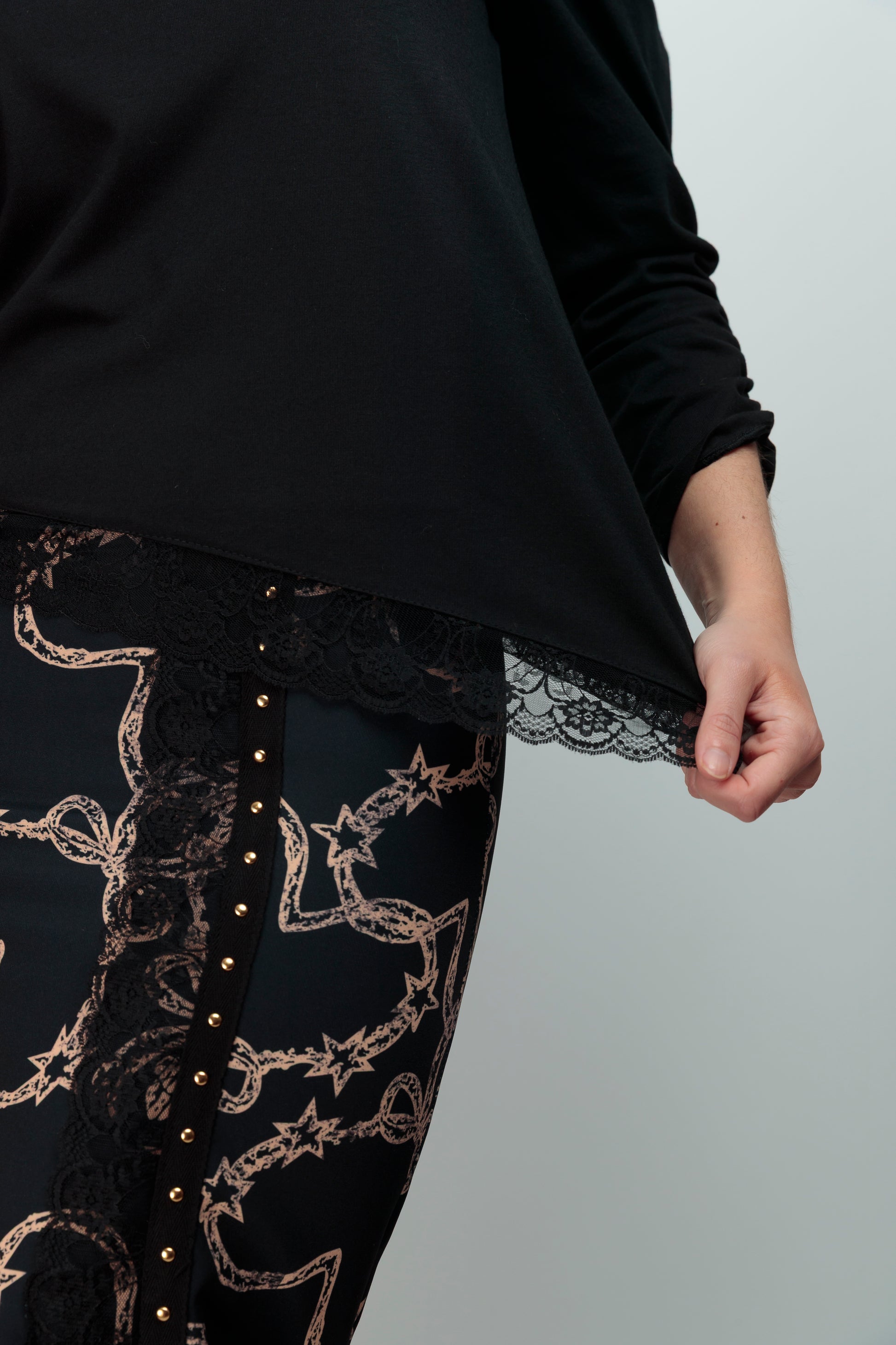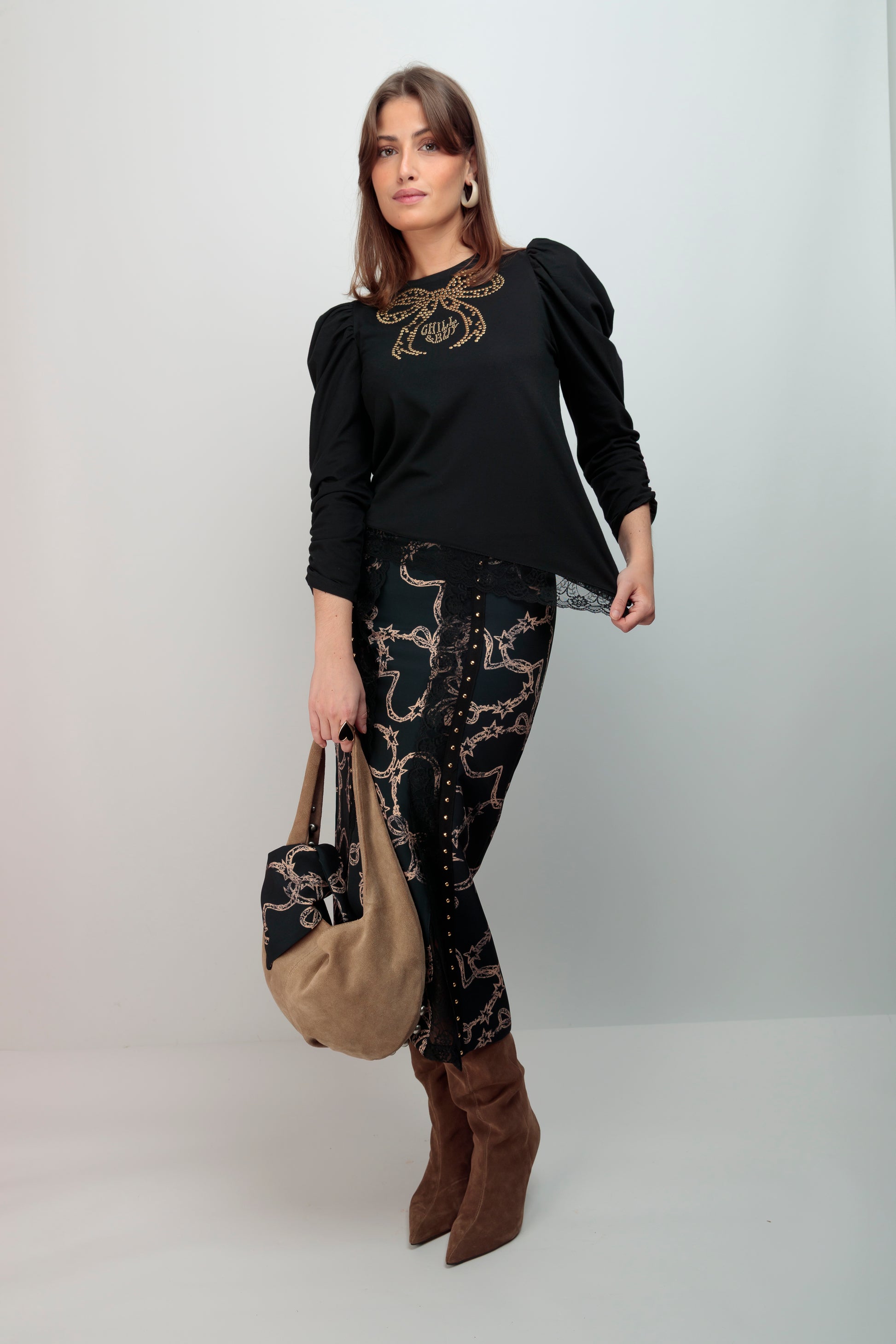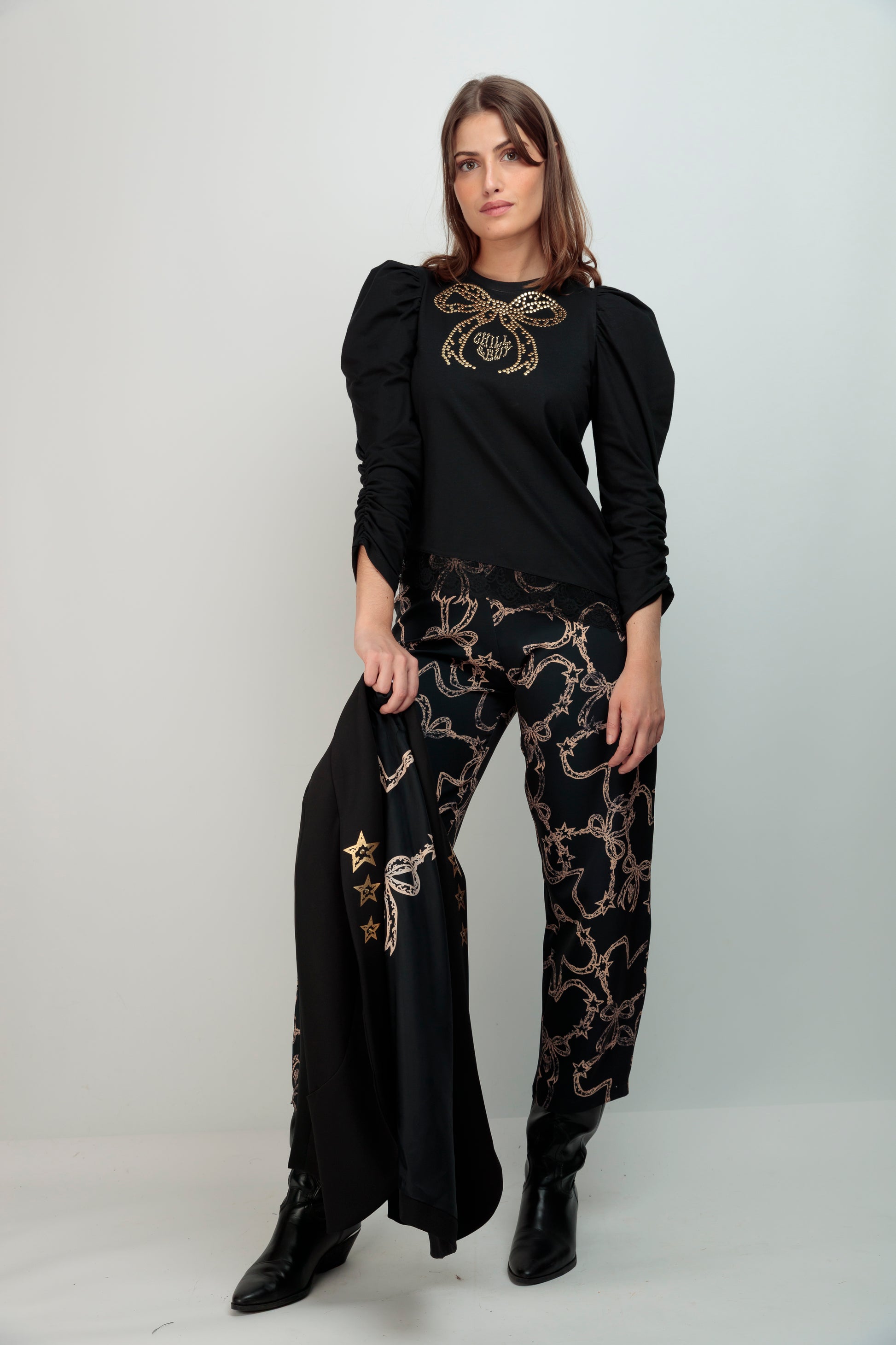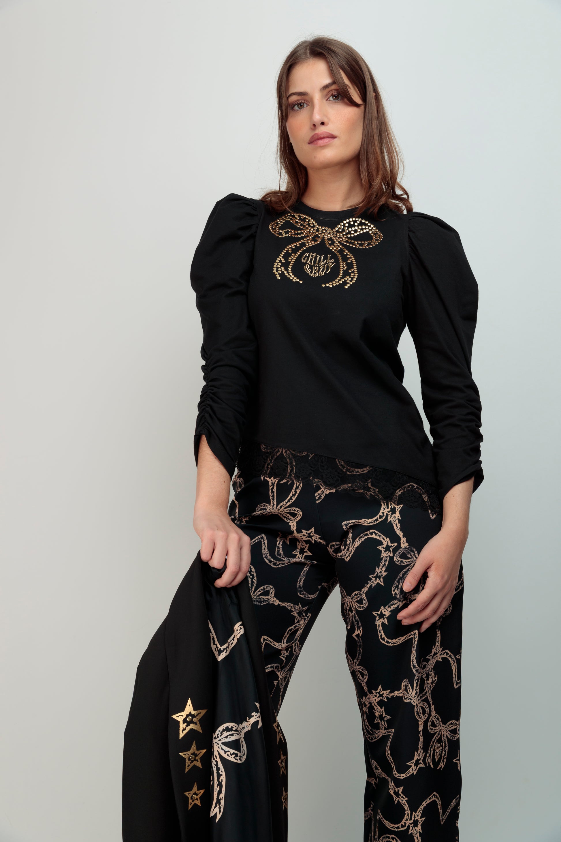 El Top Lupita Lazo Tachas es una prenda versátil confeccionada en algodón de calidad en Vigo. Su cuello redondo y corte entallado proporciona un ajuste favorecededor, mientras que el bajo asimétrico rematado con encaje a tono añade sofisticación y movimiento. Las mangas largas abullonadas con fruncido en el brazo crean volumen estratégico que realza la figura. El distintivo lazo frontal adornado con tachuelas doradas aporta un detalle de carácter que eleva cualquier look, desde casual hasta más elaborado. Una pieza pensada para quien busca prendas con personalidad y calidad.