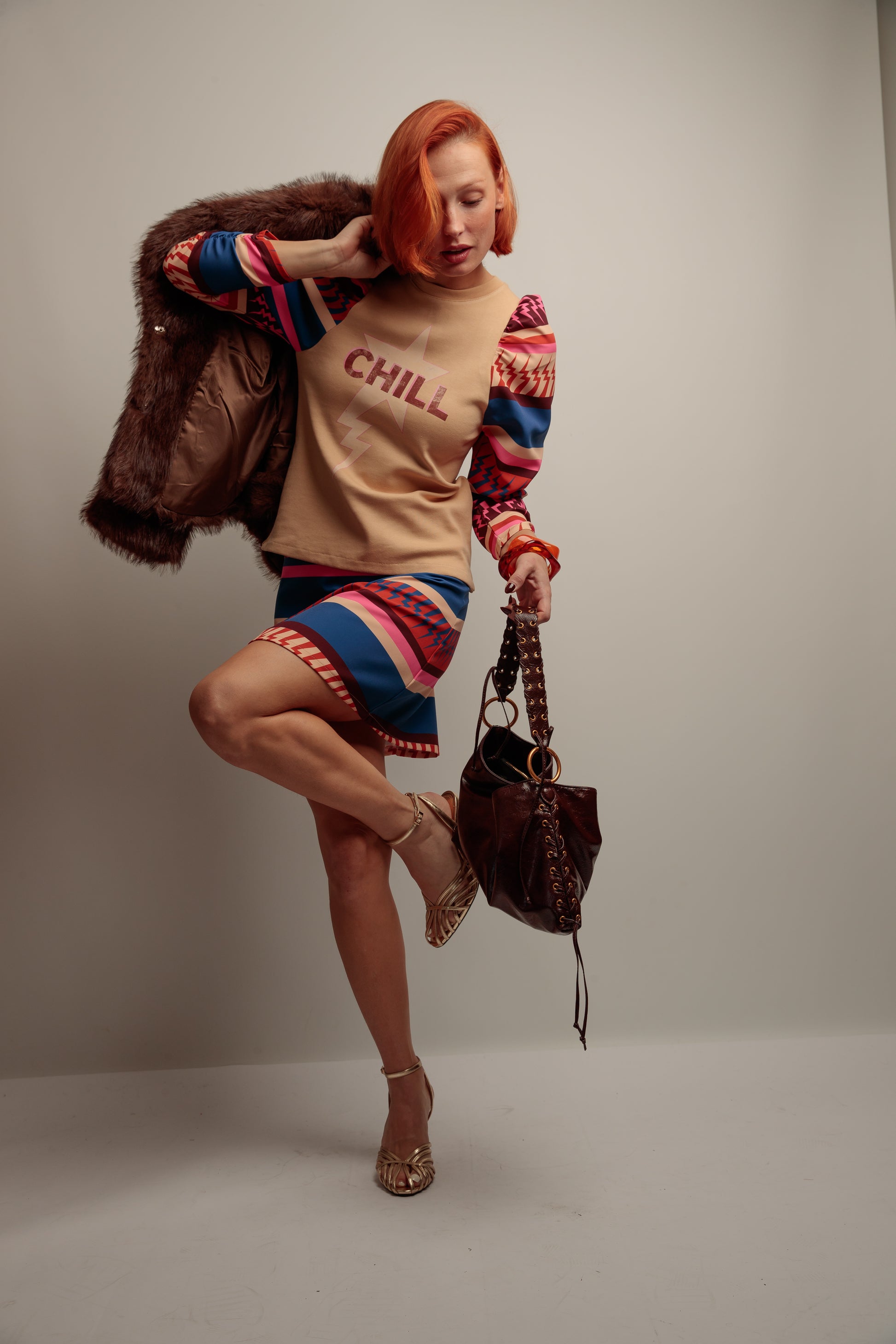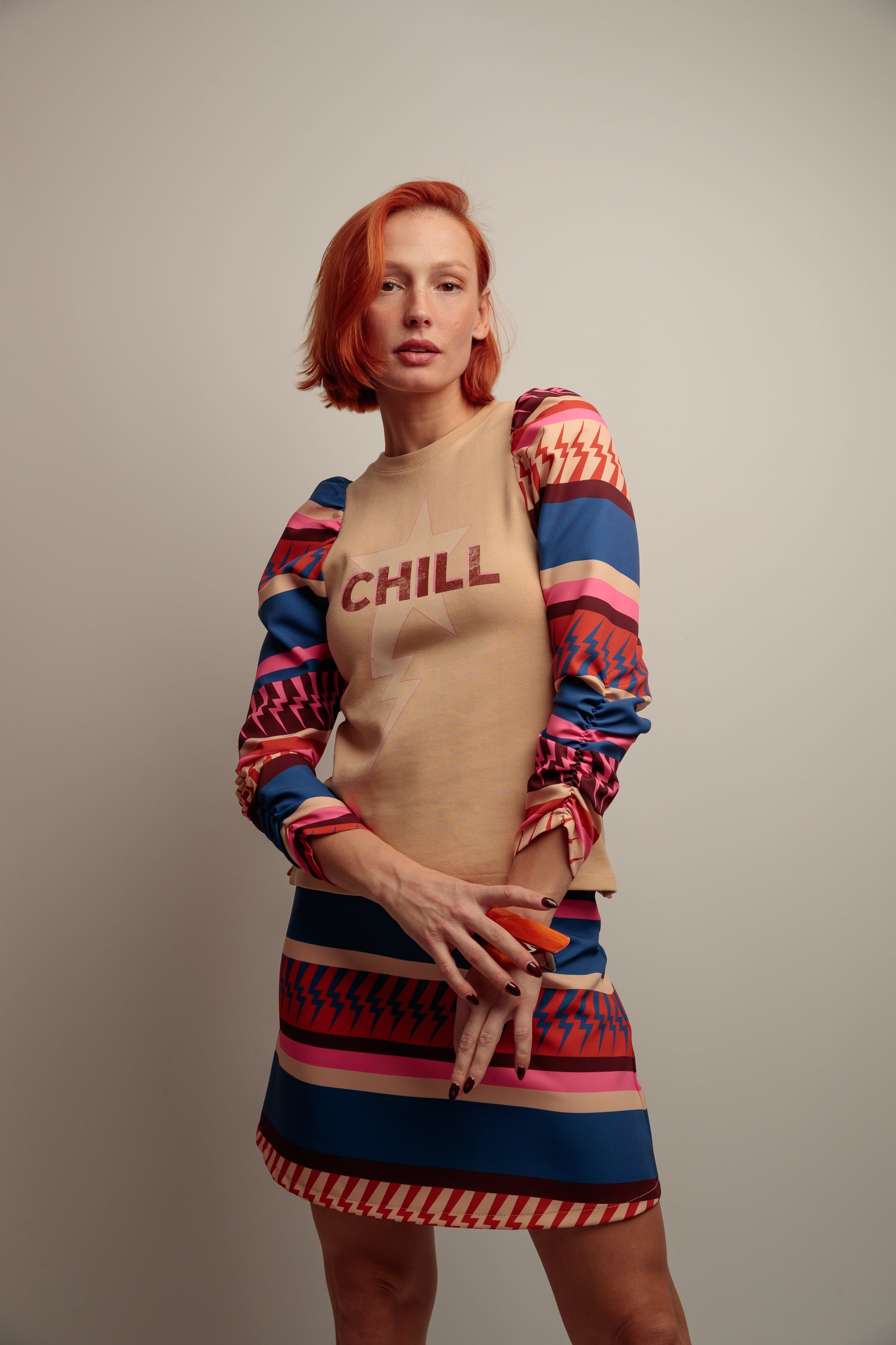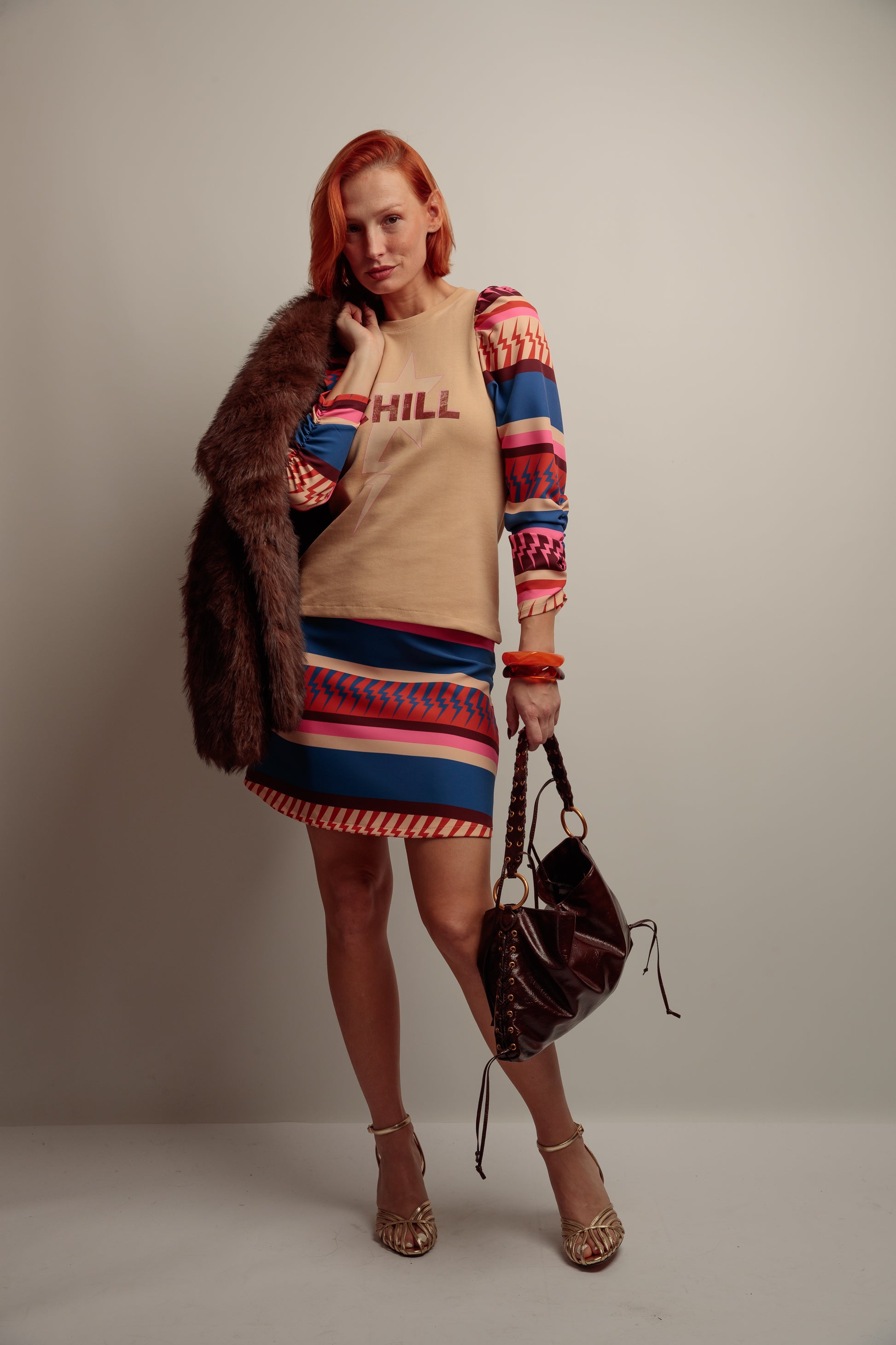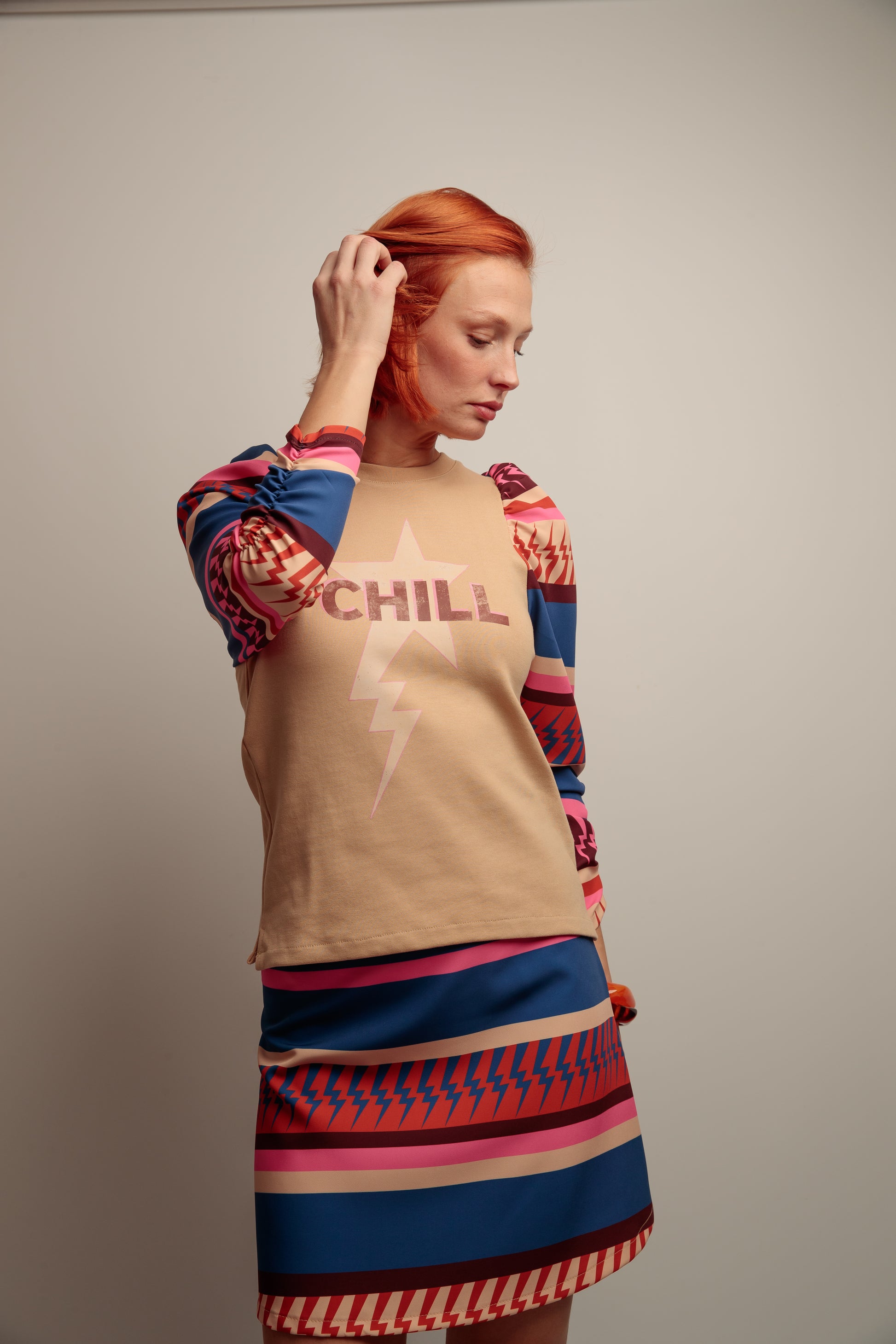 Top de cuello redondo entallado y acabados en rib a tono. Detalle de manga muy abullonada estampada a contrate. Estampación frontal.