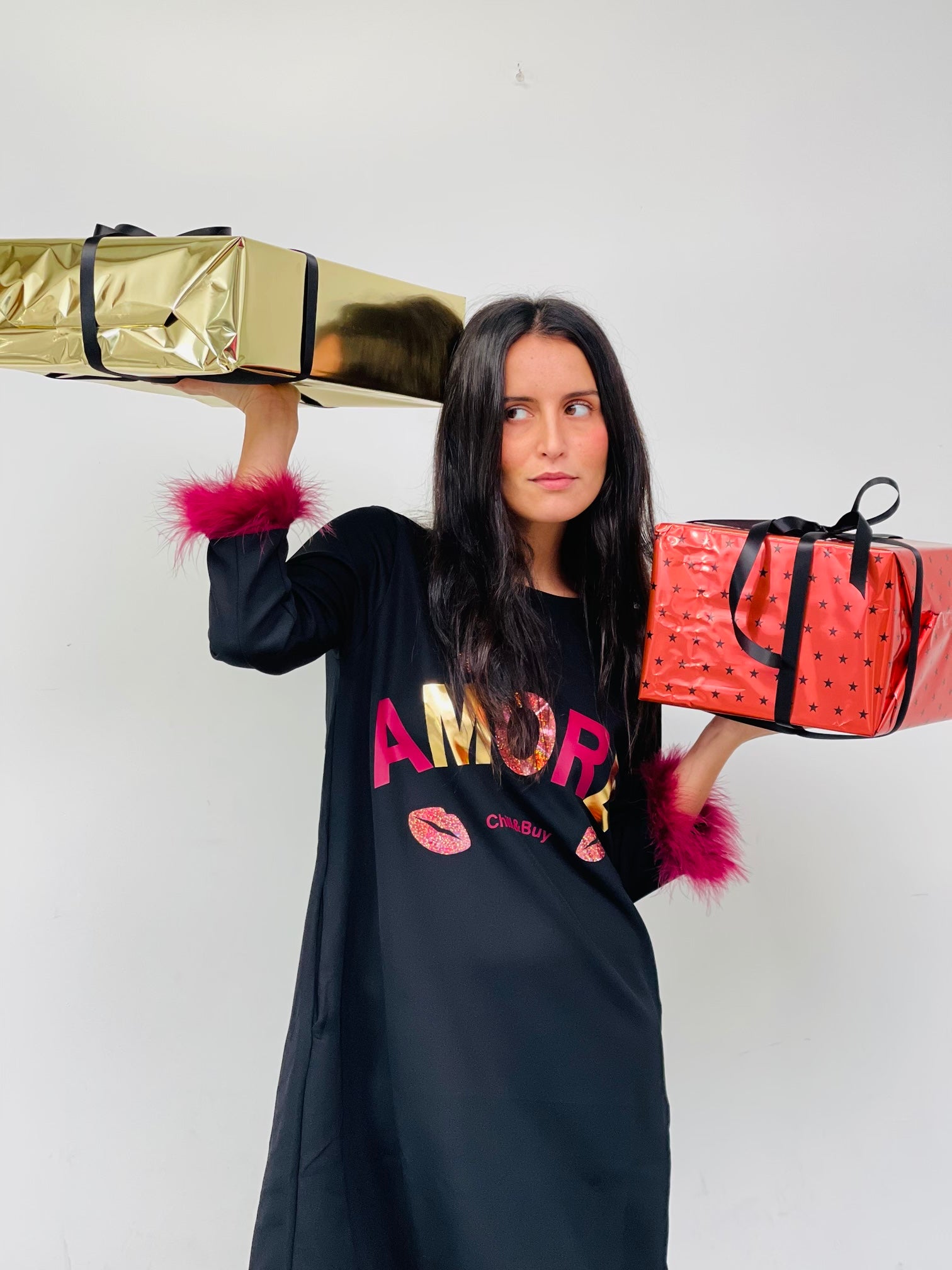 Vestido corto de mujer en color negro con cuello redondo, con bolsillos y manga larga. Cierre con cremallera oculta en la espalda. Detalle de marabú a contraste en puños y bajo. Confeccionado en tejido tipo crep con elastano. Made in Vigo.