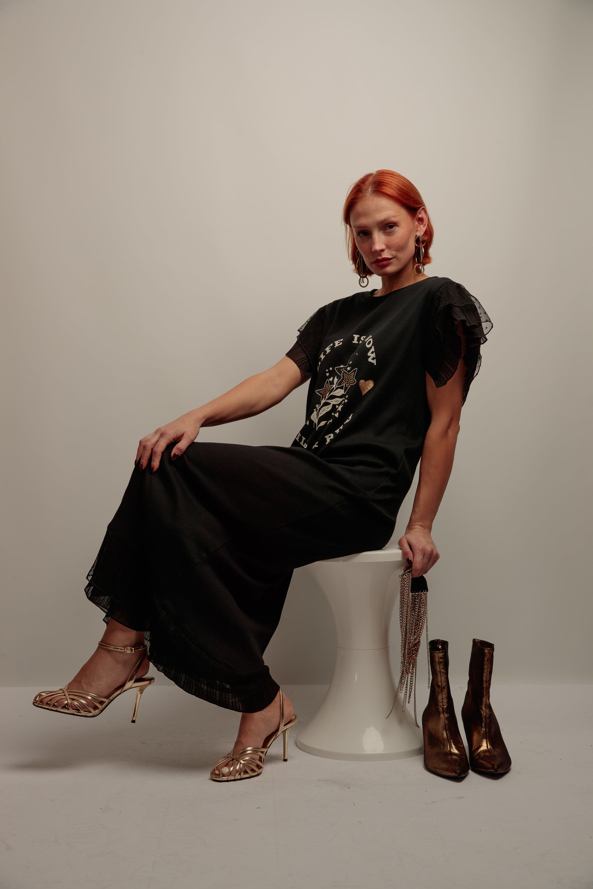 Vestido largo recto, con cuello redondo y abertura trasera. Confeccionado en tejido canalé en color negro. Detalle de volantes de tul doble en el hombro y en el bajo. Estampación frontal. Confeccionado en Vigo.